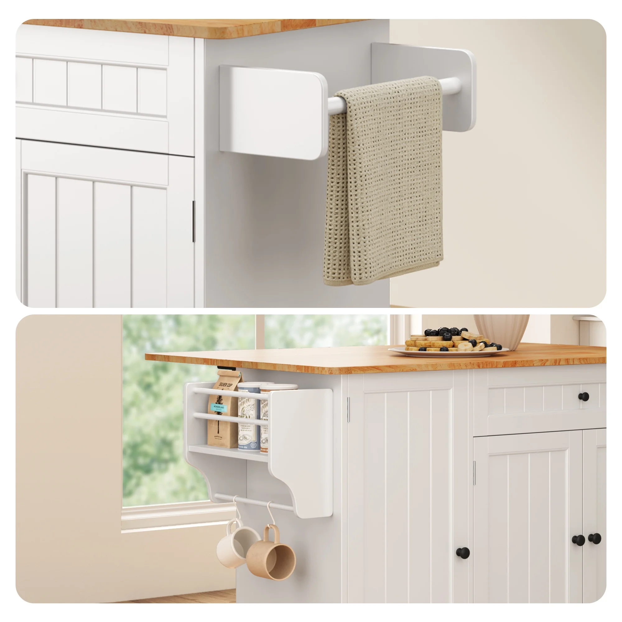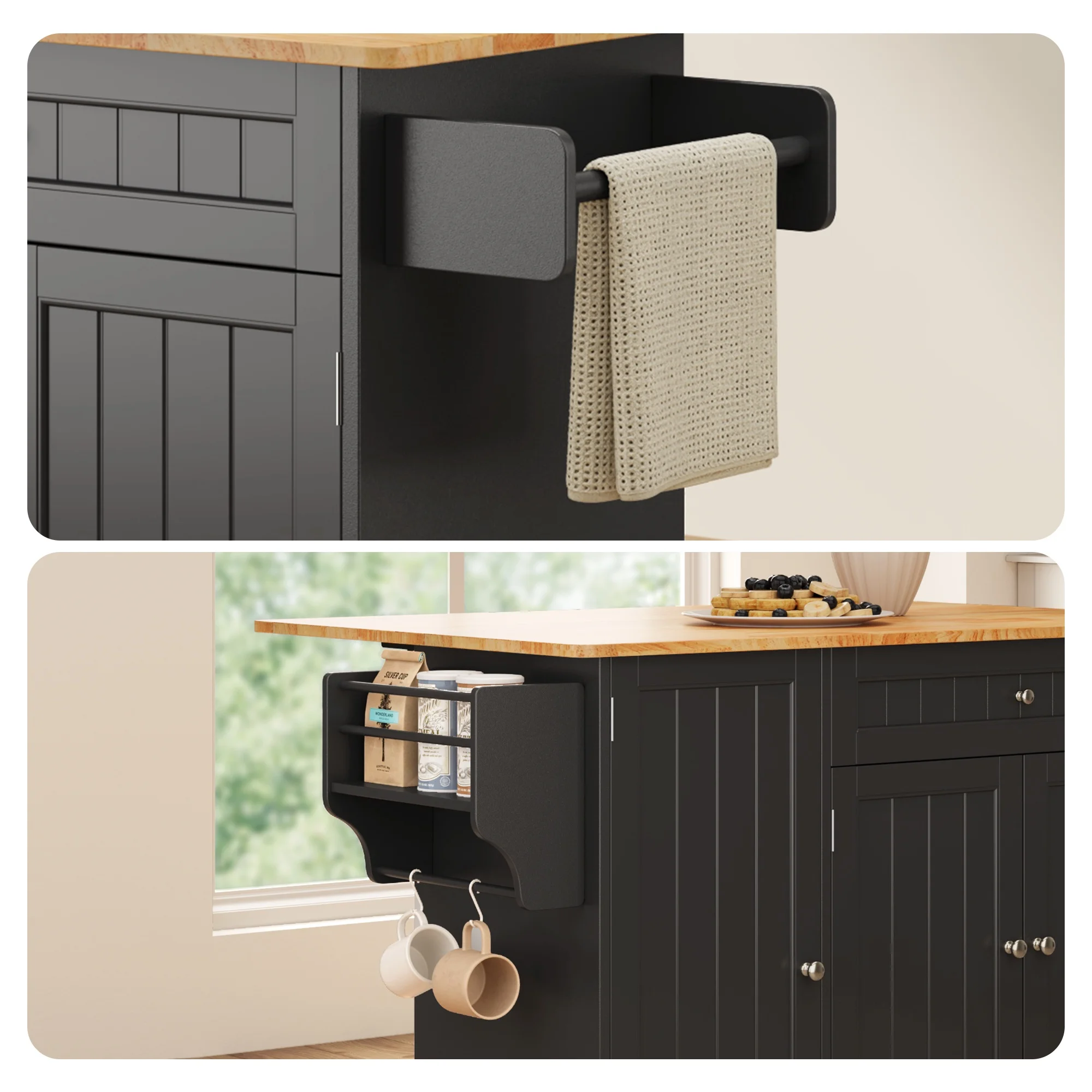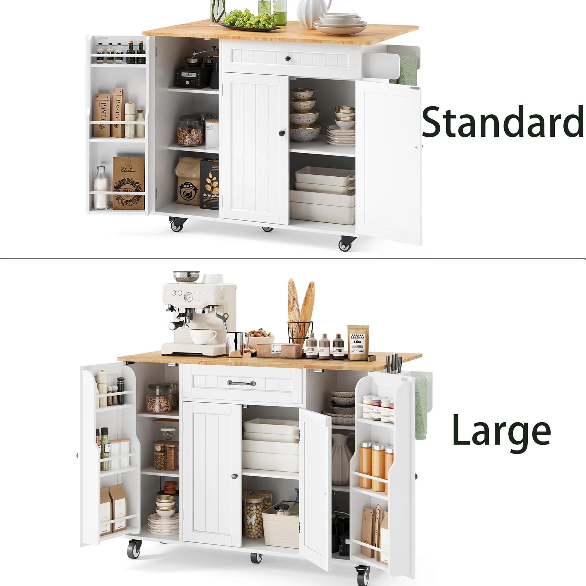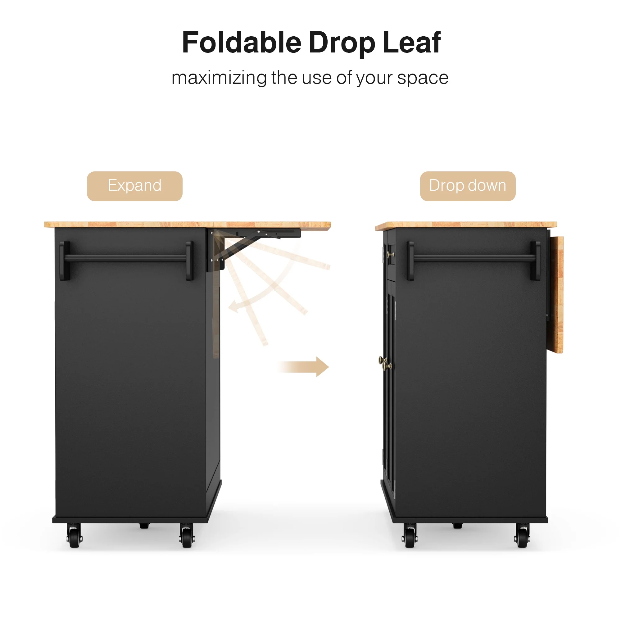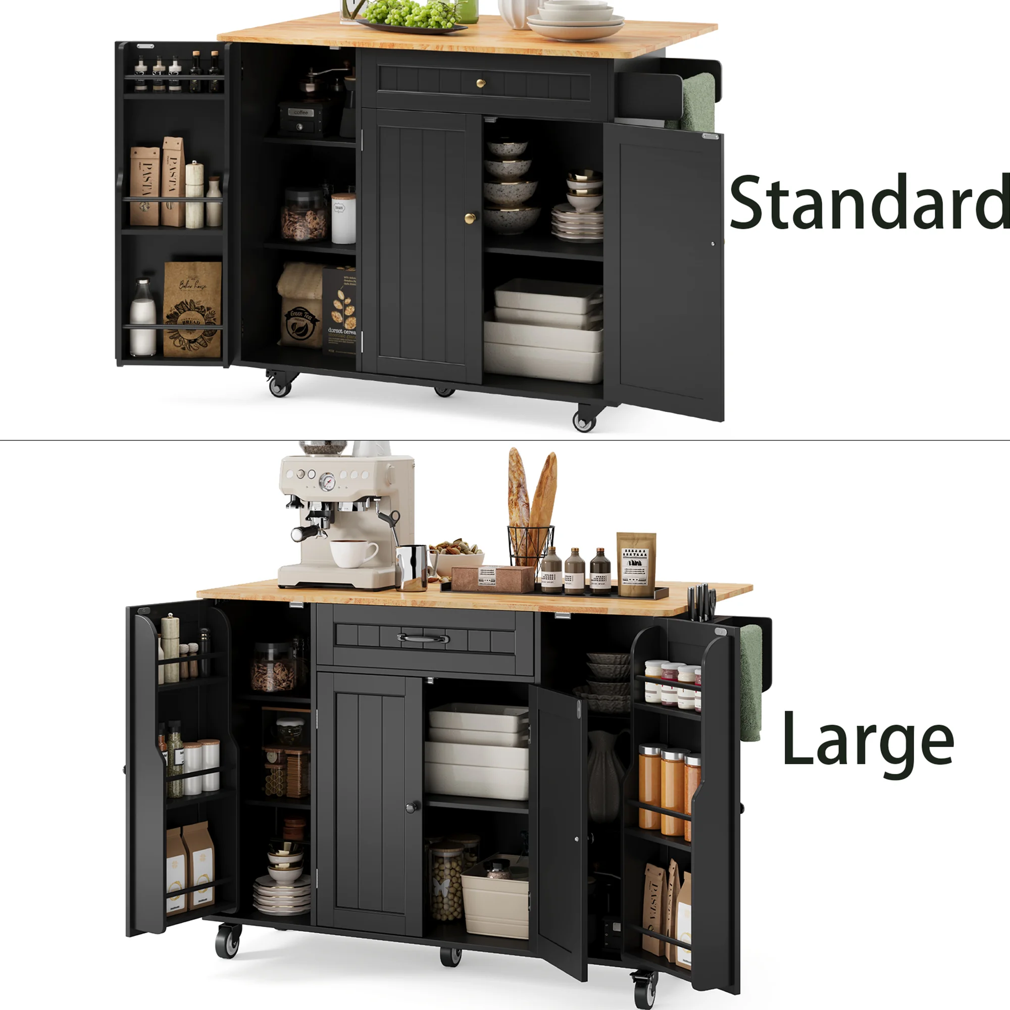 This Kitchen island not only provides ample storage with its 2-tier and 3-tier cabinets but also features a solid wood countertop that expands from 17.7" to 29.5" with a simple drop leaf, offering more room for meal prep or dining. The towel bar and spice rack are easy to access and can be assembled based on your needs. Plus, the 5-wheel design (with 2 locking brakes) ensures easy mobility and stability, while the sturdy construction guarantees long-lasting durability.