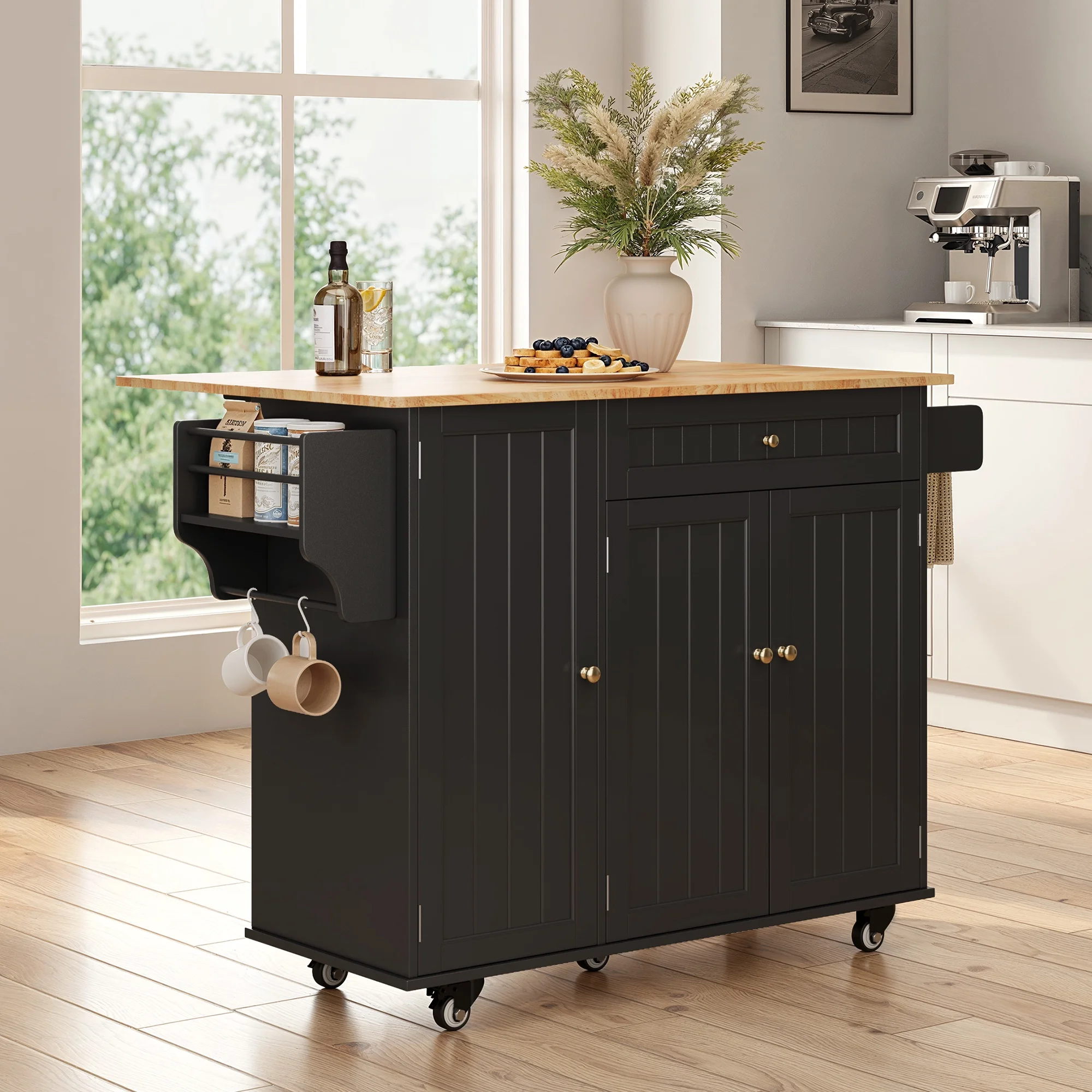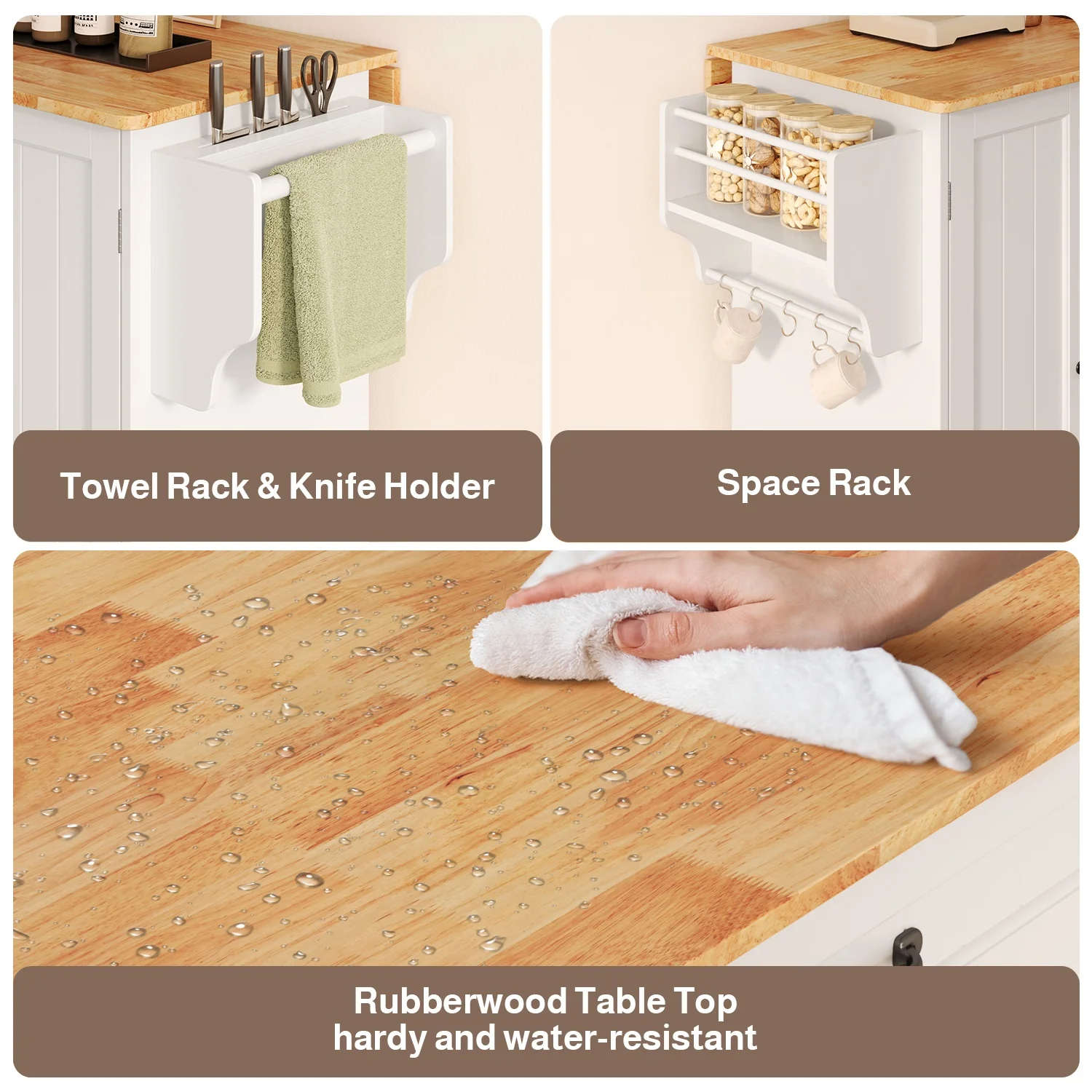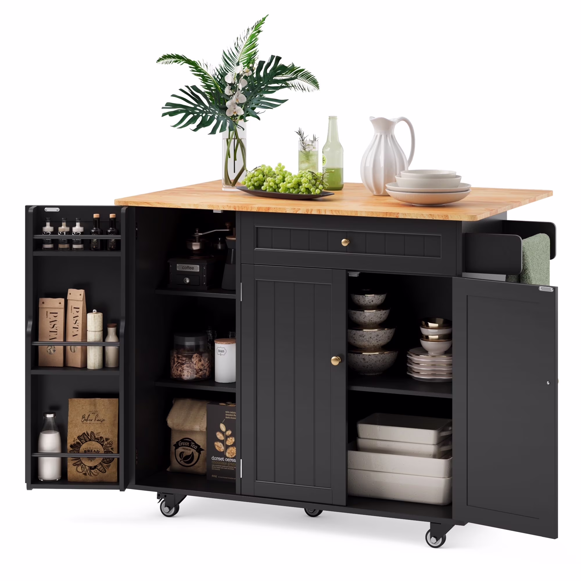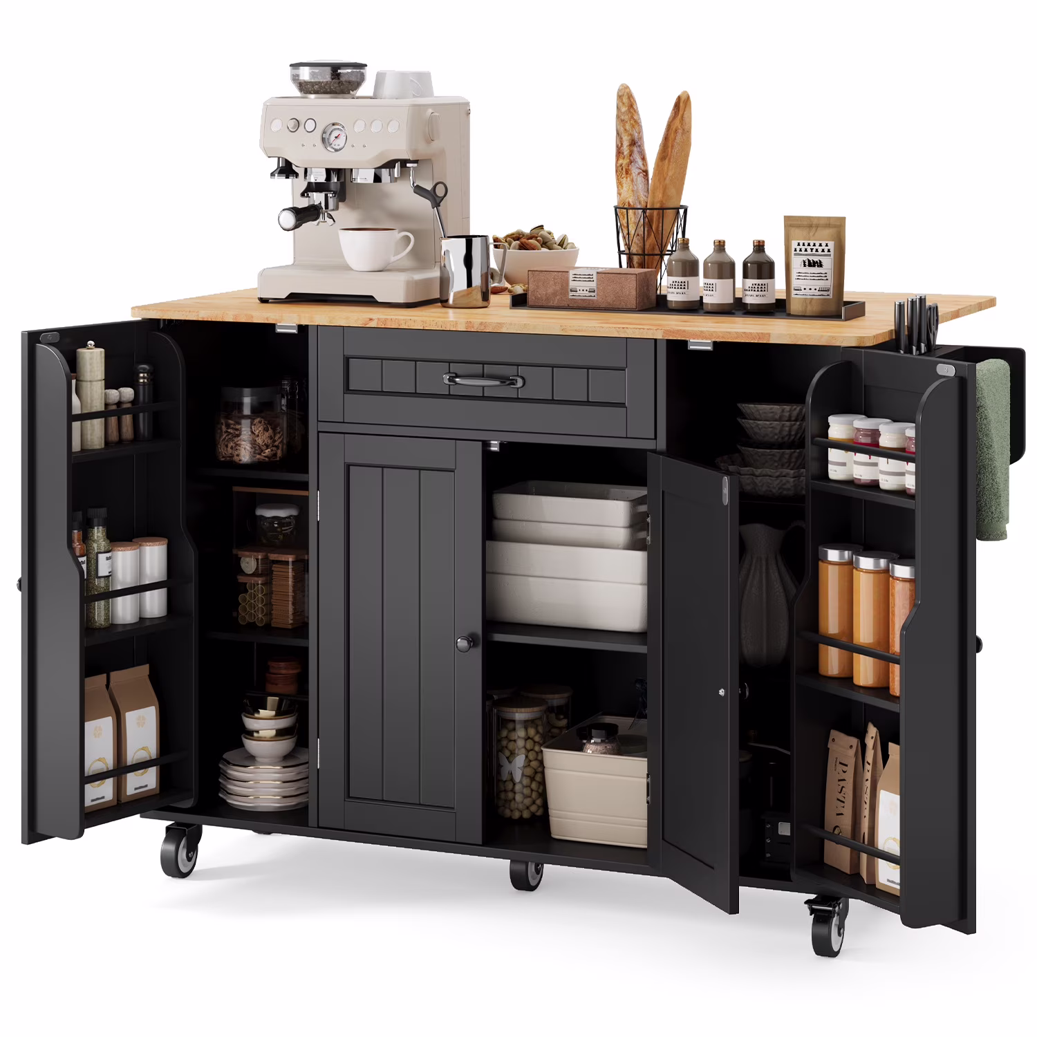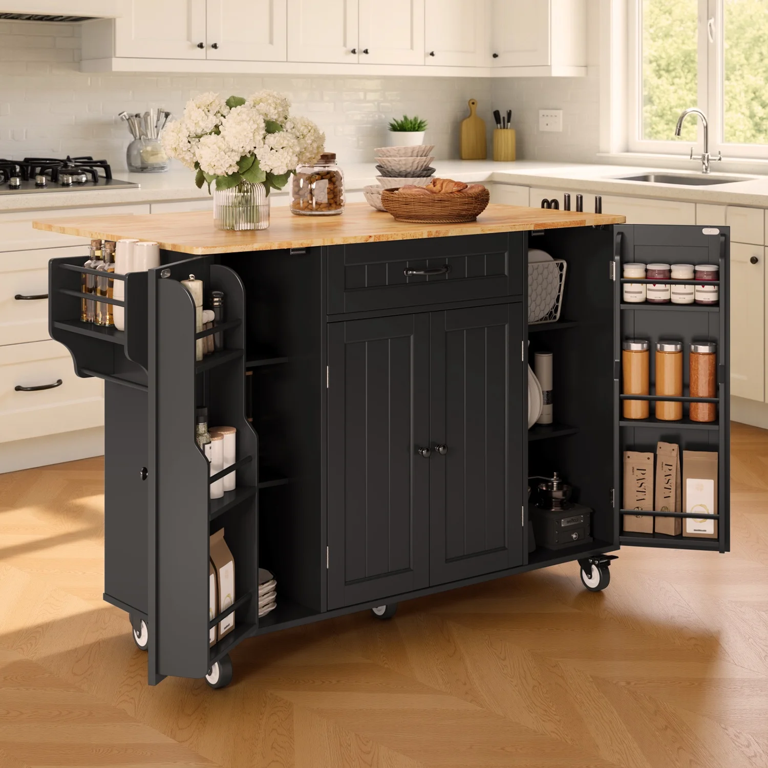 This Kitchen island not only provides ample storage with its 2-tier and 3-tier cabinets but also features a solid wood countertop that expands from 17.7" to 29.5" with a simple drop leaf, offering more room for meal prep or dining. The towel bar and spice rack are easy to access and can be assembled based on your needs. Plus, the 5-wheel design (with 2 locking brakes) ensures easy mobility and stability, while the sturdy construction guarantees long-lasting durability.