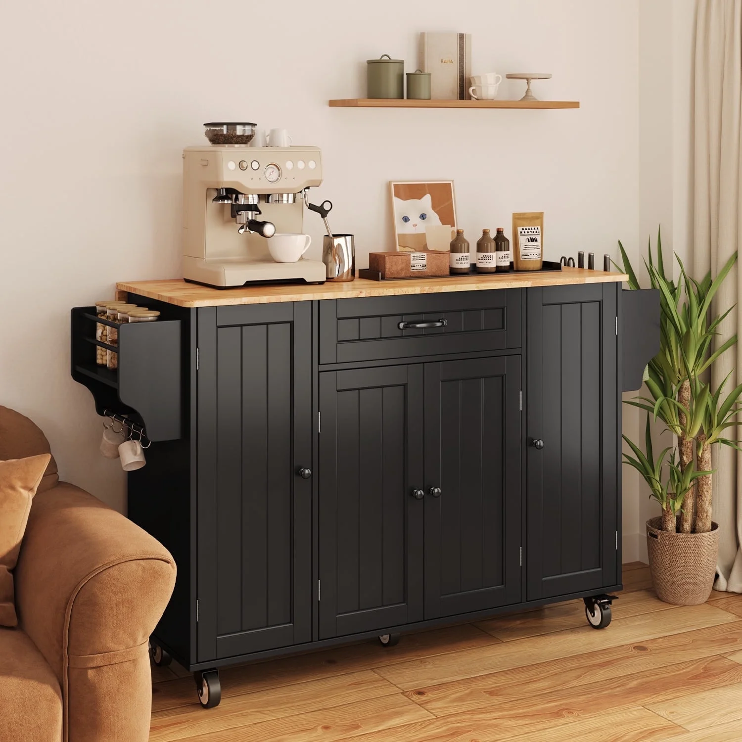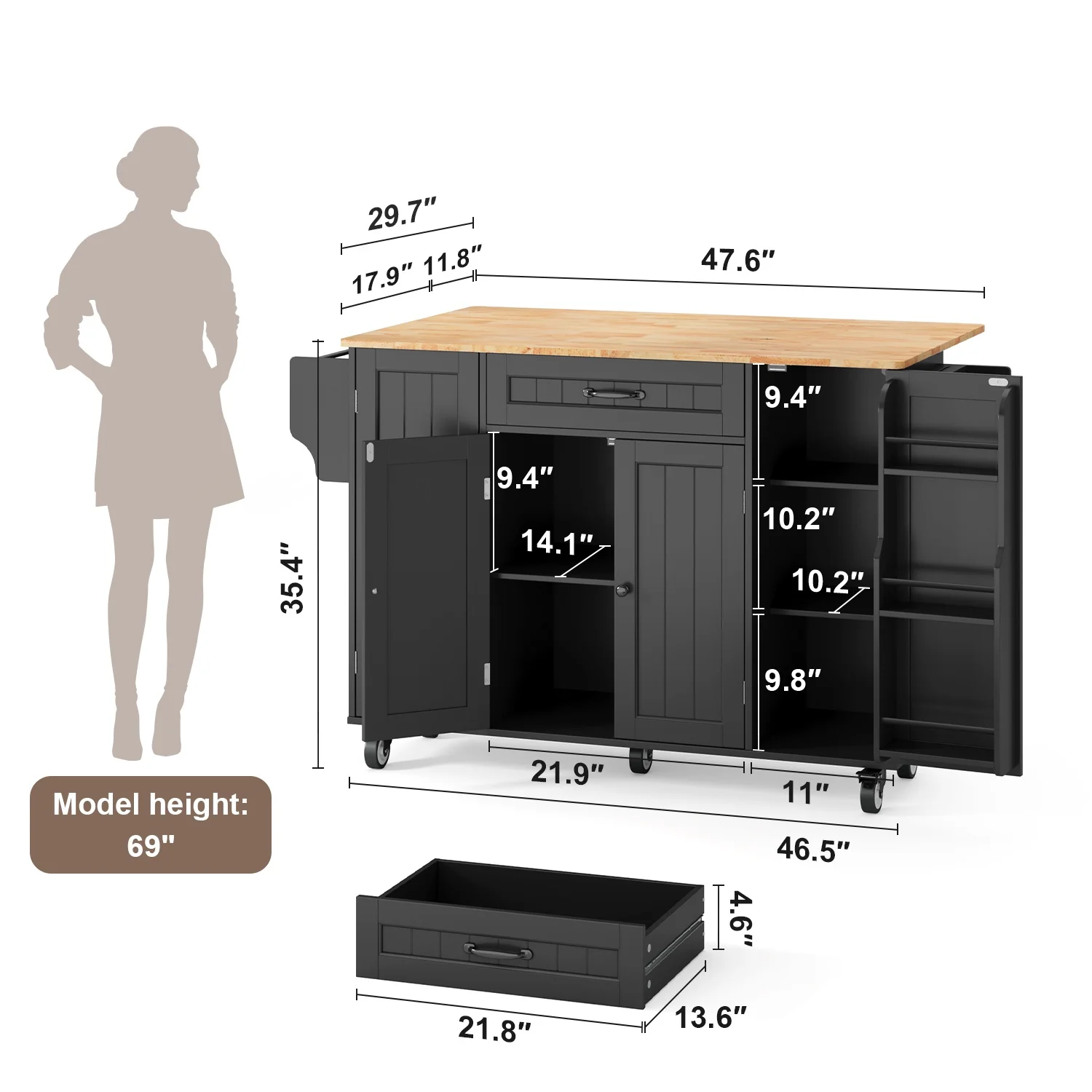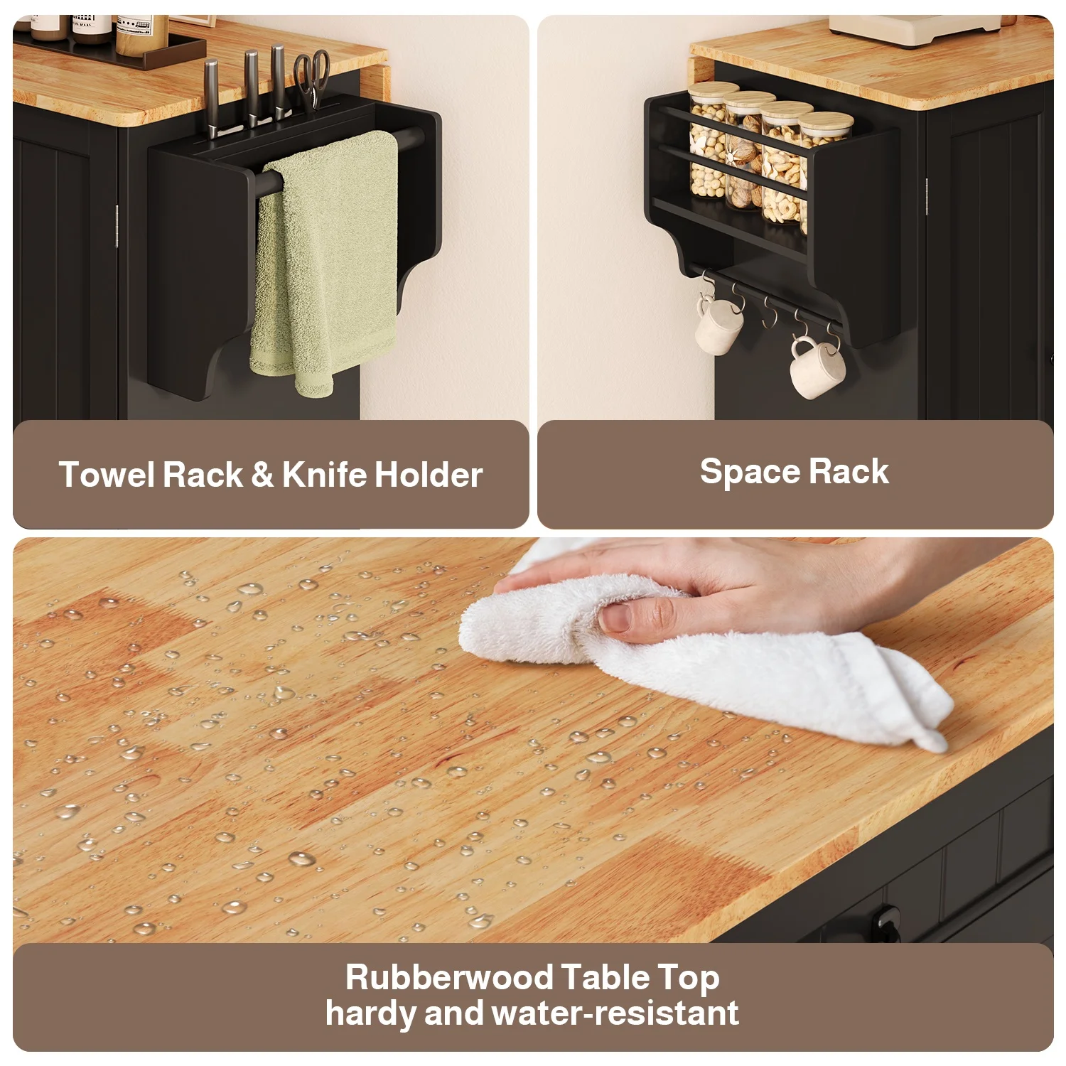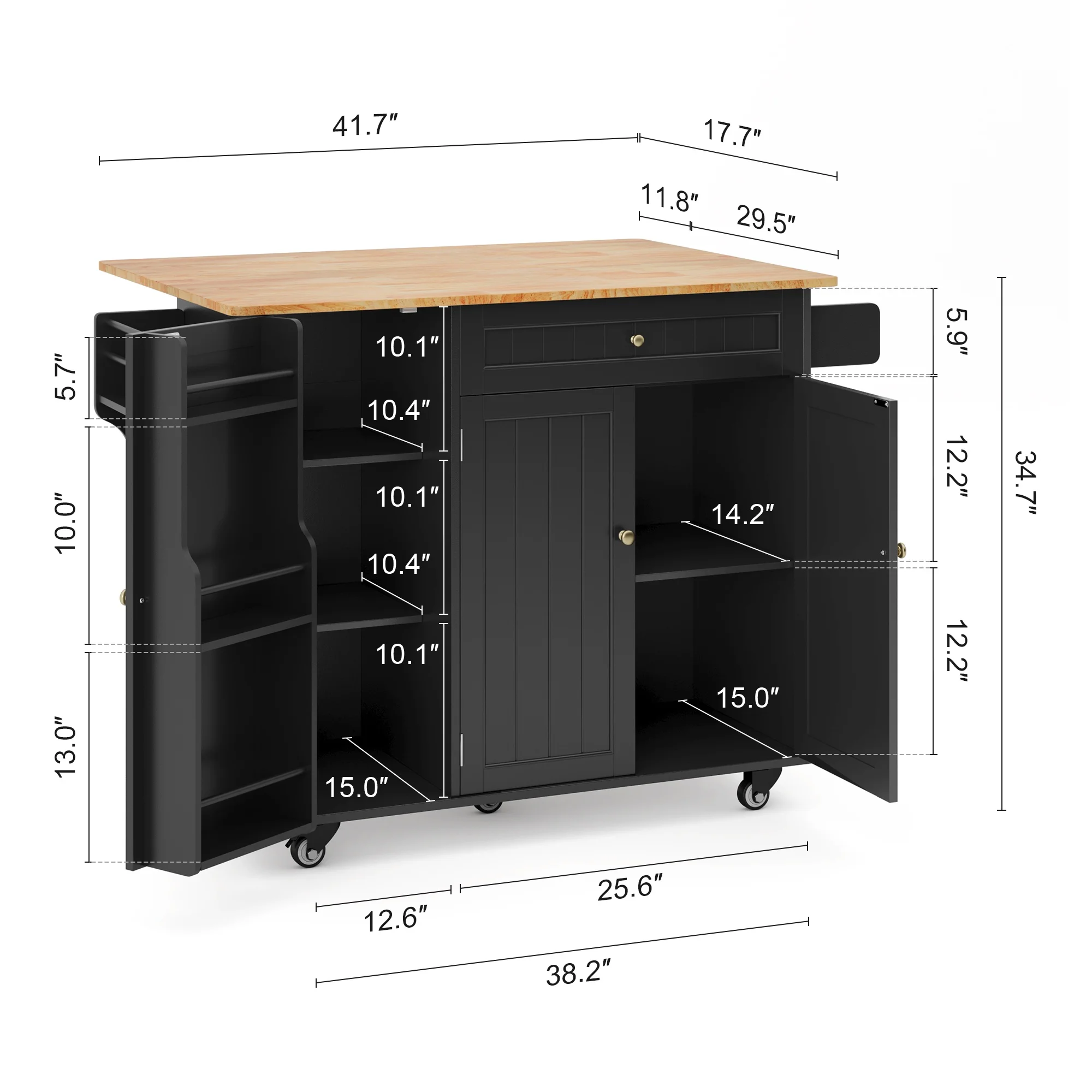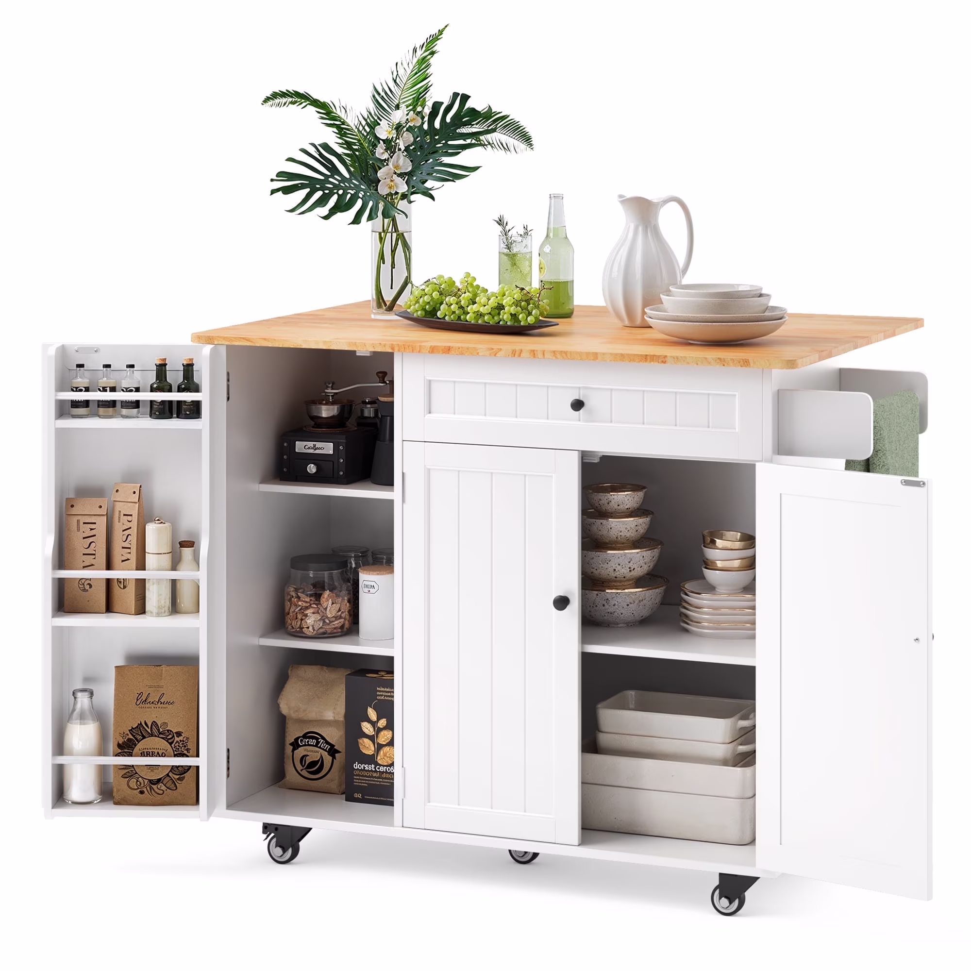 This Kitchen island not only provides ample storage with its 2-tier and 3-tier cabinets but also features a solid wood countertop that expands from 17.7" to 29.5" with a simple drop leaf, offering more room for meal prep or dining. The towel bar and spice rack are easy to access and can be assembled based on your needs. Plus, the 5-wheel design (with 2 locking brakes) ensures easy mobility and stability, while the sturdy construction guarantees long-lasting durability.