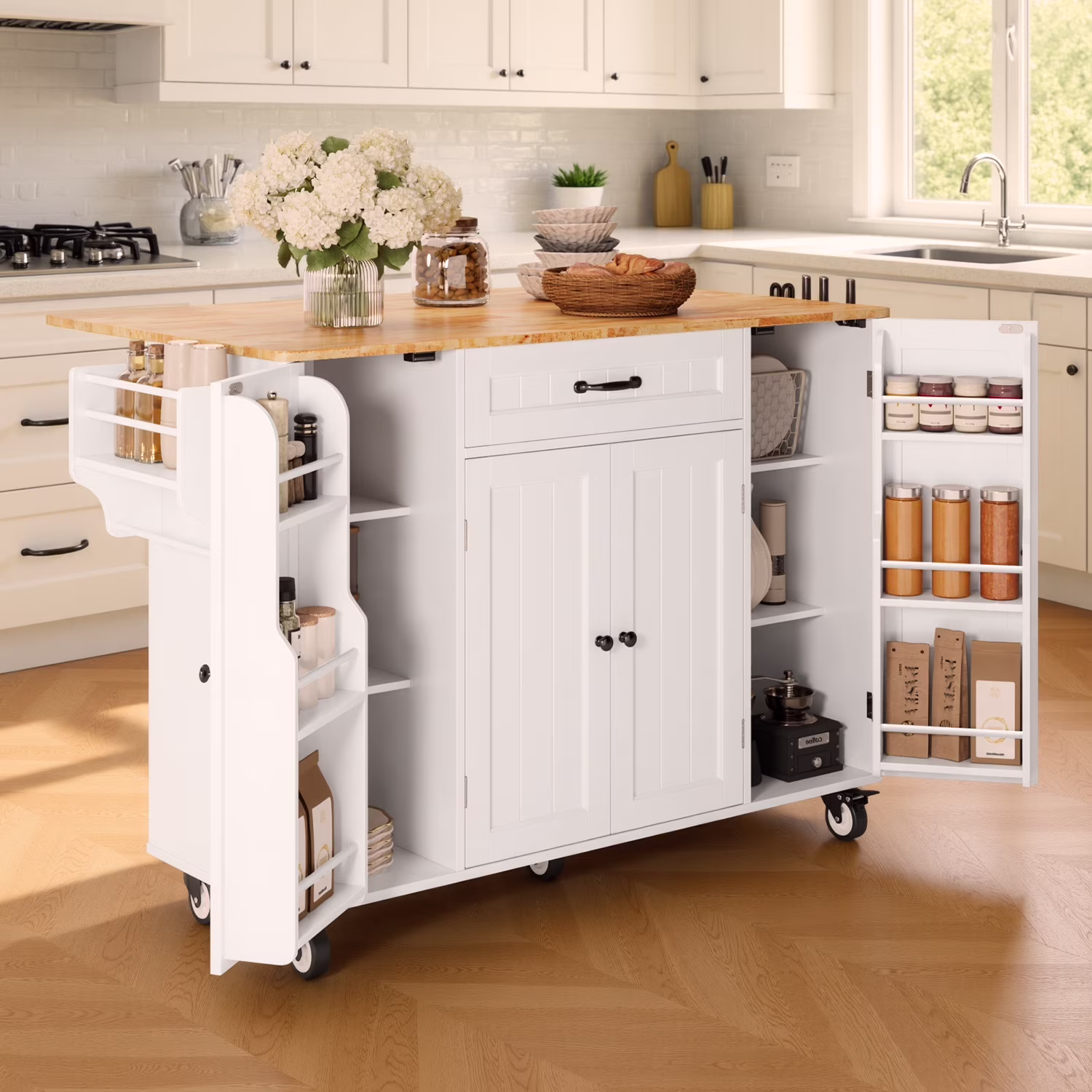 Looking for a spacious kitchen island on wheels that��s easy to move and maximizes storage?