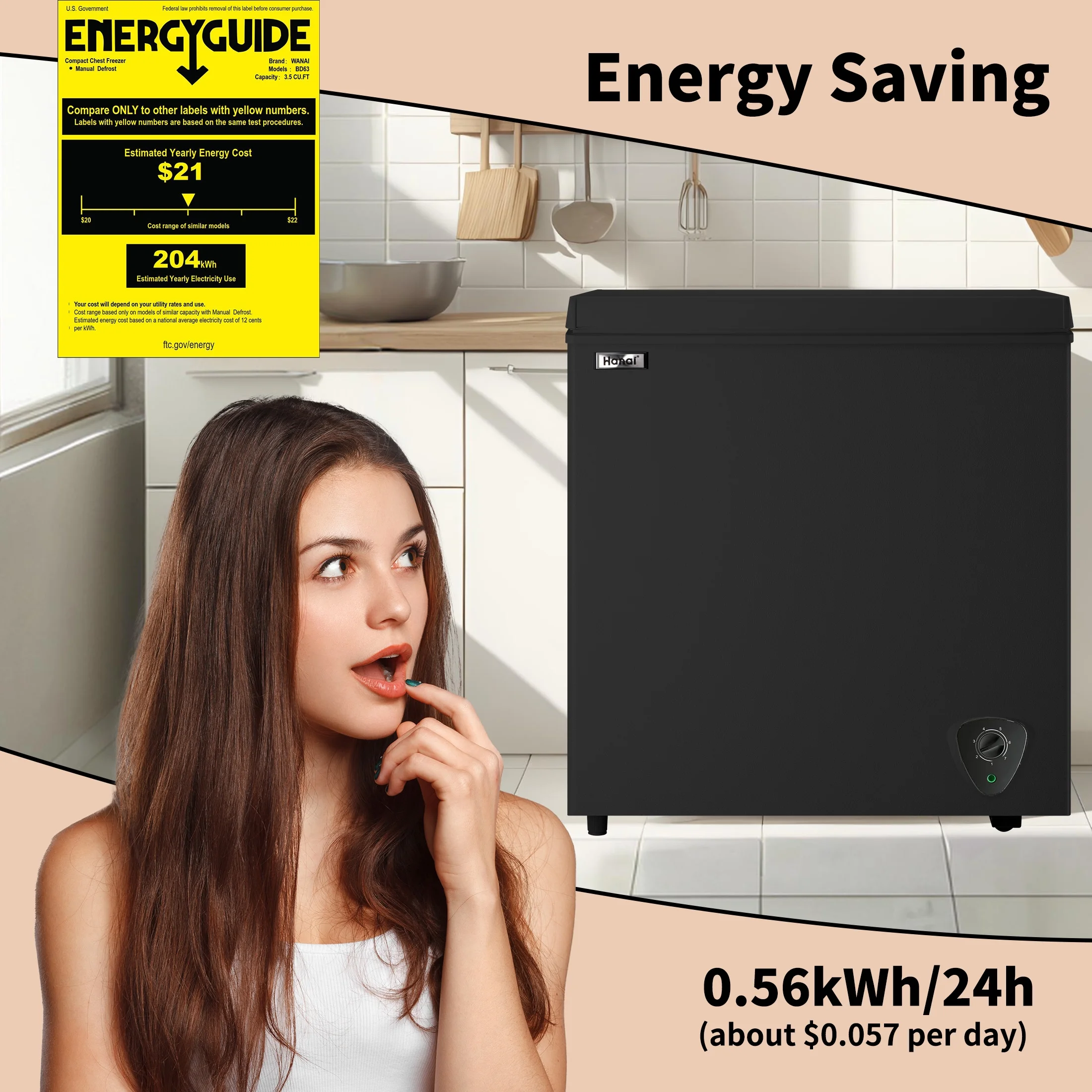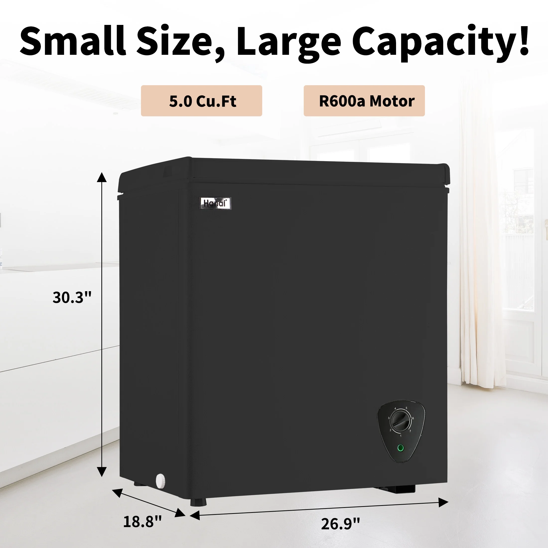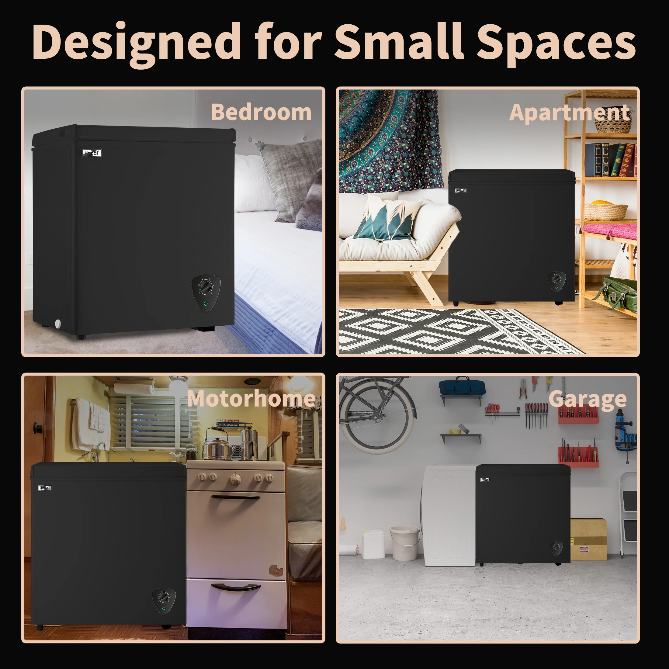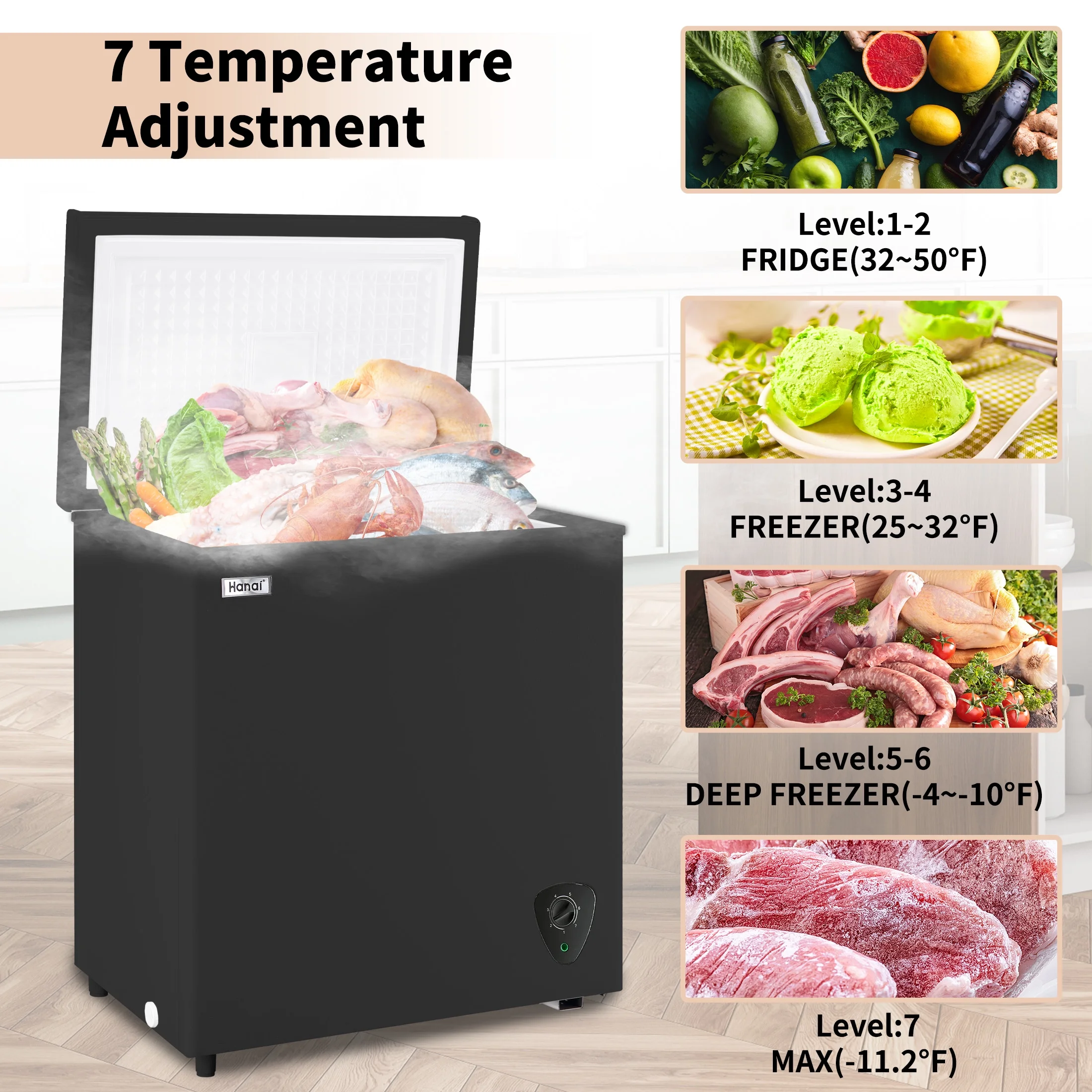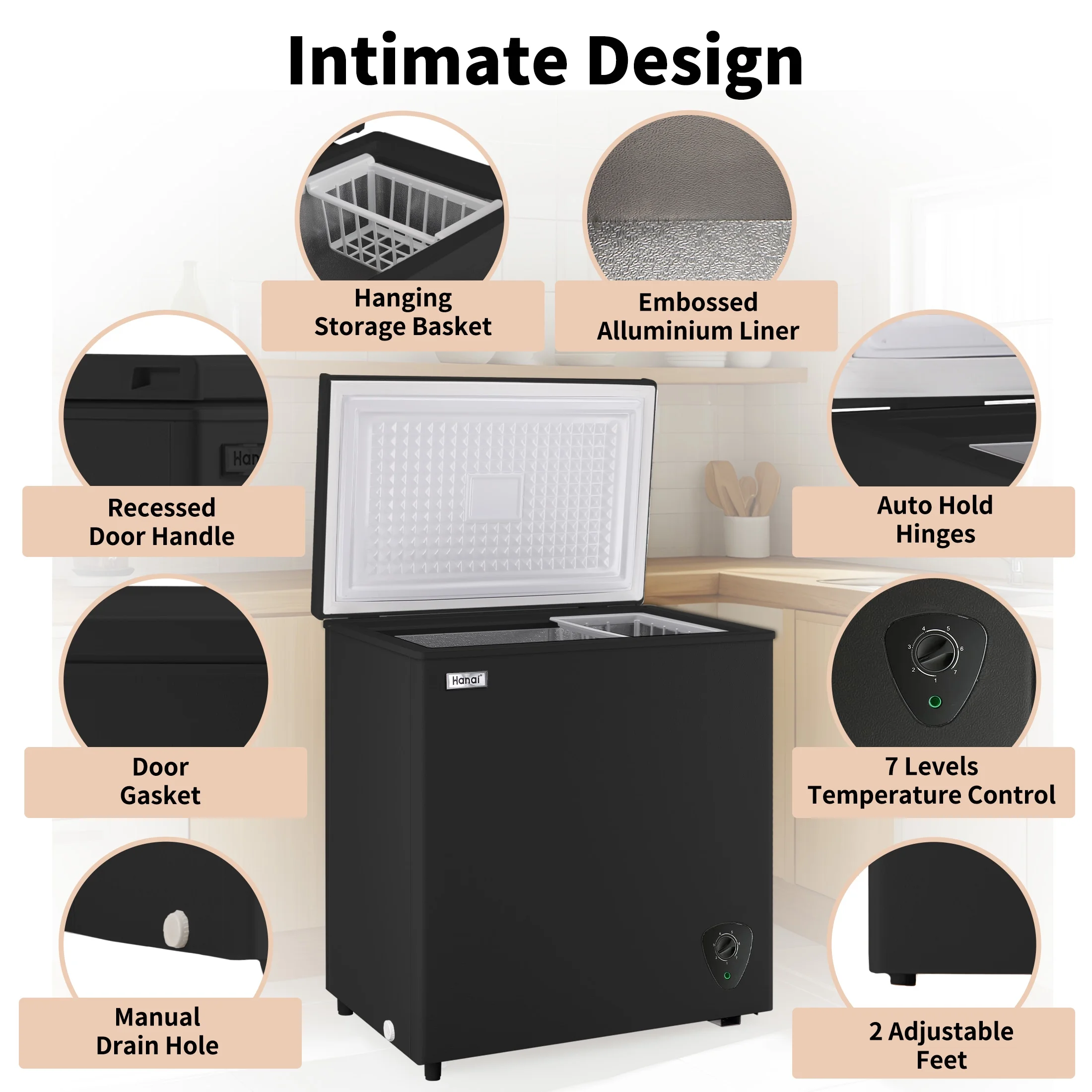 WANAI 5 Cu ft freezer, chest freezer, black. This compact unit gives you extra space to store frozen foods, looks stylish, and takes up minimal space in your home or business. Whether you are working for your house, garage, basement, apartment, kitchen, cabin, lake house, timeshare. The black closet refrigerator can meet your frozen food needs. Removable storage basket, easy-to-clean interior, washers, easy to use. Black blends easily into almost any personal or professional environment.