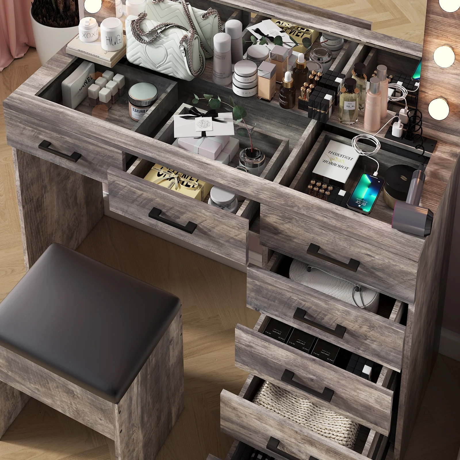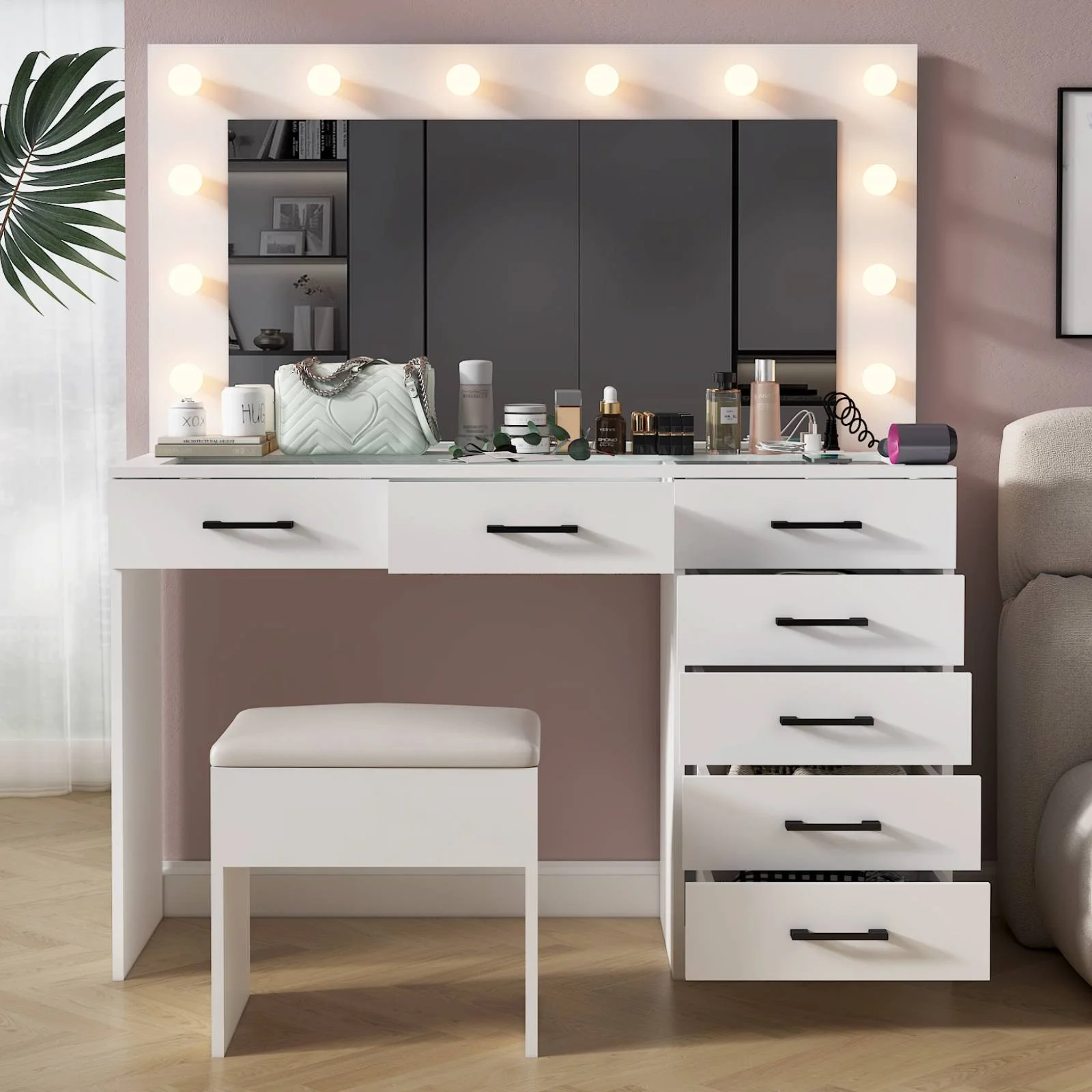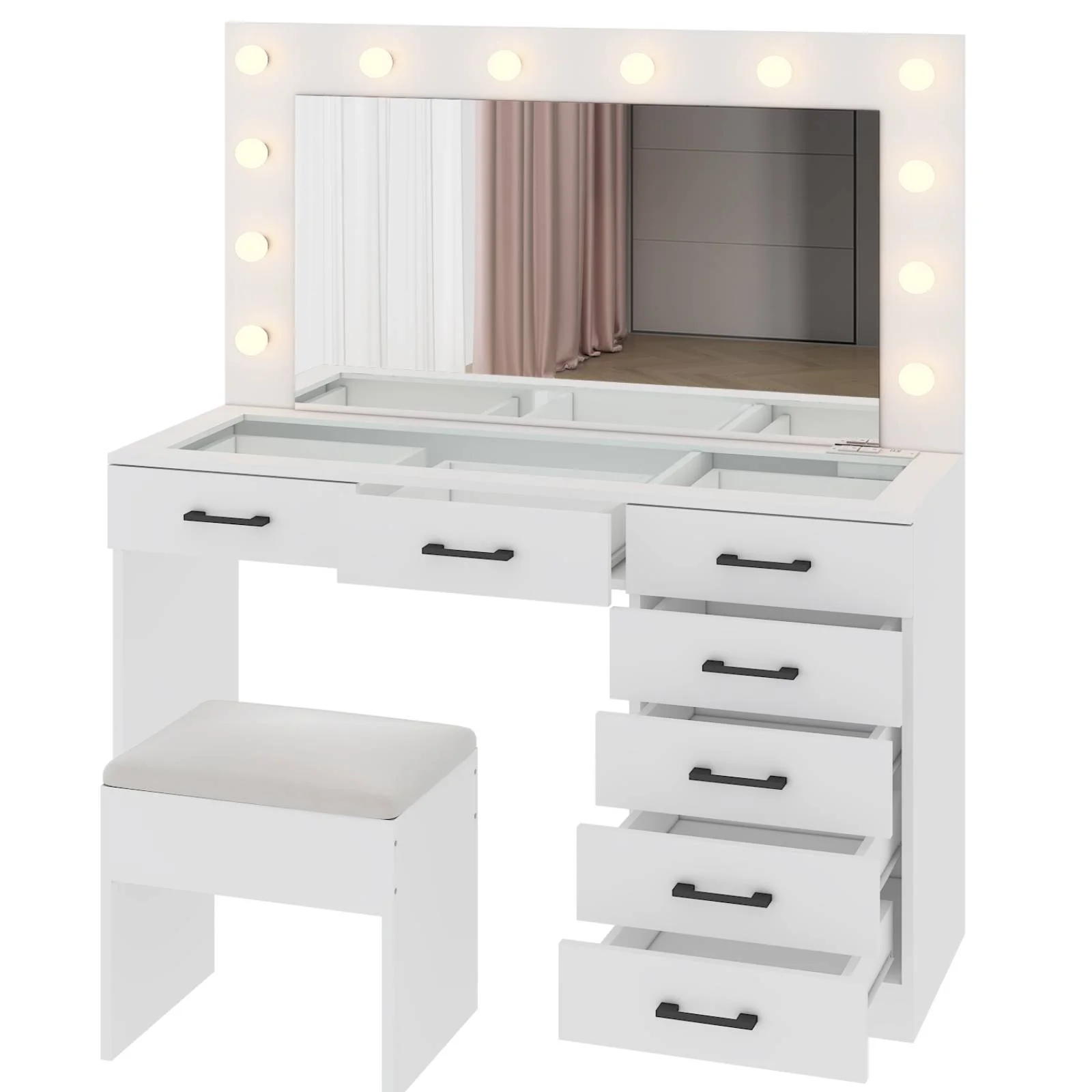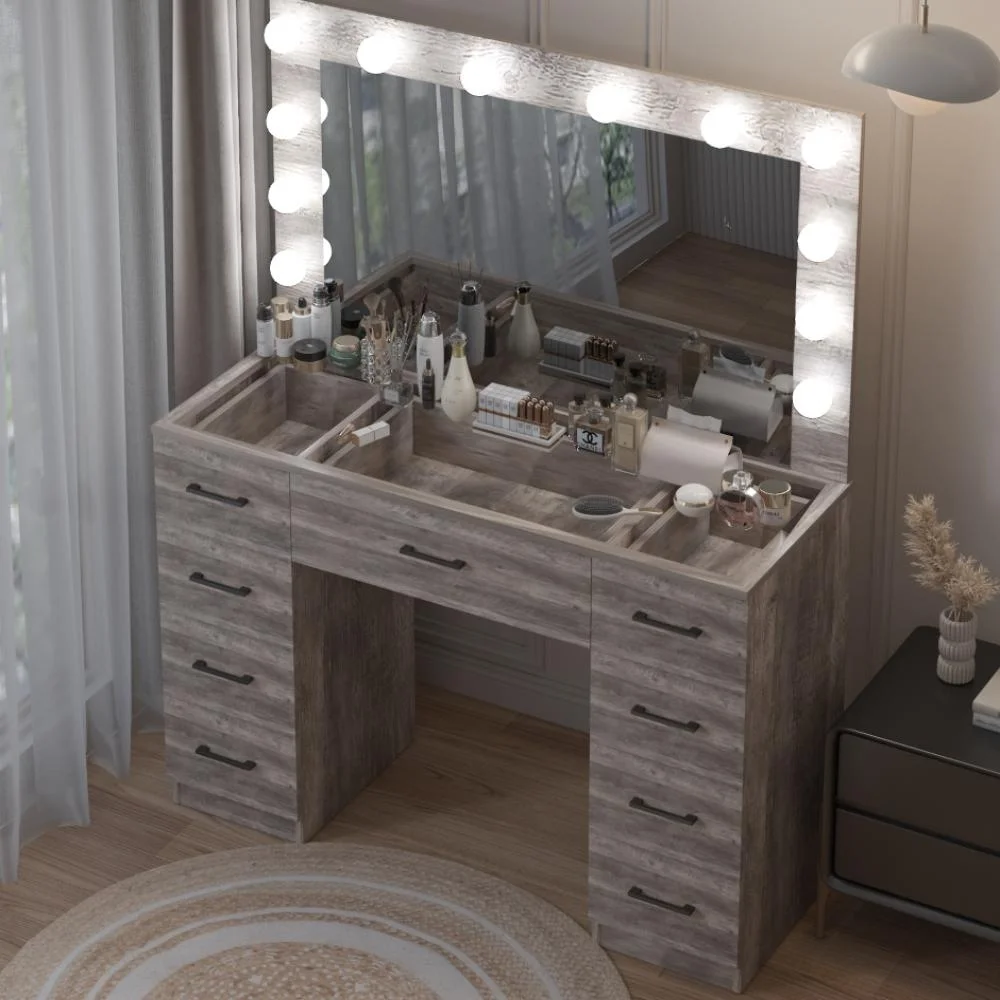 Keep your essentials organized with the vanity table set, featuring 9 spacious drawers. These drawers provide ample space for storing makeup, brushes, and beauty tools. -