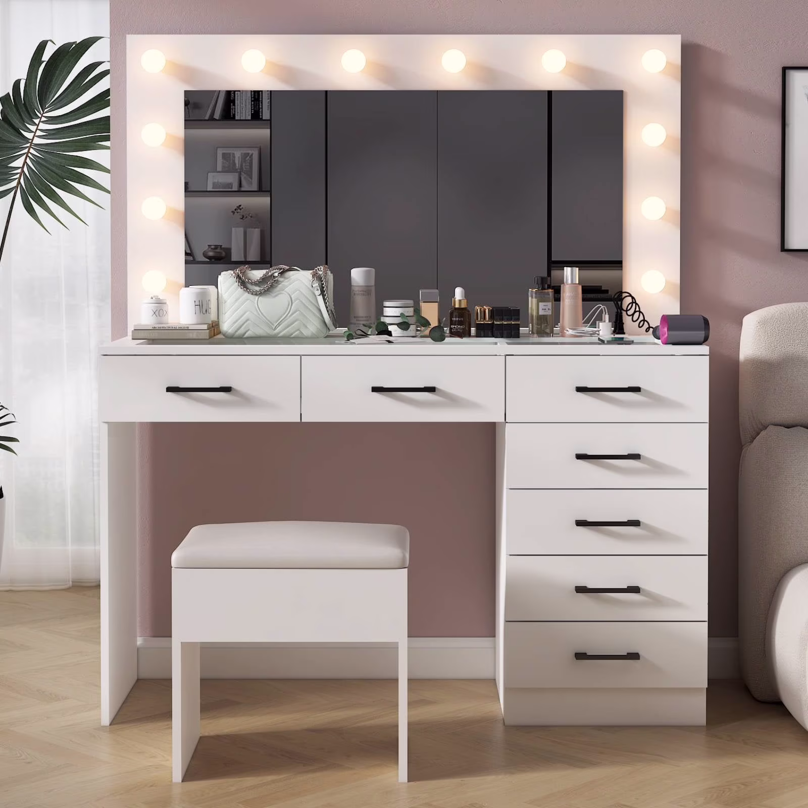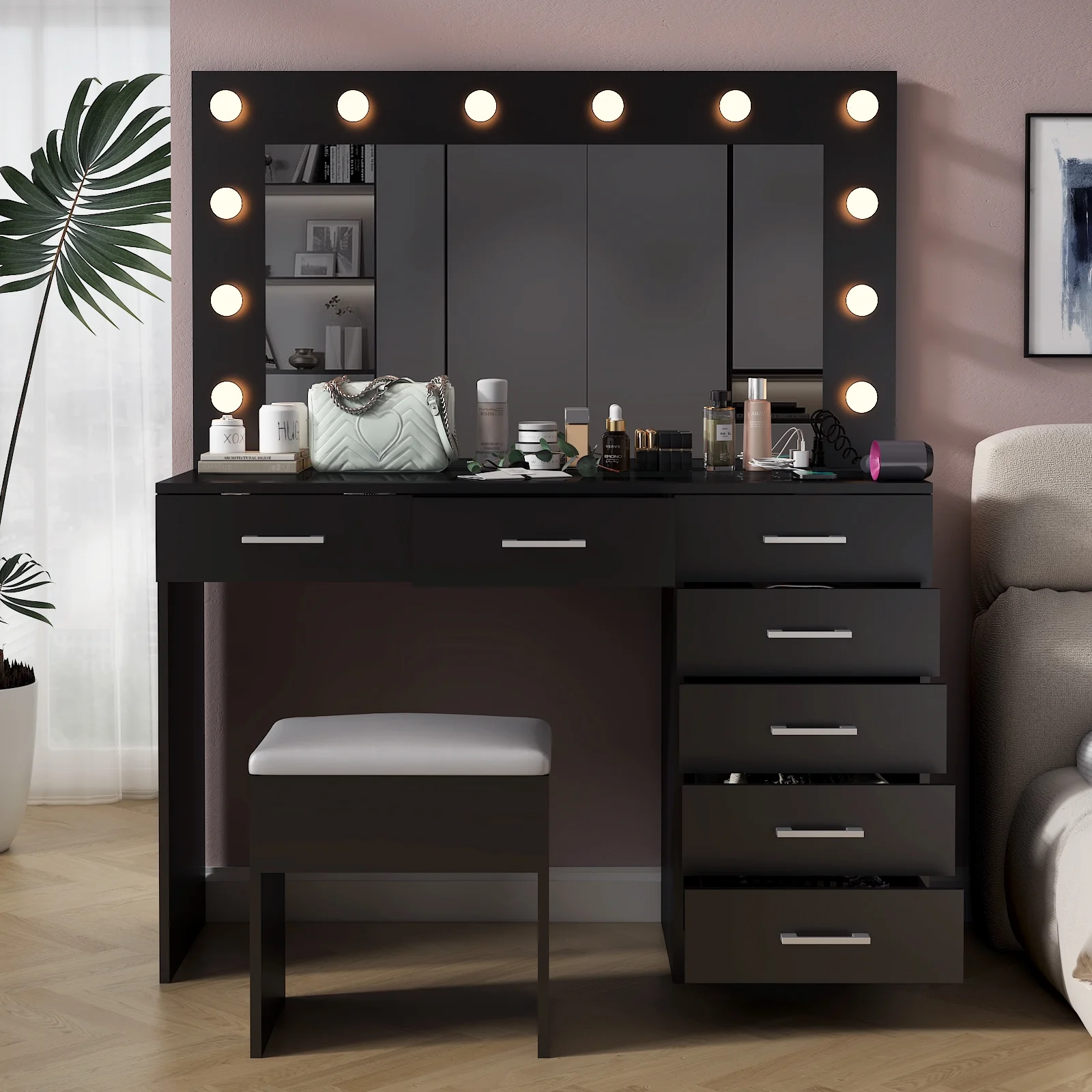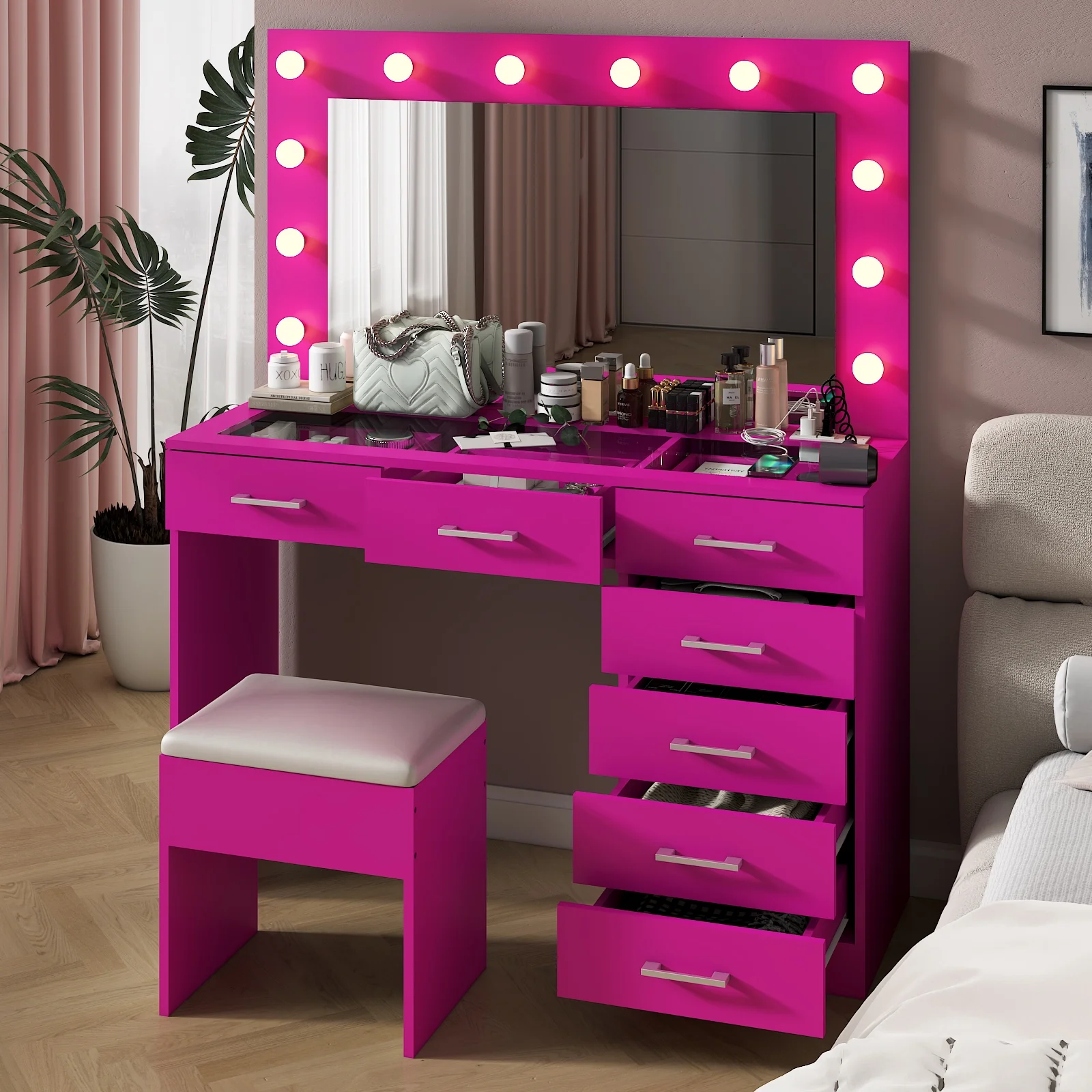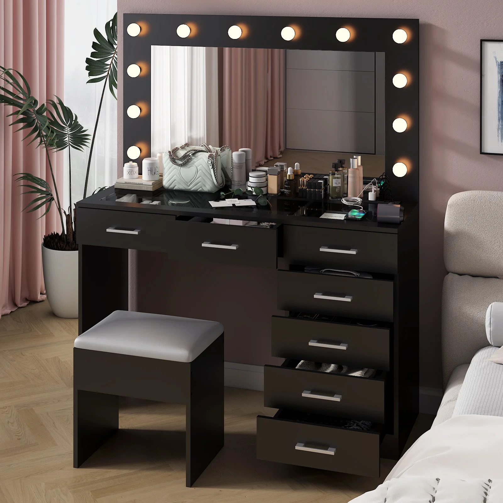 Keep your essentials organized with the vanity table set, featuring 9 spacious drawers. These drawers provide ample space for storing makeup, brushes, and beauty tools. -