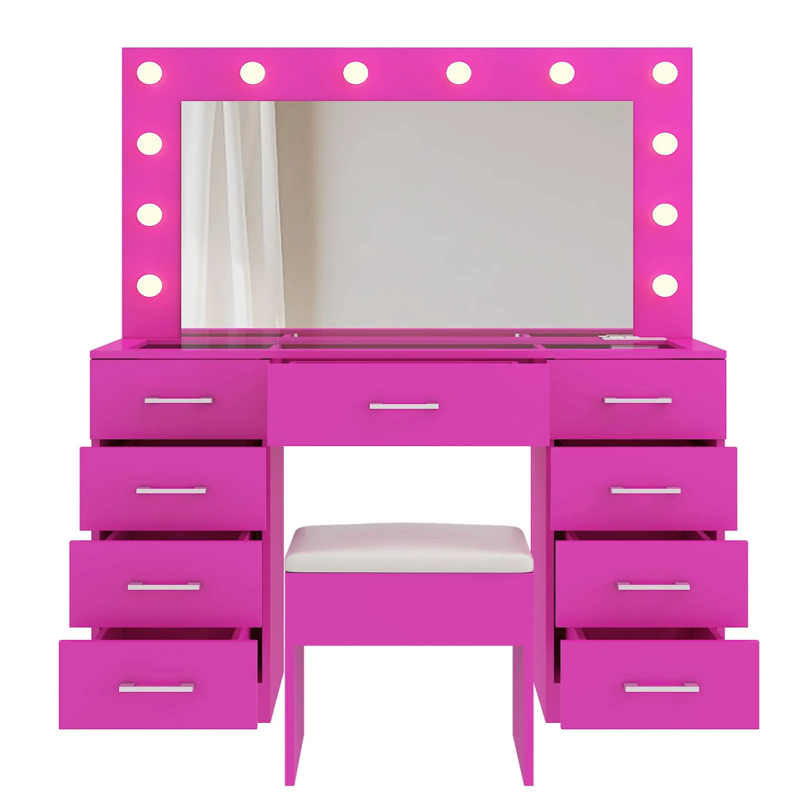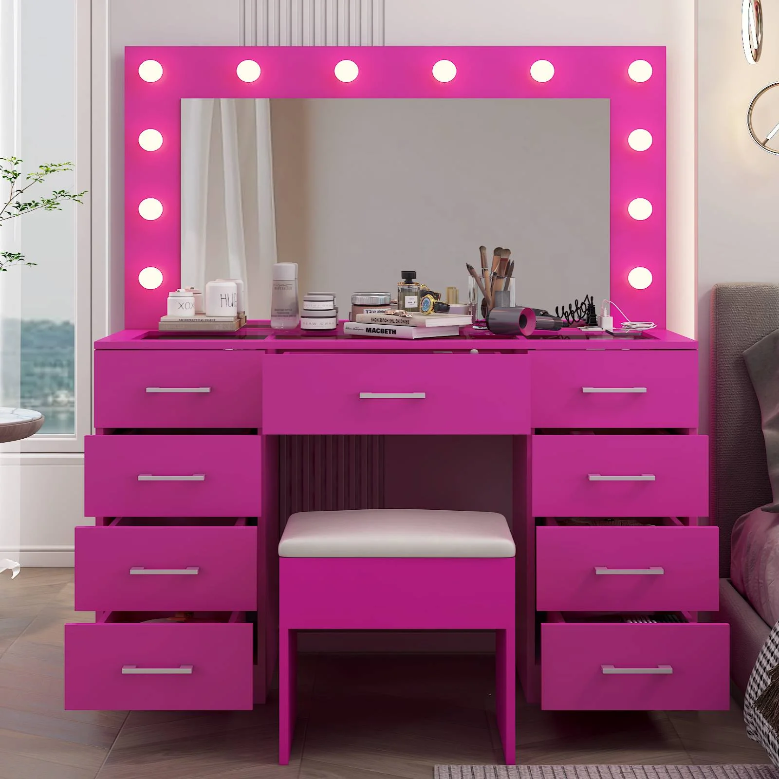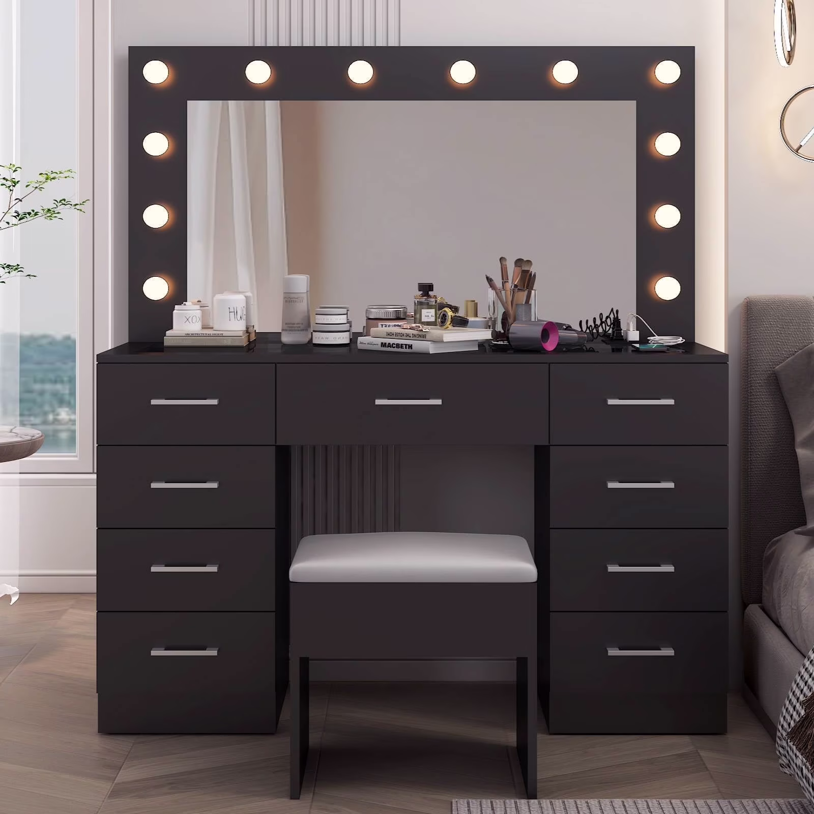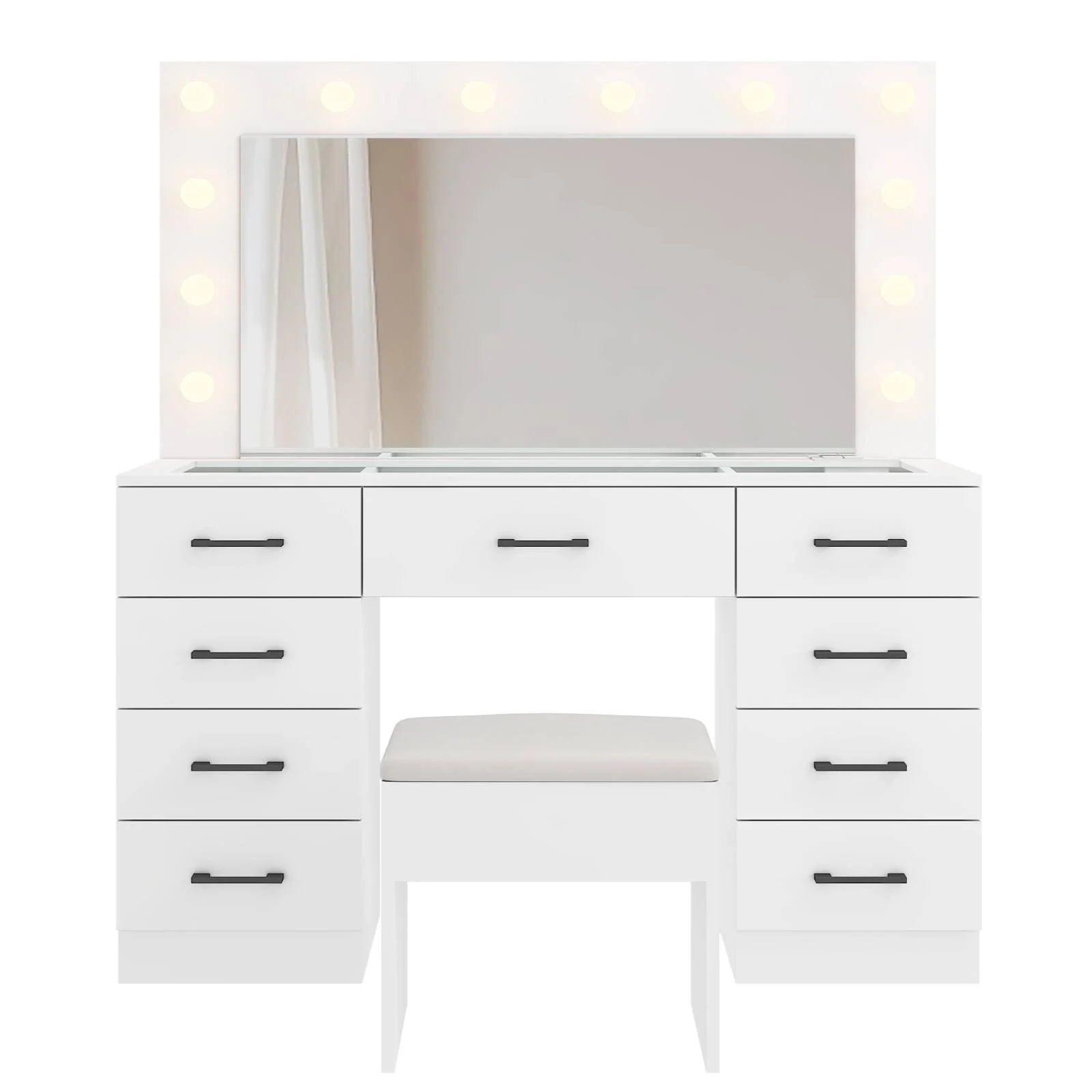 Keep your essentials organized with the vanity table set, featuring 9 spacious drawers. These drawers provide ample space for storing makeup, brushes, and beauty tools. -