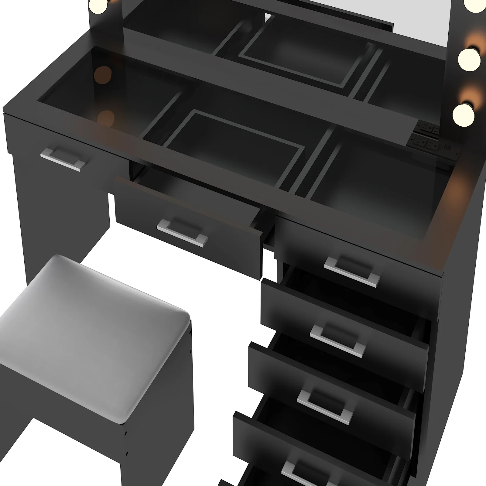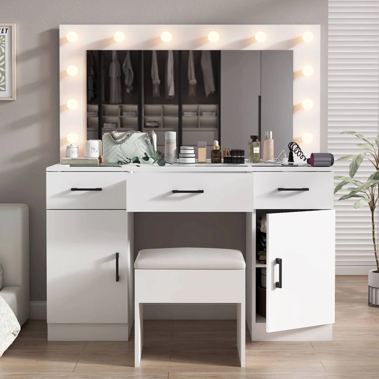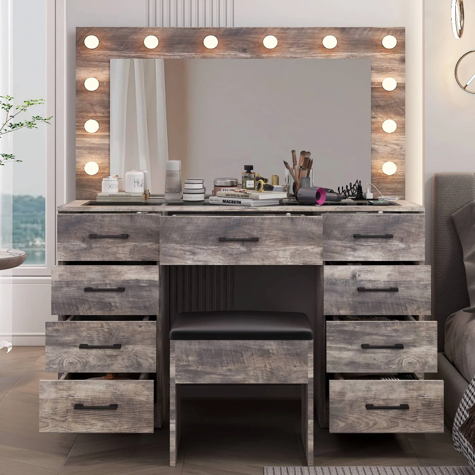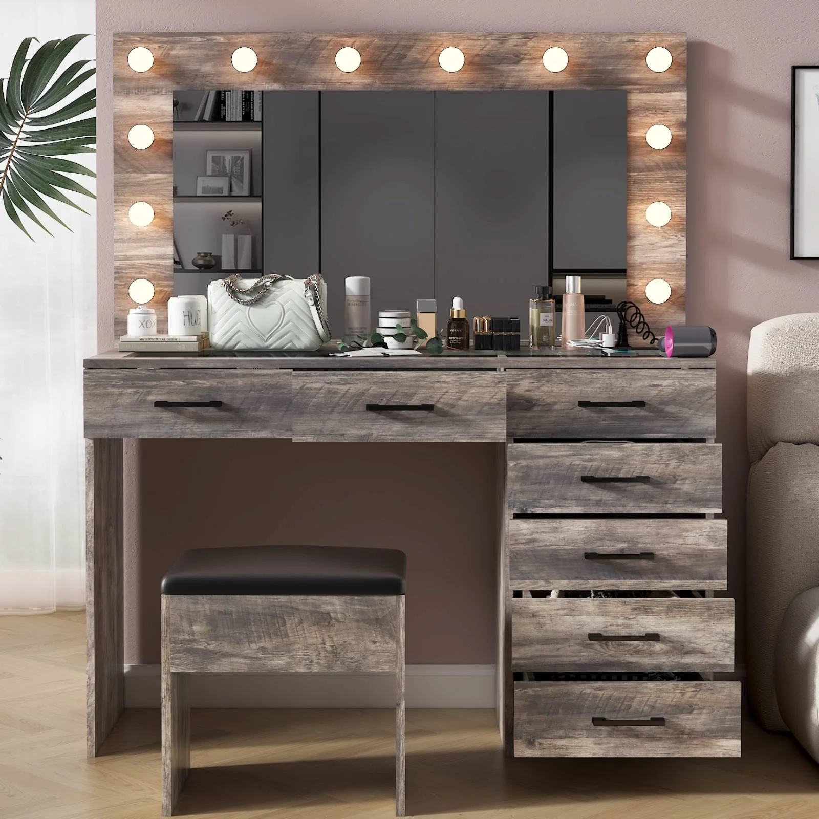Keep your essentials organized with the vanity table set, featuring 9 spacious drawers. These drawers provide ample space for storing makeup, brushes, and beauty tools. -