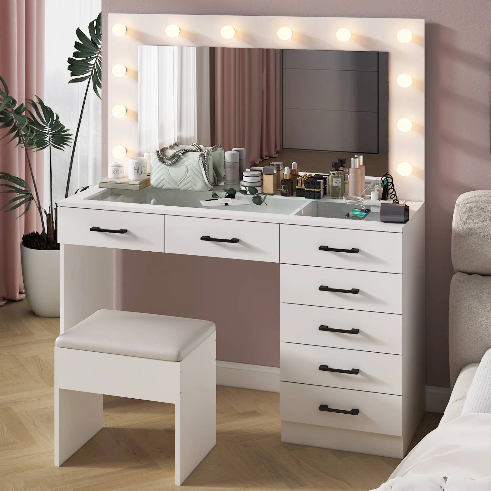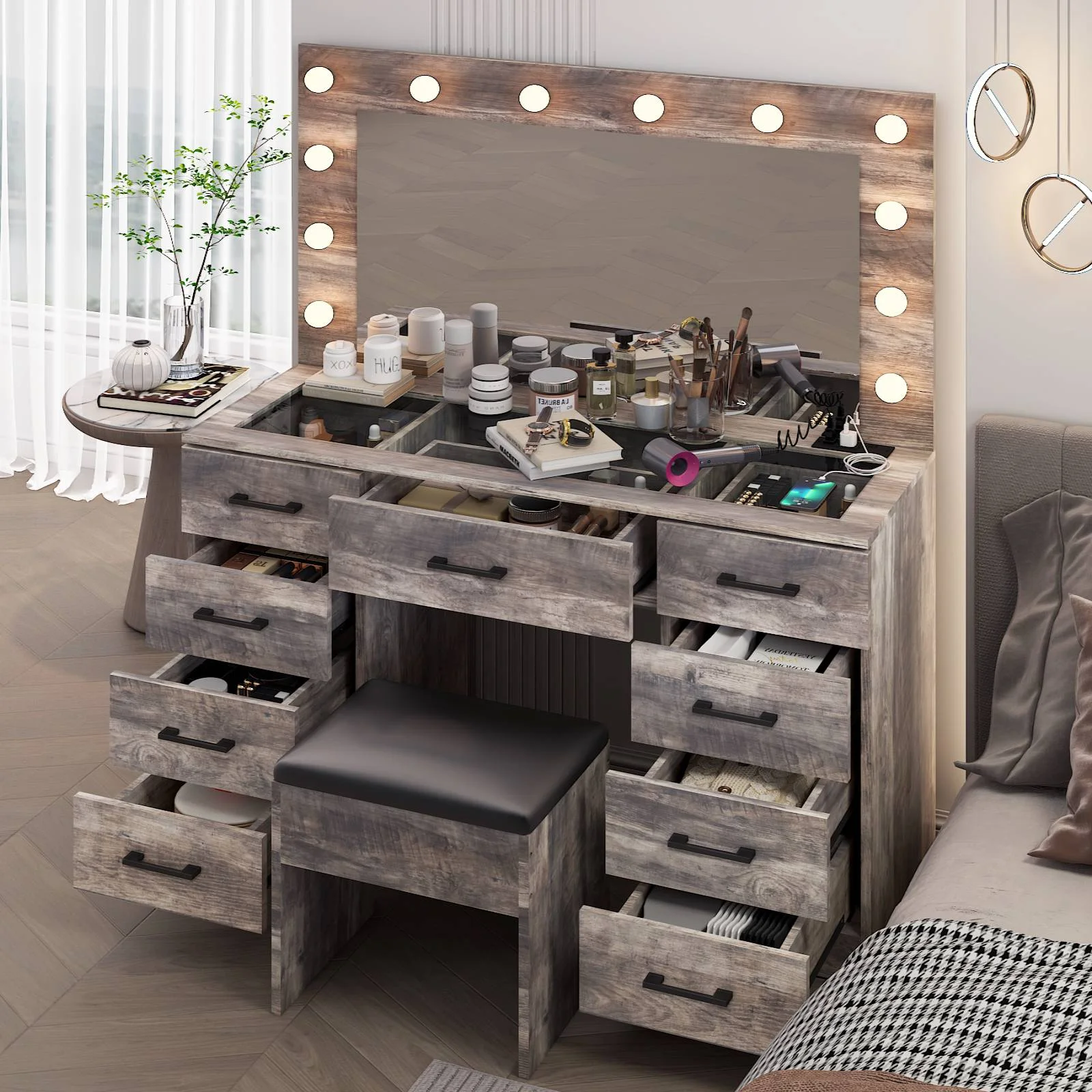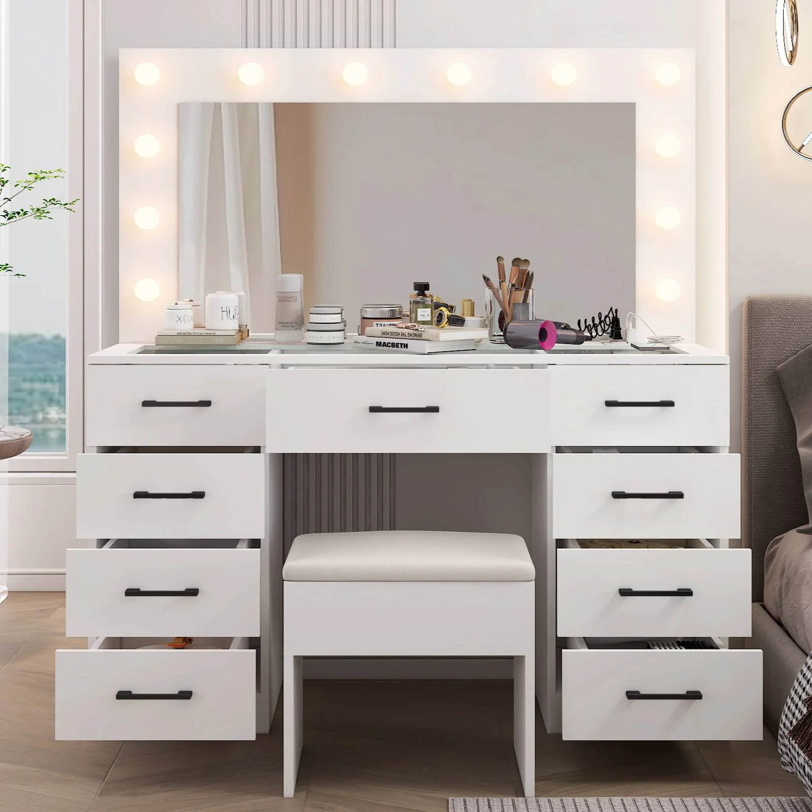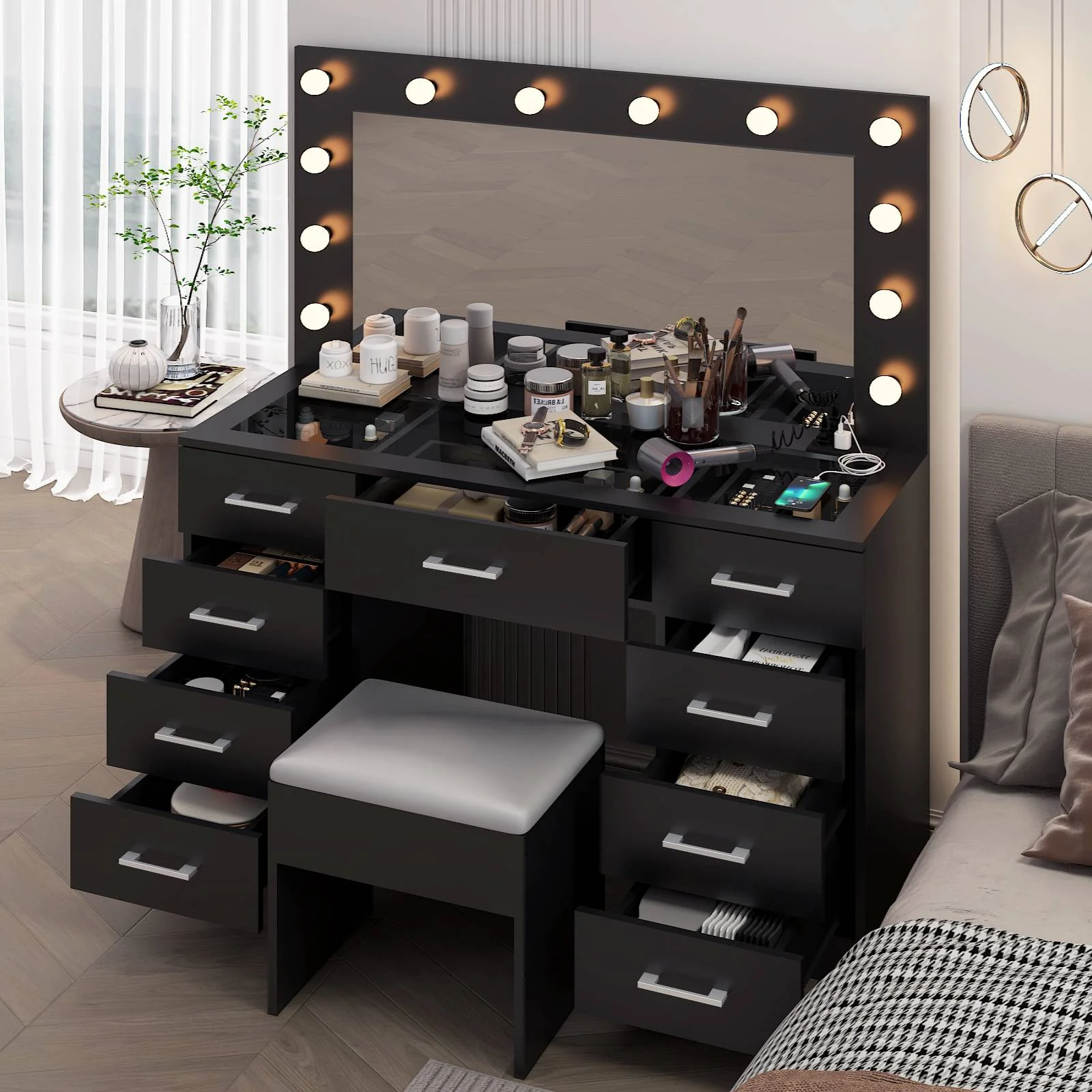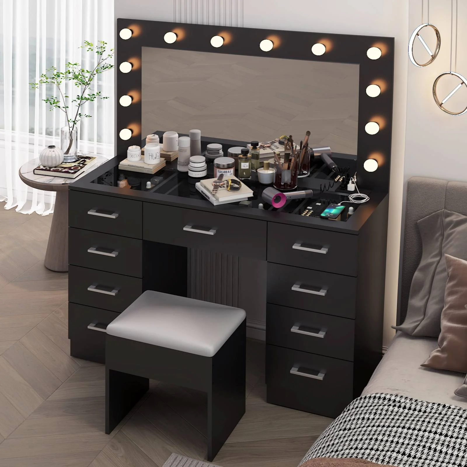 Experience the ultimate in modern beauty with this makeup vanity. Designed to elevate your daily routine, this vanity table set combines functionality with style. The vanity desk features a stunning visual glass surface, 9 spacious drawers for ample storage, an integrated charging outlet, and adjustable tri-color lighting. Complete with a large, seamless glass mirror, this dressing table is perfect for achieving flawless makeup and styling. Transform your space and enhance your beauty routine with this sophisticated makeup vanity.
