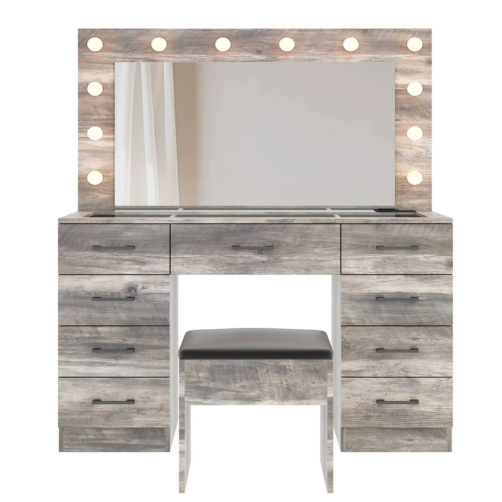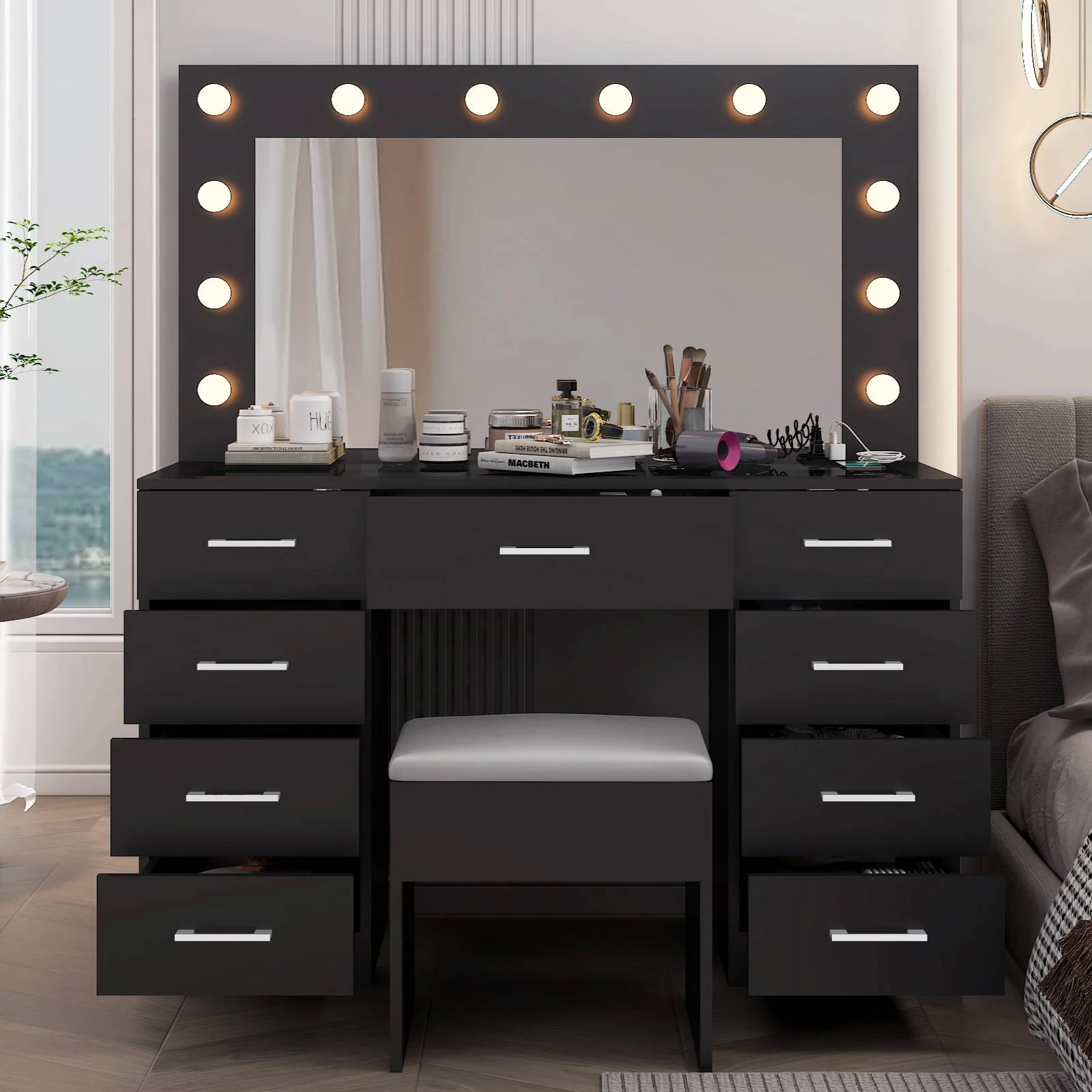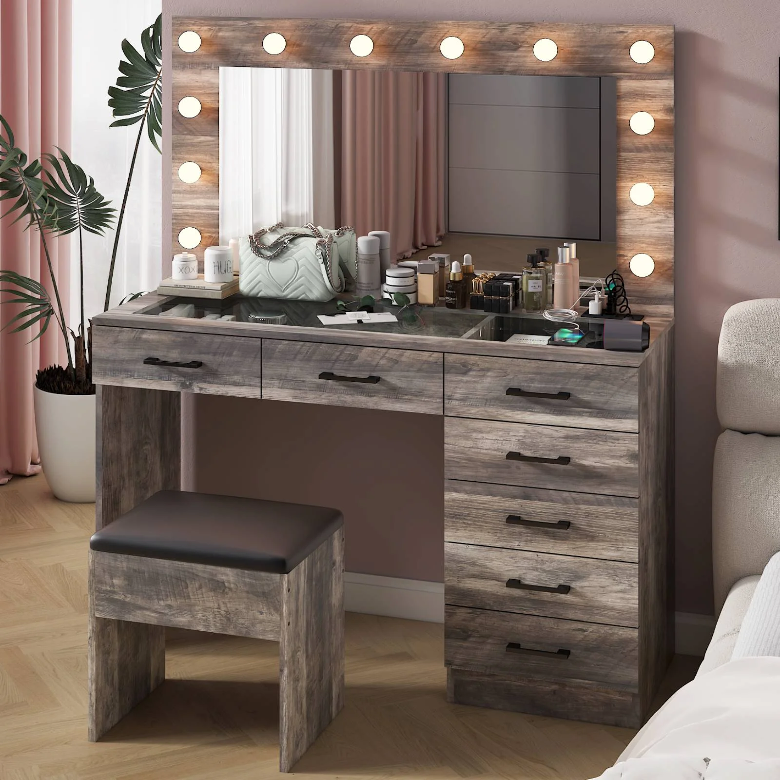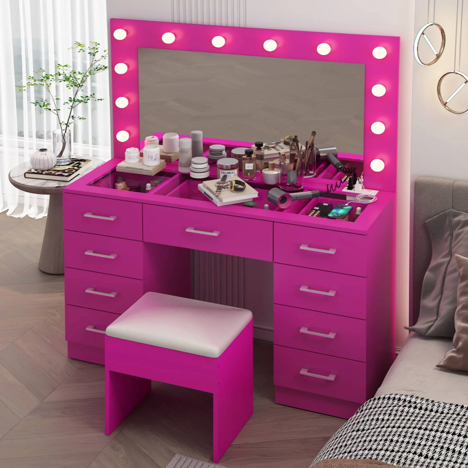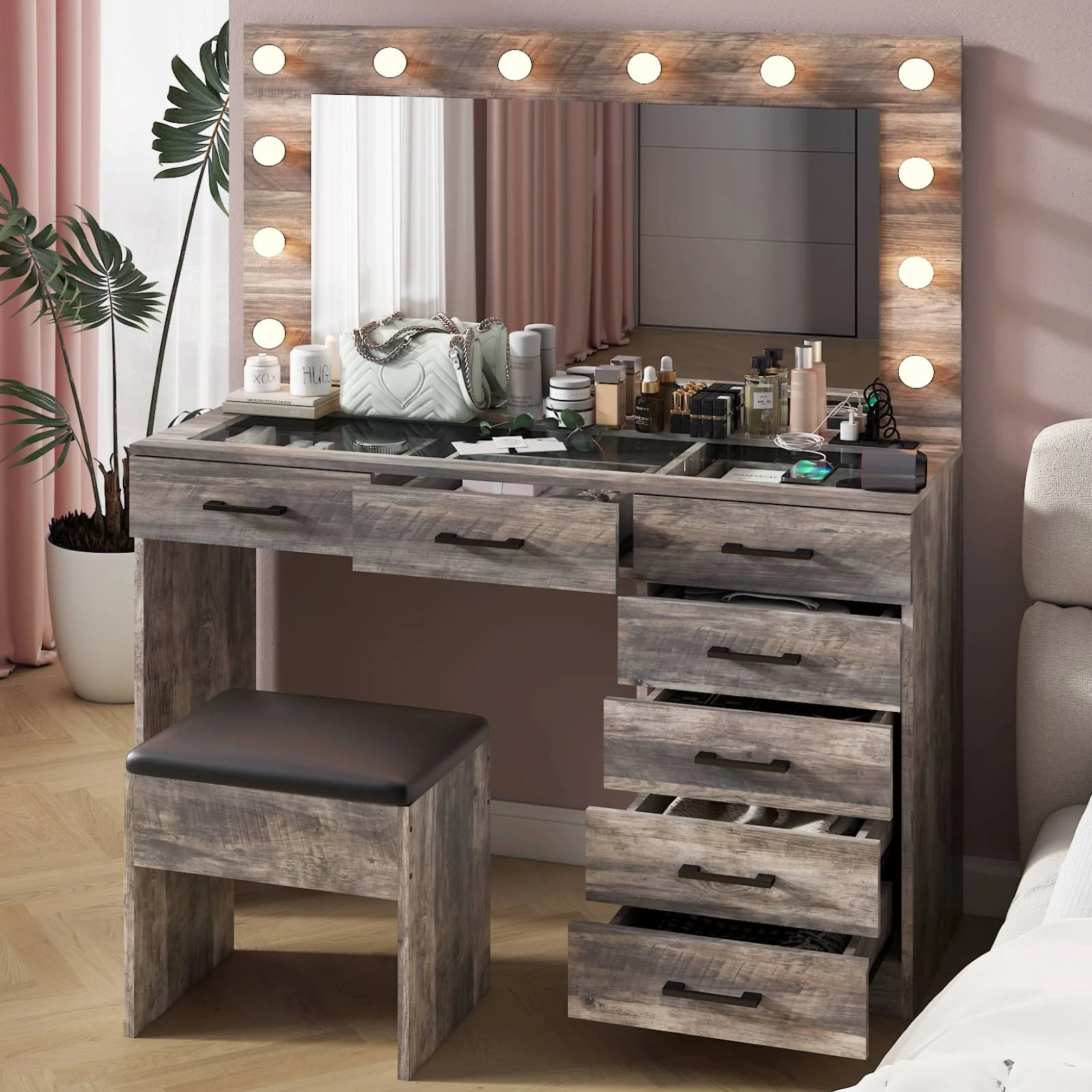 Experience the ultimate in modern beauty with this makeup vanity. Designed to elevate your daily routine, this vanity table set combines functionality with style. The vanity desk features a stunning visual glass surface, 9 spacious drawers for ample storage, an integrated charging outlet, and adjustable tri-color lighting. Complete with a large, seamless glass mirror, this dressing table is perfect for achieving flawless makeup and styling. Transform your space and enhance your beauty routine with this sophisticated makeup vanity.
