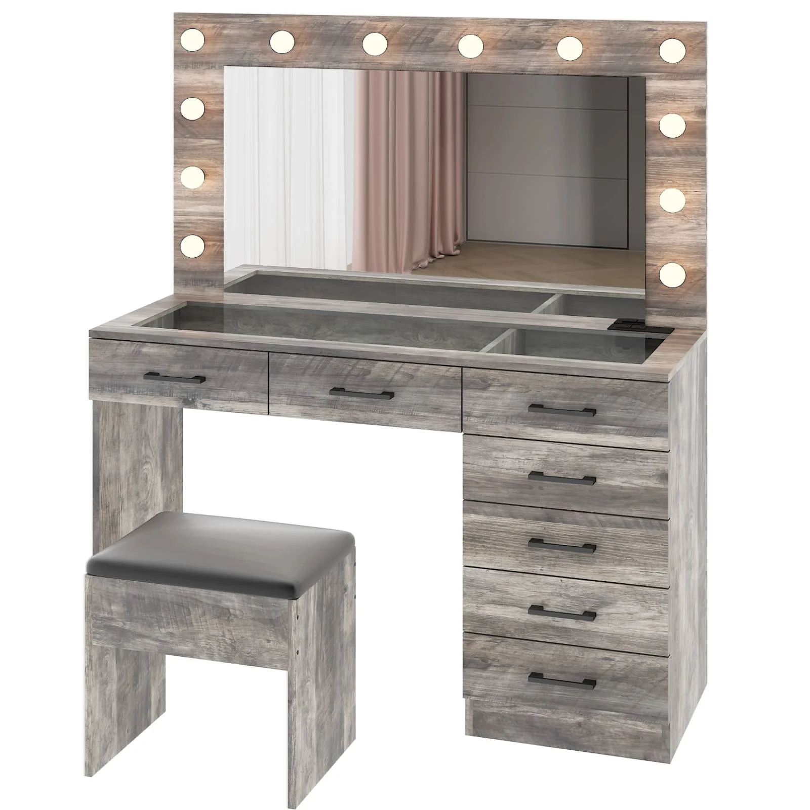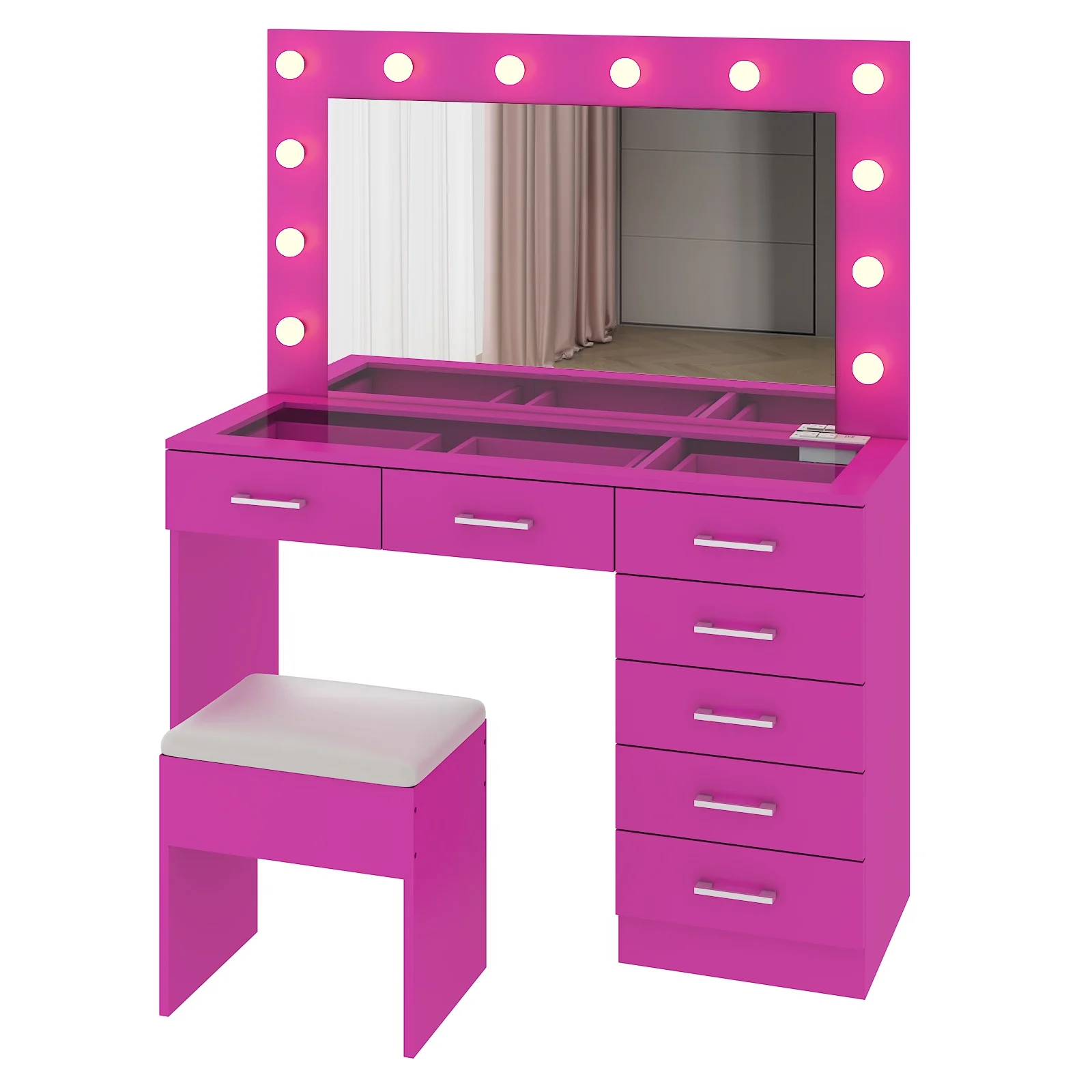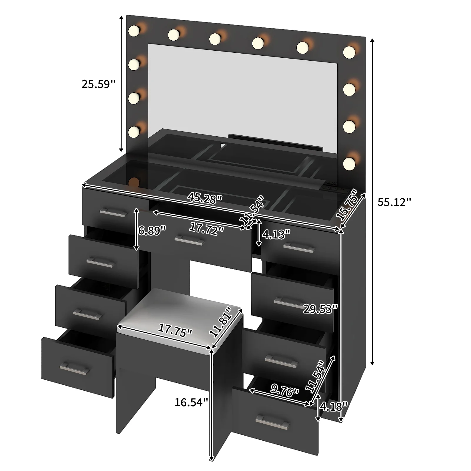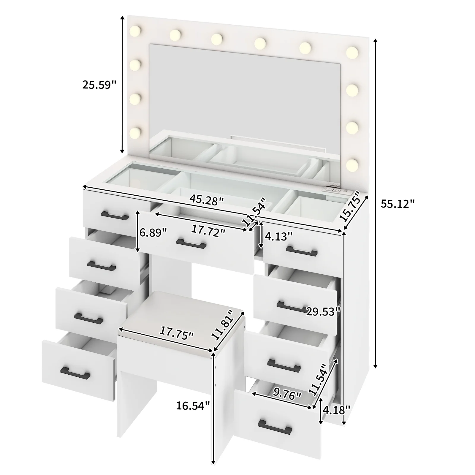 Experience the ultimate in modern beauty with this makeup vanity. Designed to elevate your daily routine, this vanity table set combines functionality with style. The vanity desk features a stunning visual glass surface, 9 spacious drawers for ample storage, an integrated charging outlet, and adjustable tri-color lighting. Complete with a large, seamless glass mirror, this dressing table is perfect for achieving flawless makeup and styling. Transform your space and enhance your beauty routine with this sophisticated makeup vanity.
