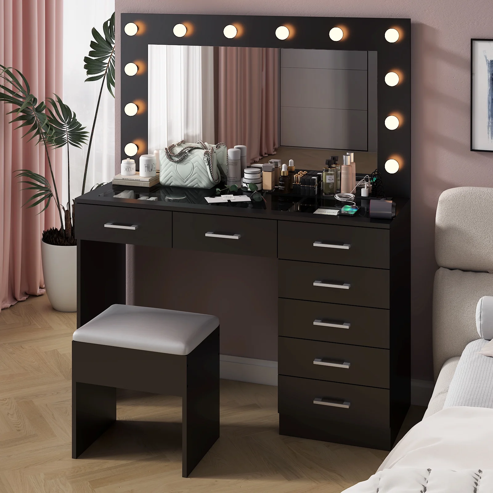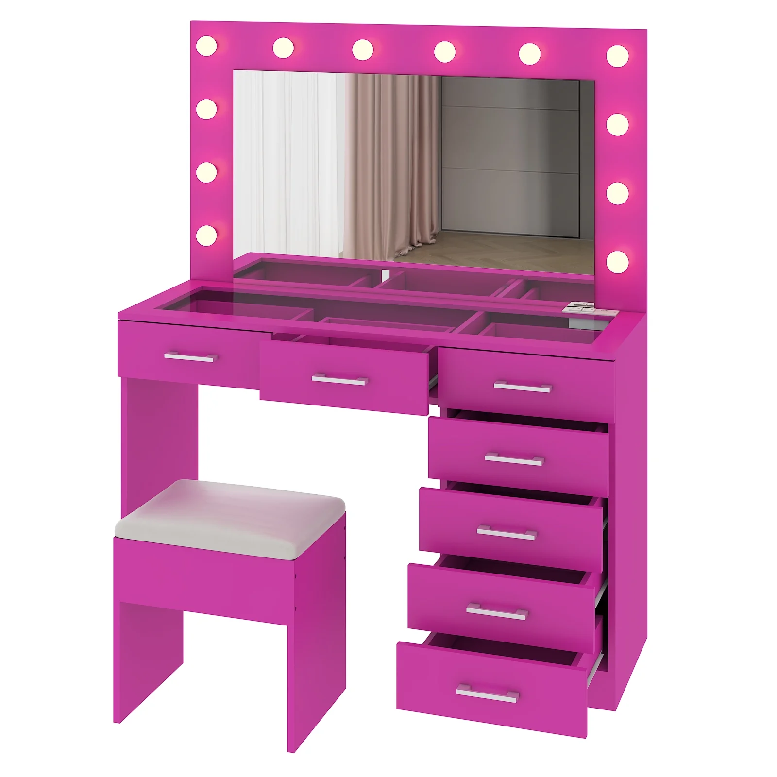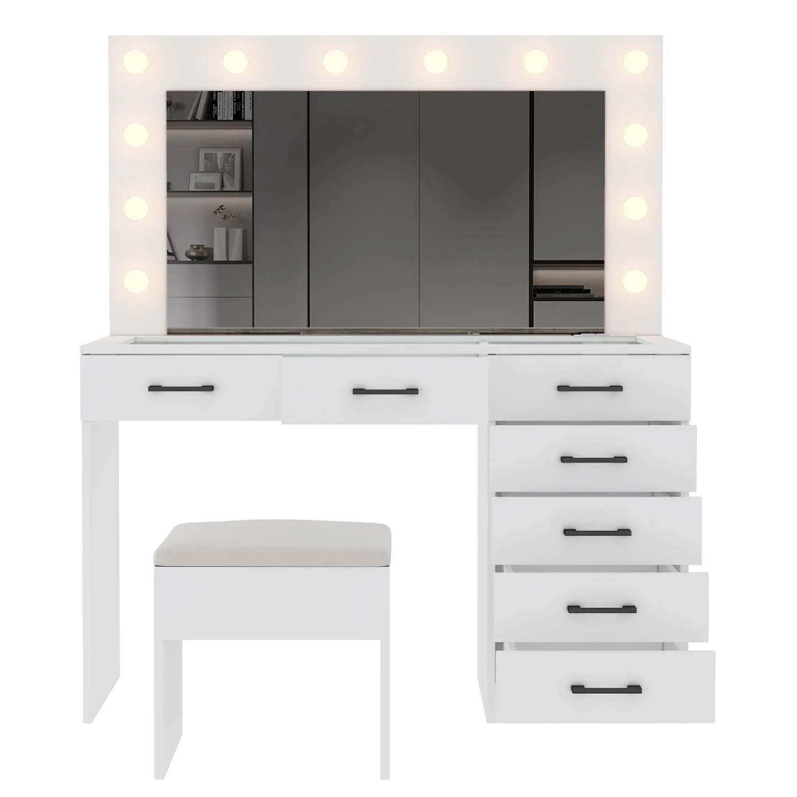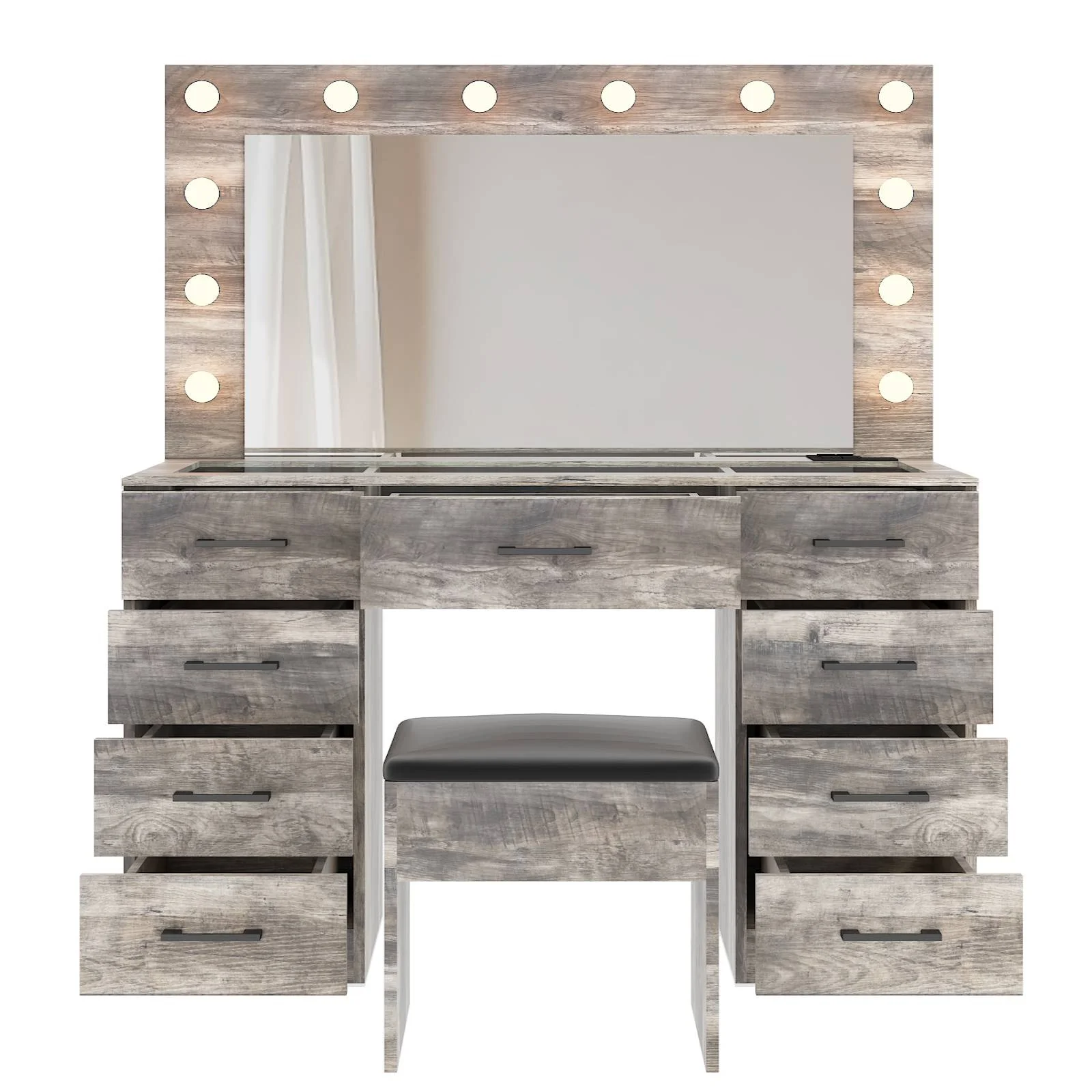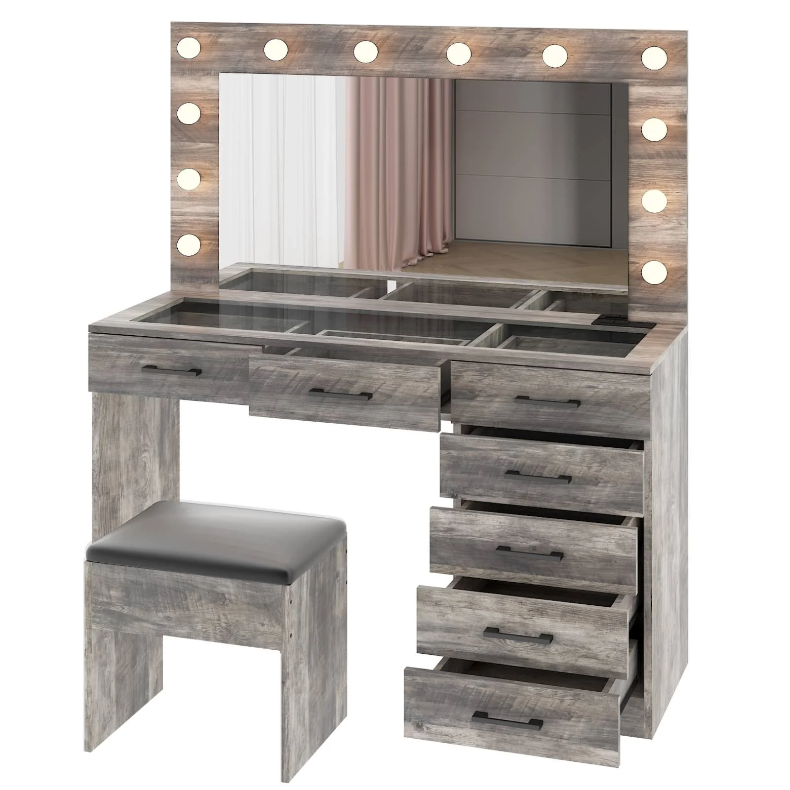 Experience the ultimate in modern beauty with this makeup vanity. Designed to elevate your daily routine, this vanity table set combines functionality with style. The vanity desk features a stunning visual glass surface, 9 spacious drawers for ample storage, an integrated charging outlet, and adjustable tri-color lighting. Complete with a large, seamless glass mirror, this dressing table is perfect for achieving flawless makeup and styling. Transform your space and enhance your beauty routine with this sophisticated makeup vanity.