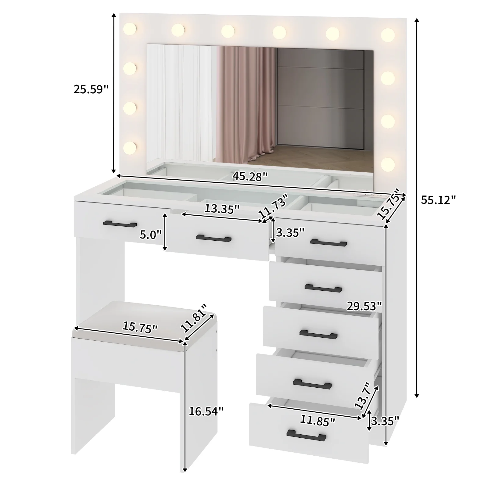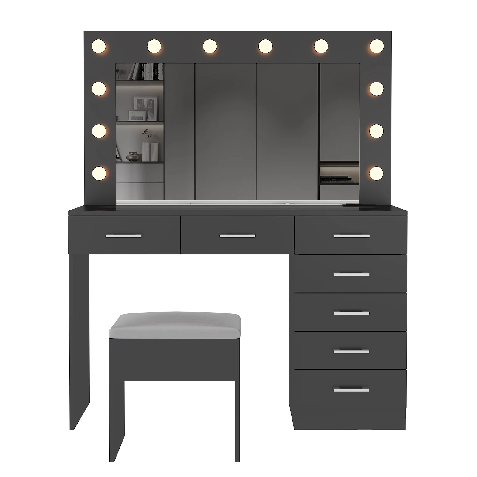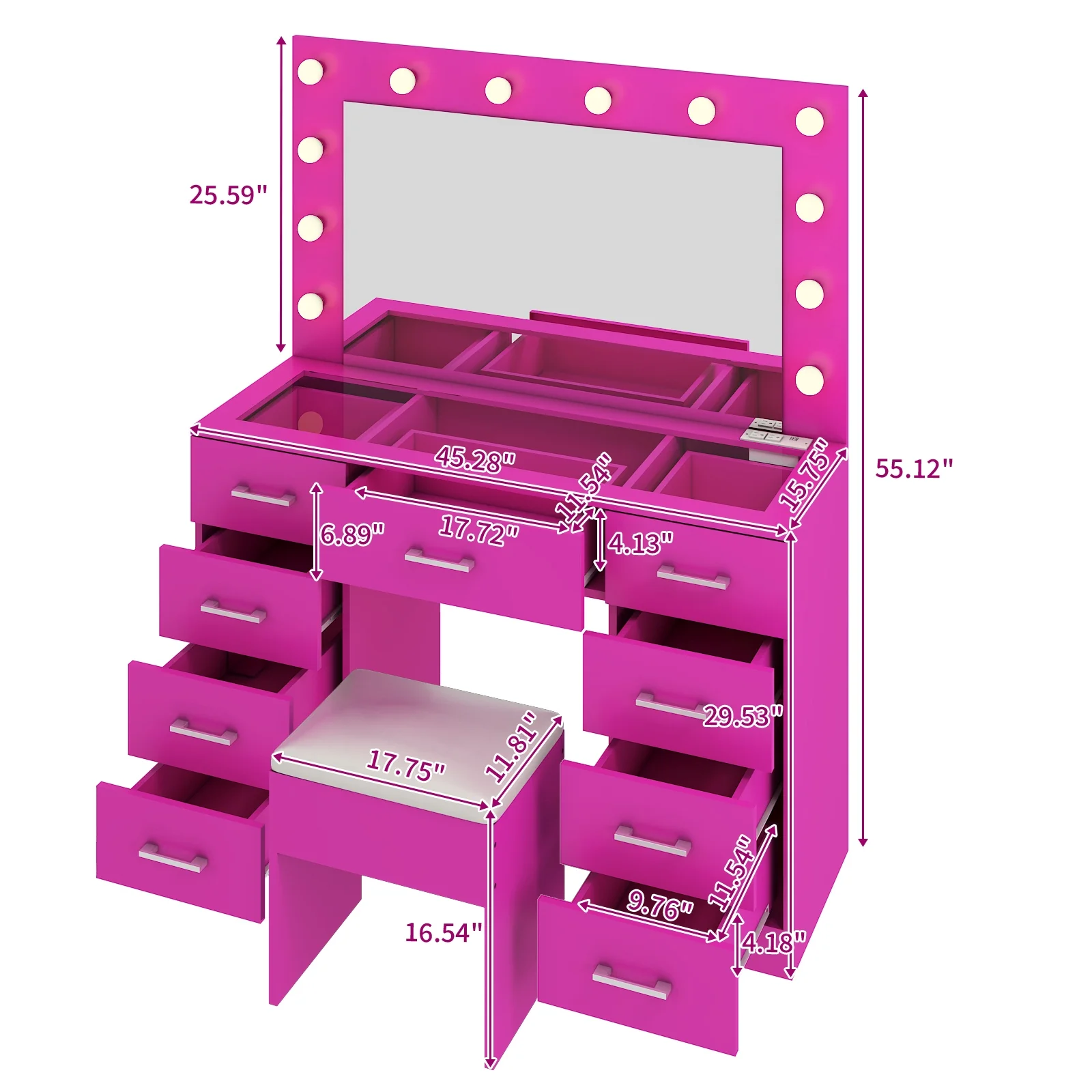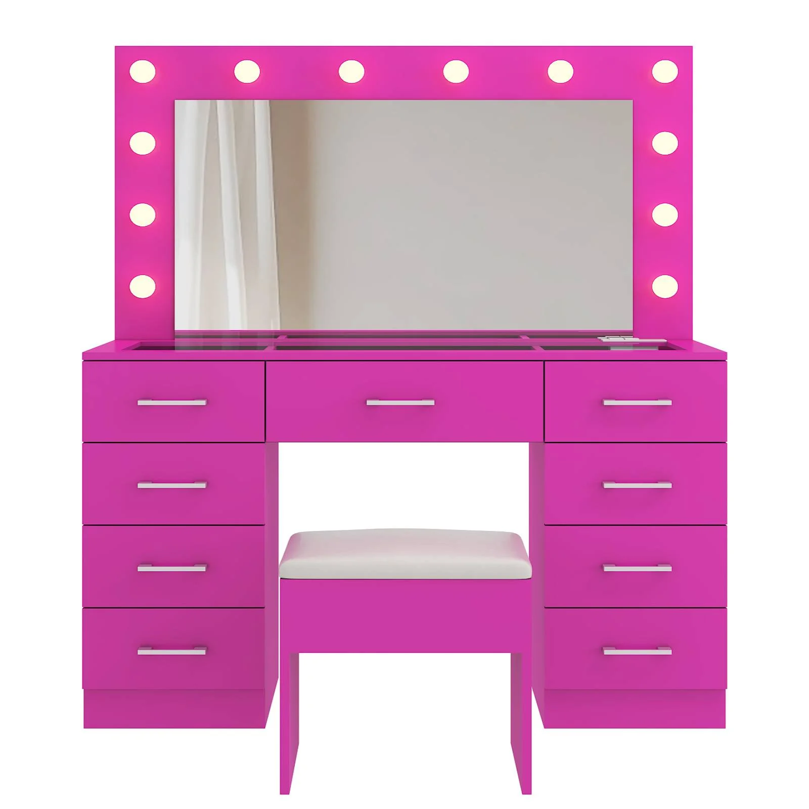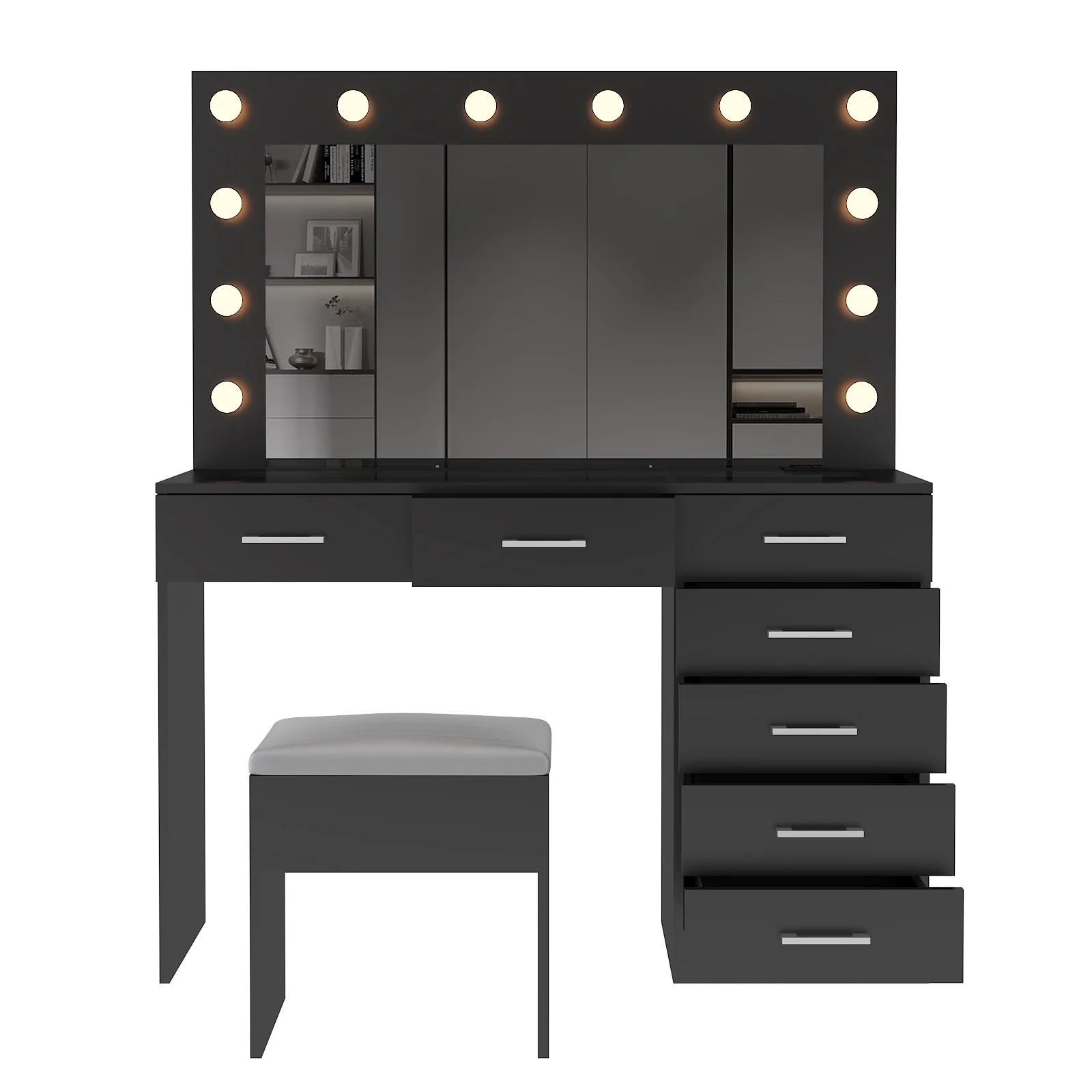 Experience the ultimate in modern beauty with this makeup vanity. Designed to elevate your daily routine, this vanity table set combines functionality with style. The vanity desk features a stunning visual glass surface, 9 spacious drawers for ample storage, an integrated charging outlet, and adjustable tri-color lighting. Complete with a large, seamless glass mirror, this dressing table is perfect for achieving flawless makeup and styling. Transform your space and enhance your beauty routine with this sophisticated makeup vanity.