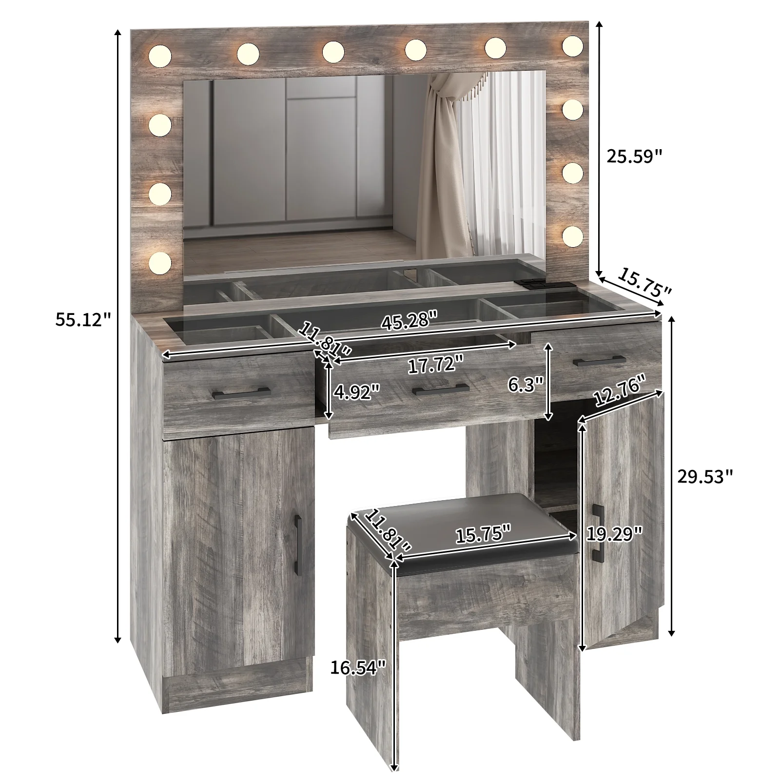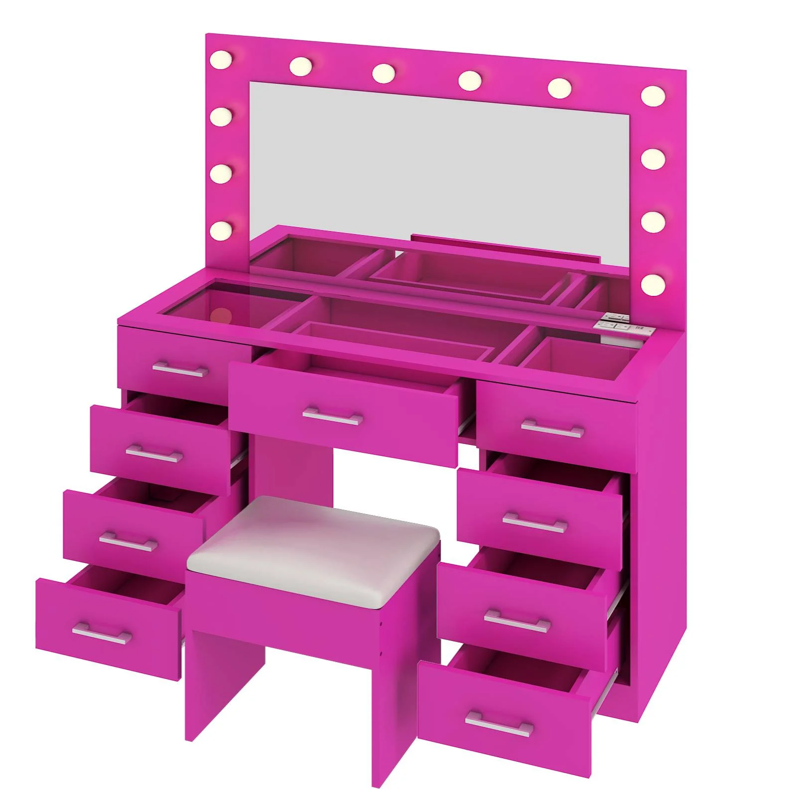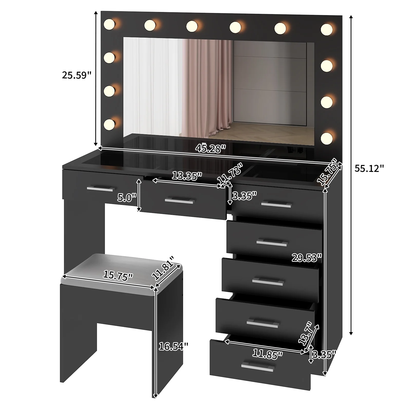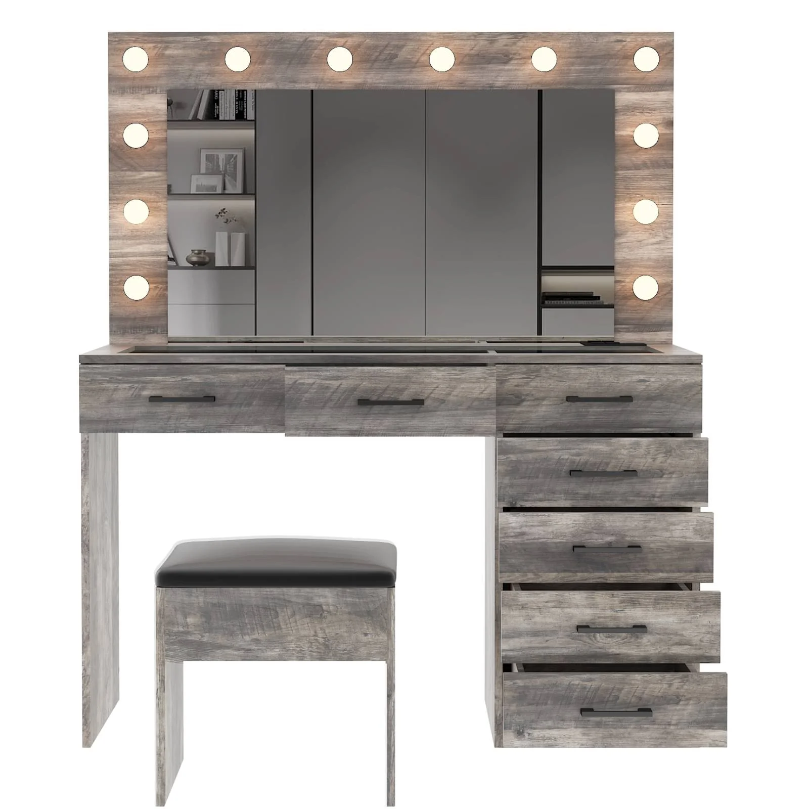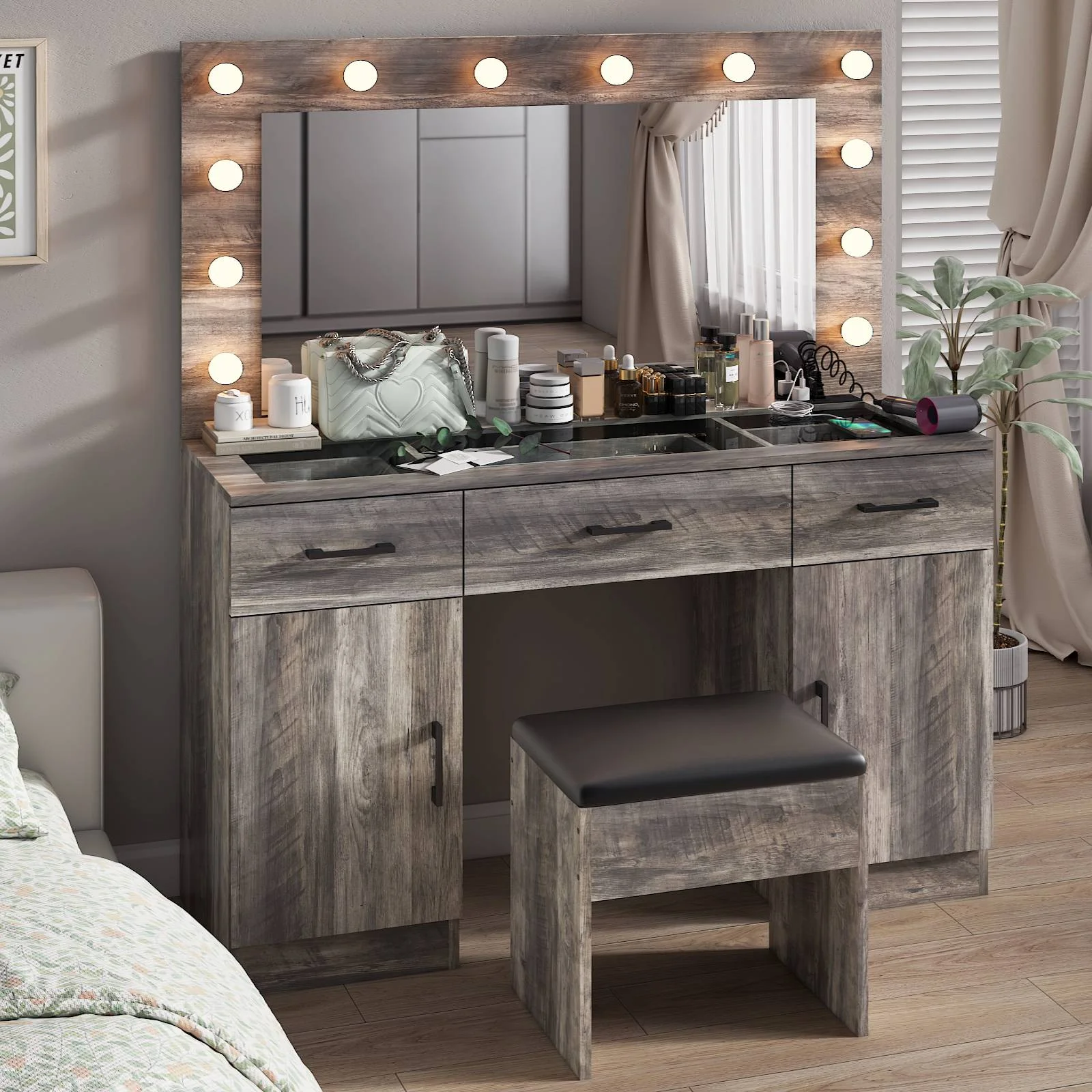 Experience the ultimate in modern beauty with this makeup vanity. Designed to elevate your daily routine, this vanity table set combines functionality with style. The vanity desk features a stunning visual glass surface, 9 spacious drawers for ample storage, an integrated charging outlet, and adjustable tri-color lighting. Complete with a large, seamless glass mirror, this dressing table is perfect for achieving flawless makeup and styling. Transform your space and enhance your beauty routine with this sophisticated makeup vanity.