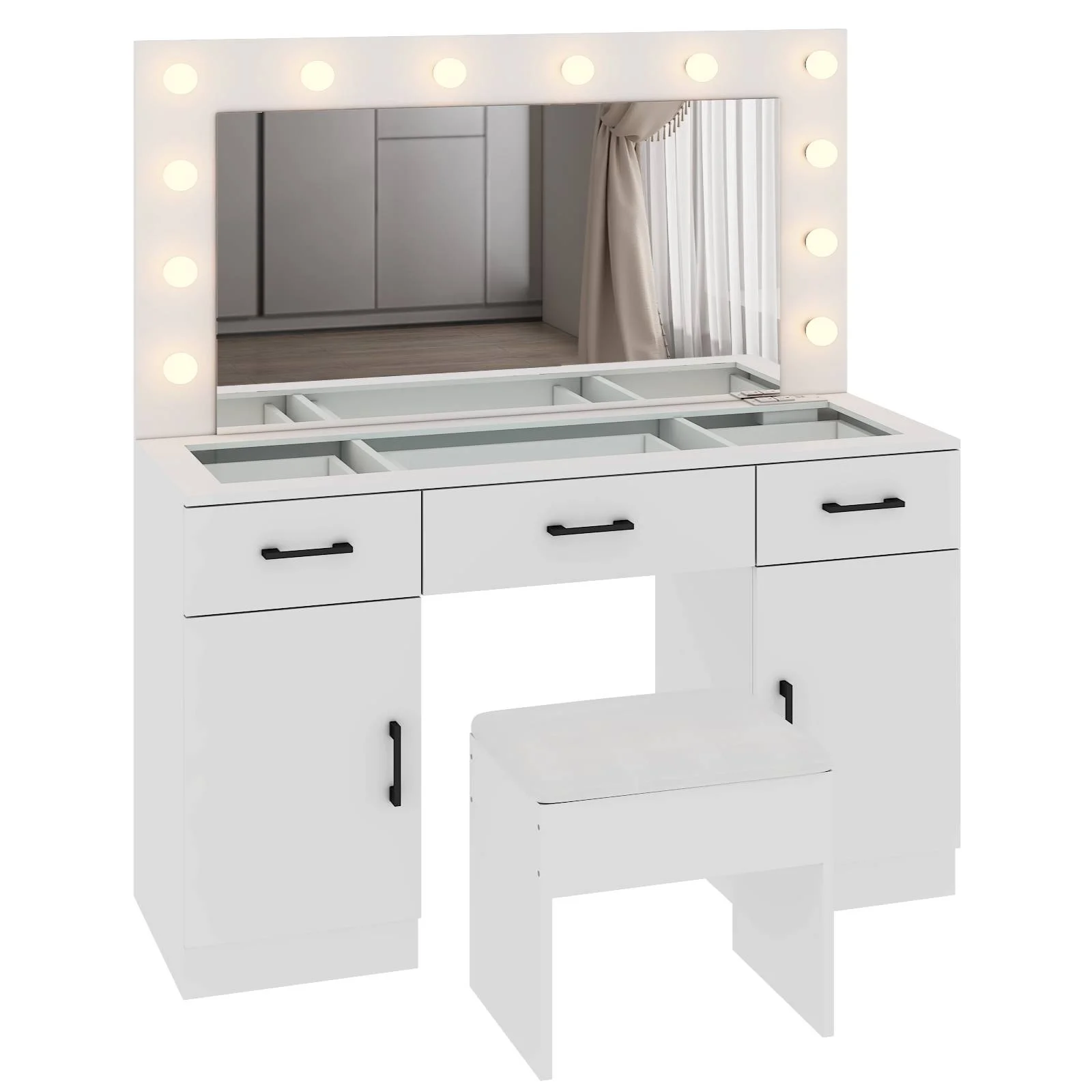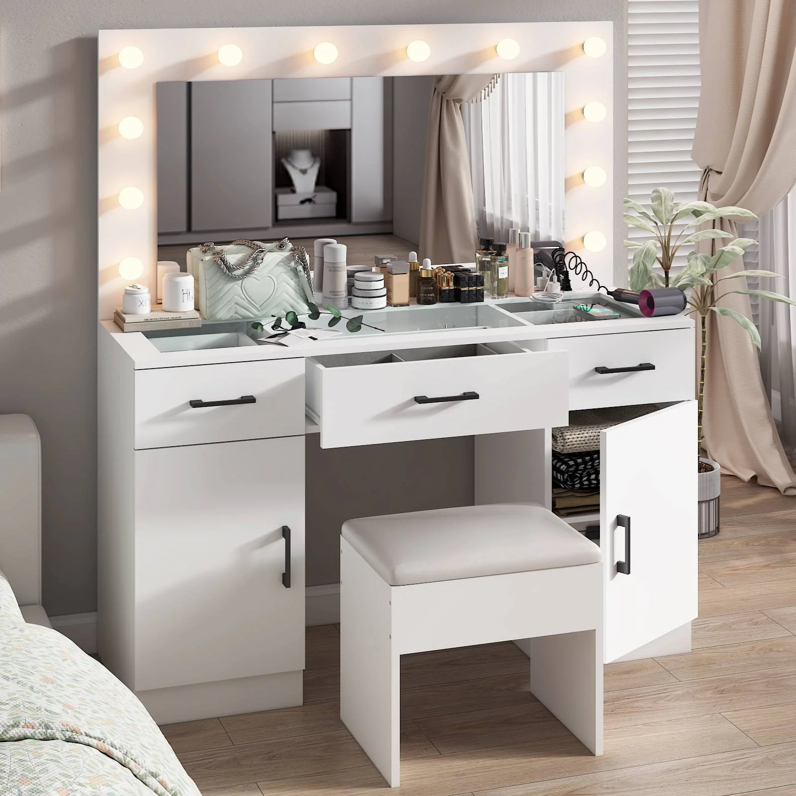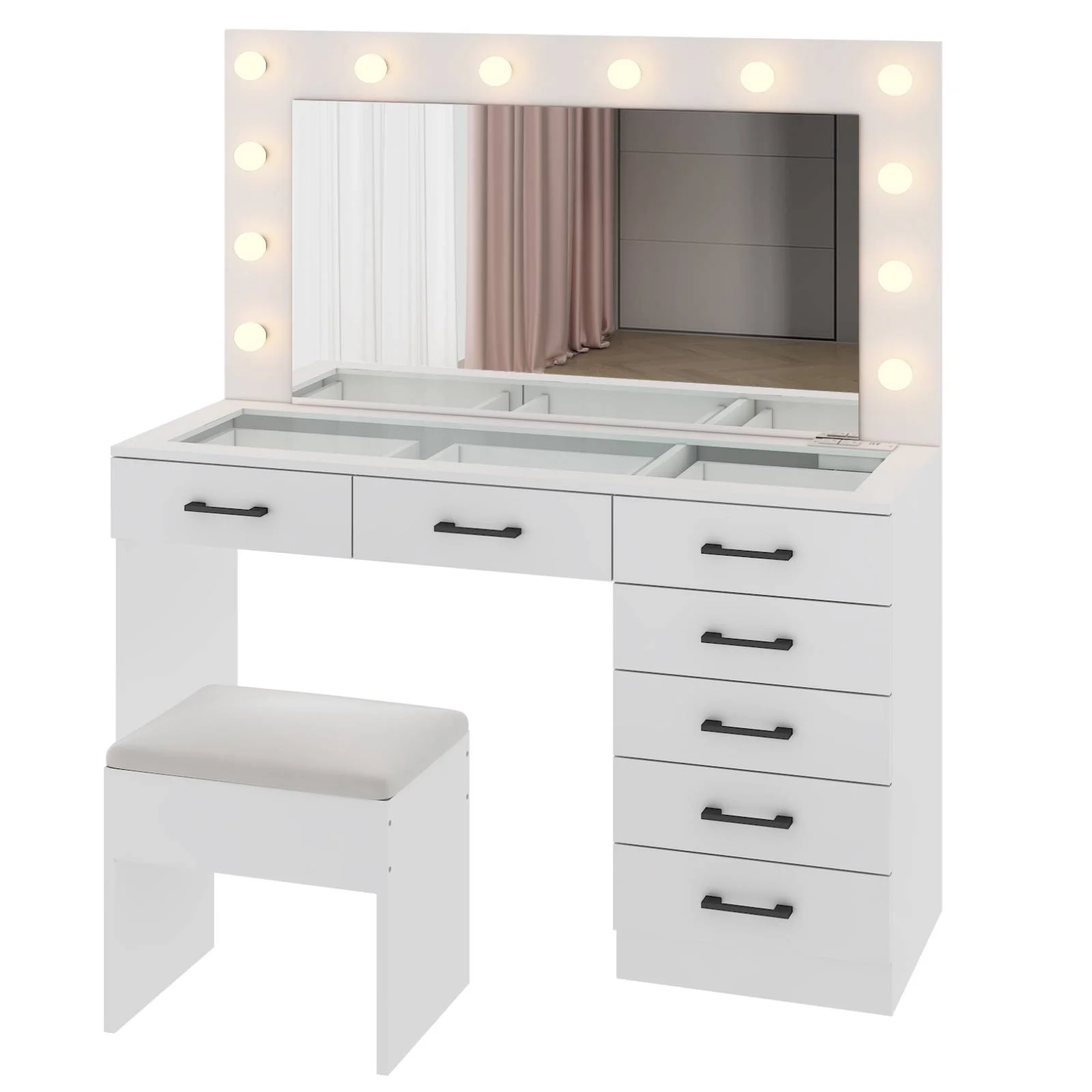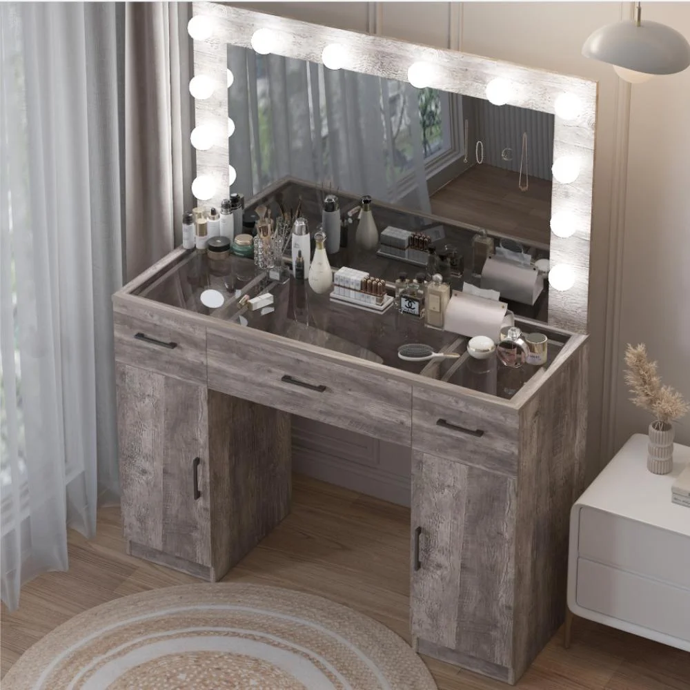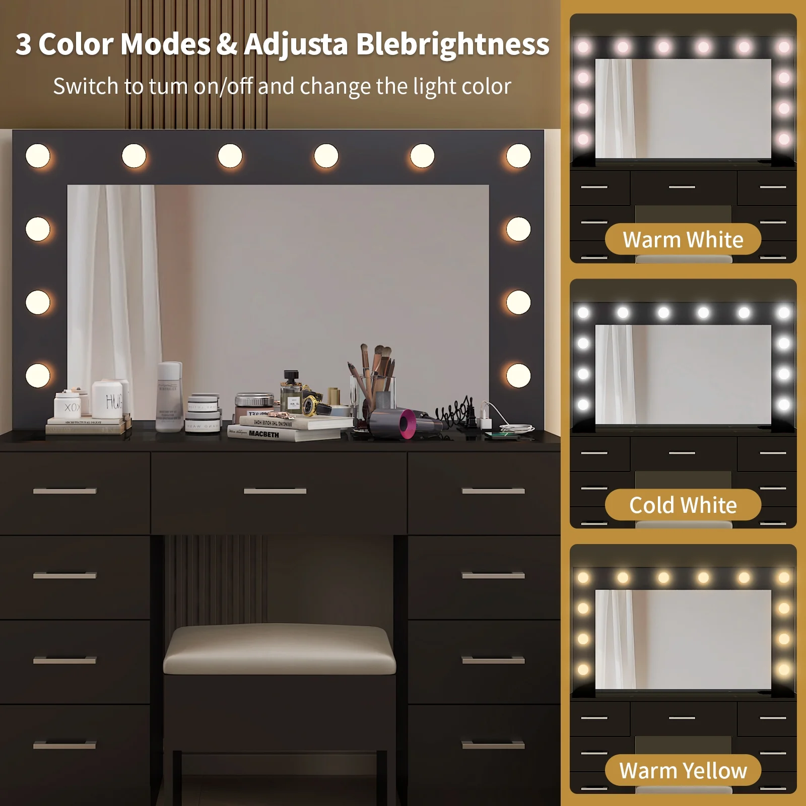 Customize your lighting experience with the dressing table's adjustable tri-color lighting. Whether you prefer warm, cool, or natural tones, this feature ensures perfect lighting for every occasion. -