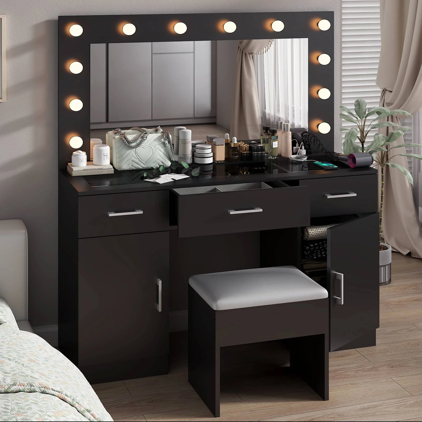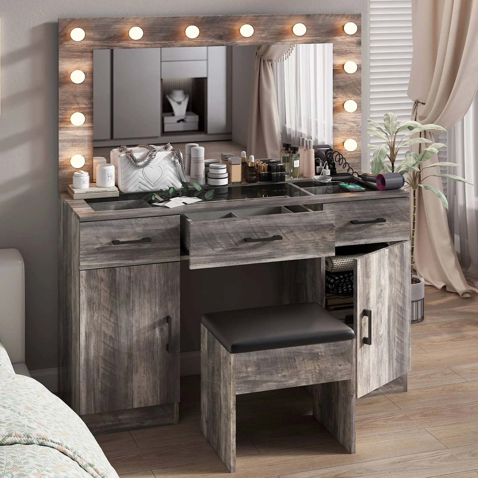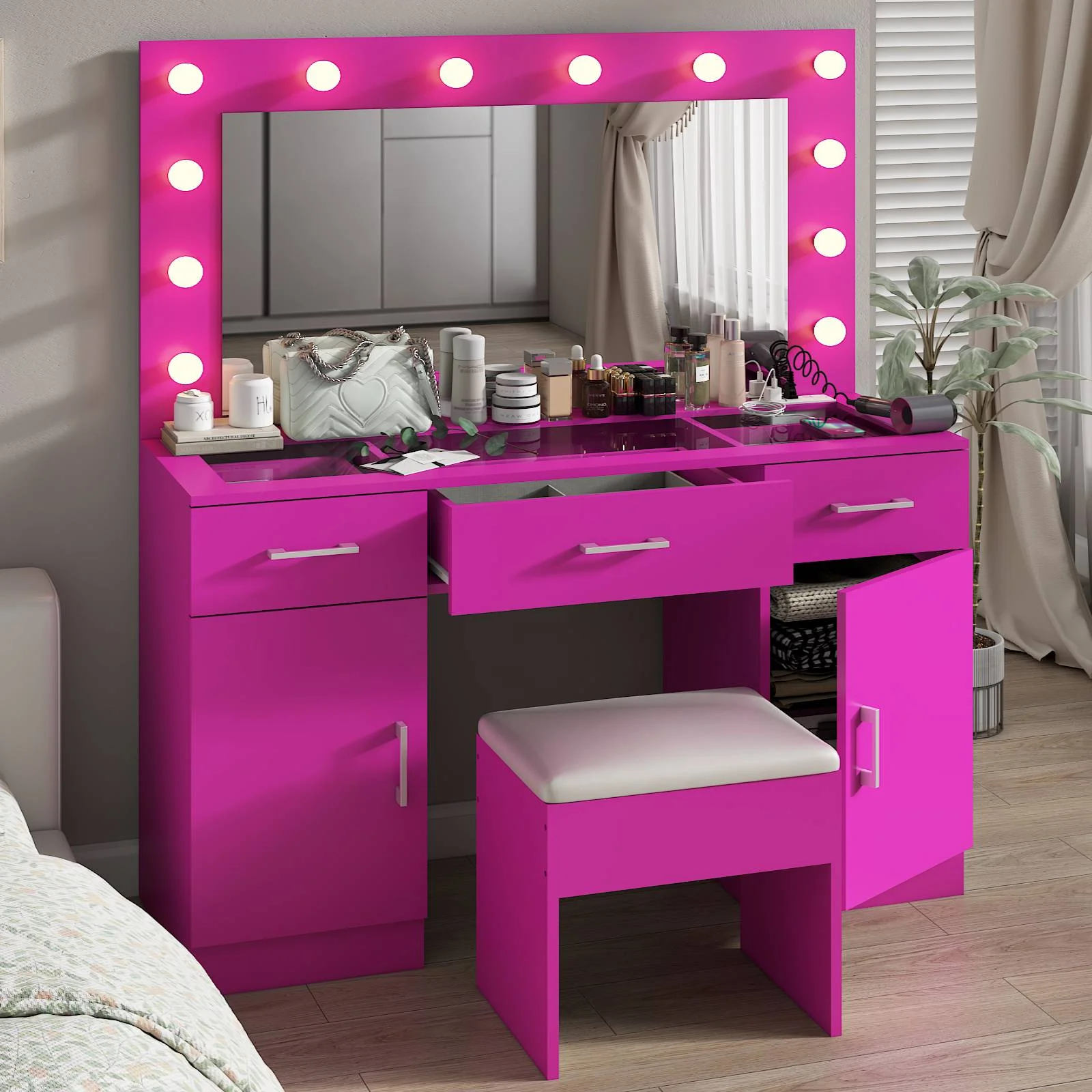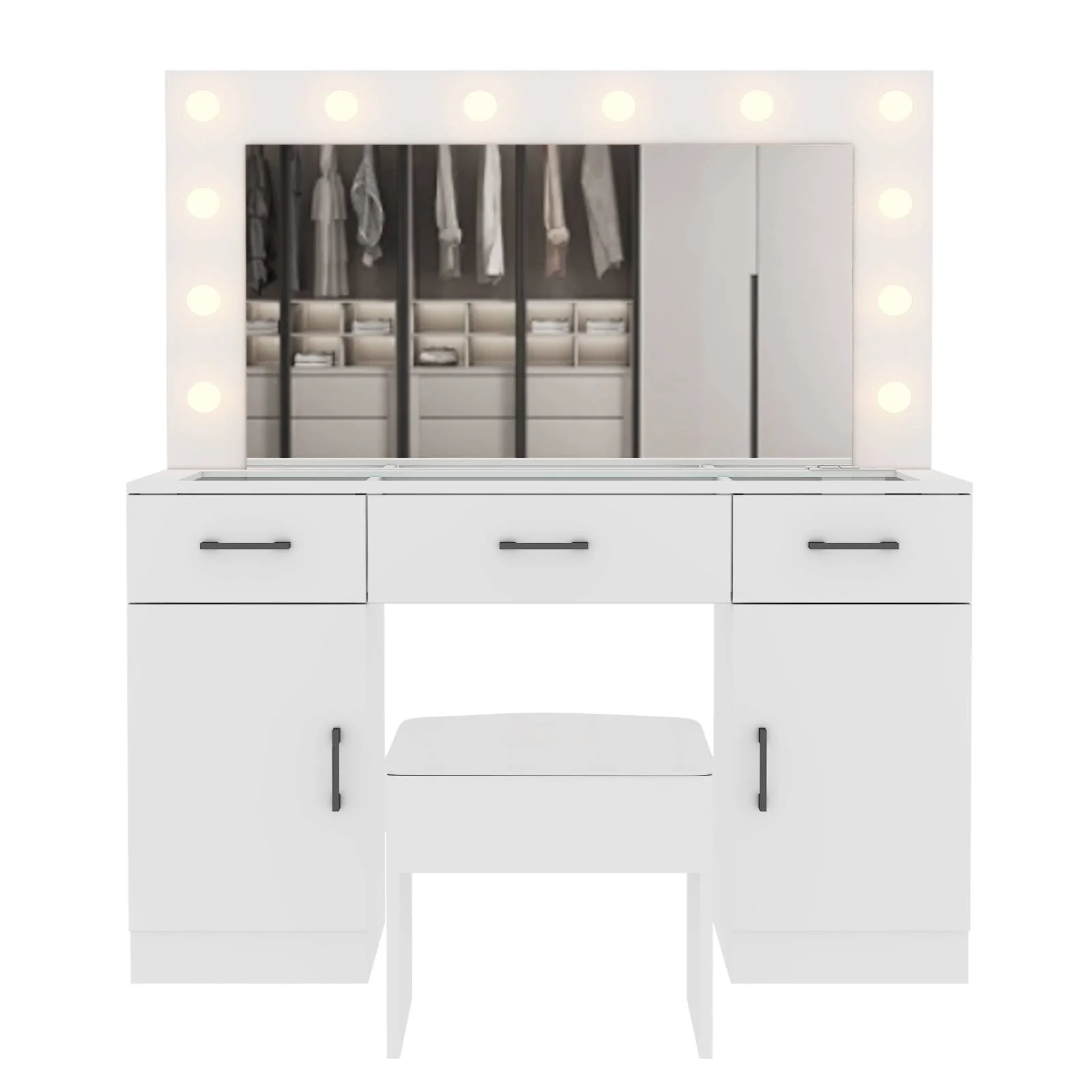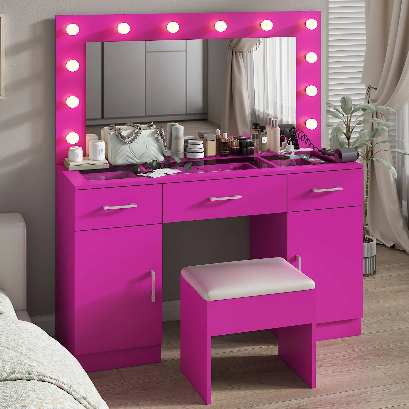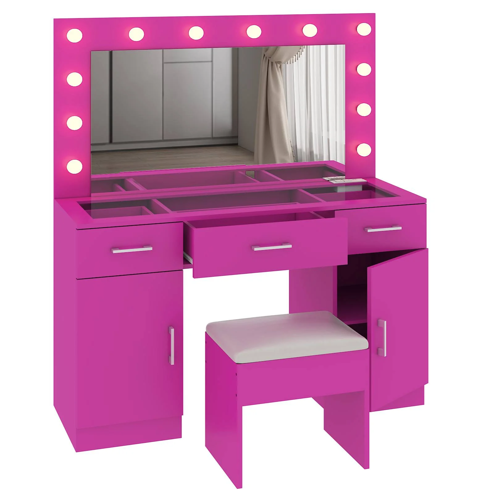 Customize your lighting experience with the dressing table's adjustable tri-color lighting. Whether you prefer warm, cool, or natural tones, this feature ensures perfect lighting for every occasion. -