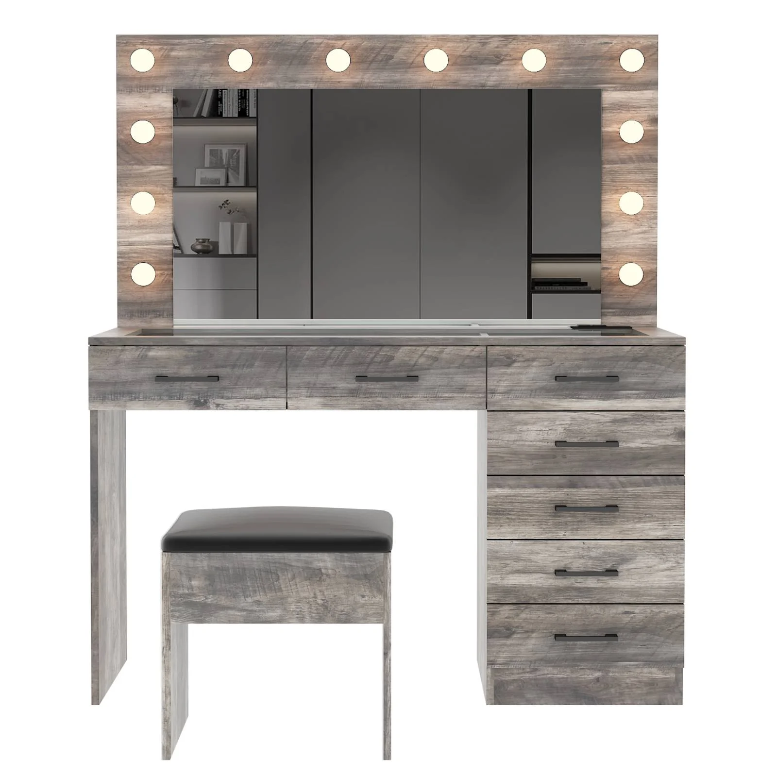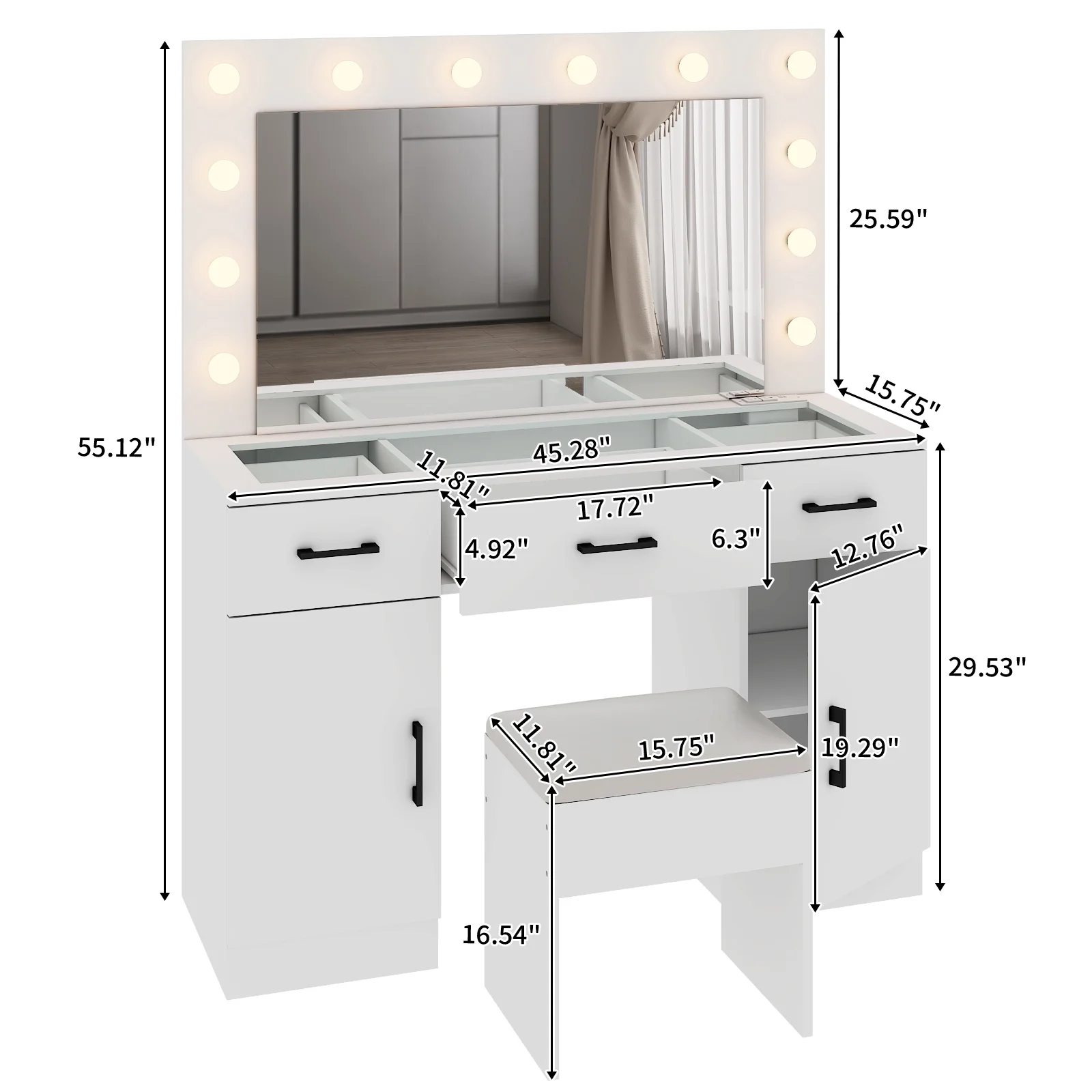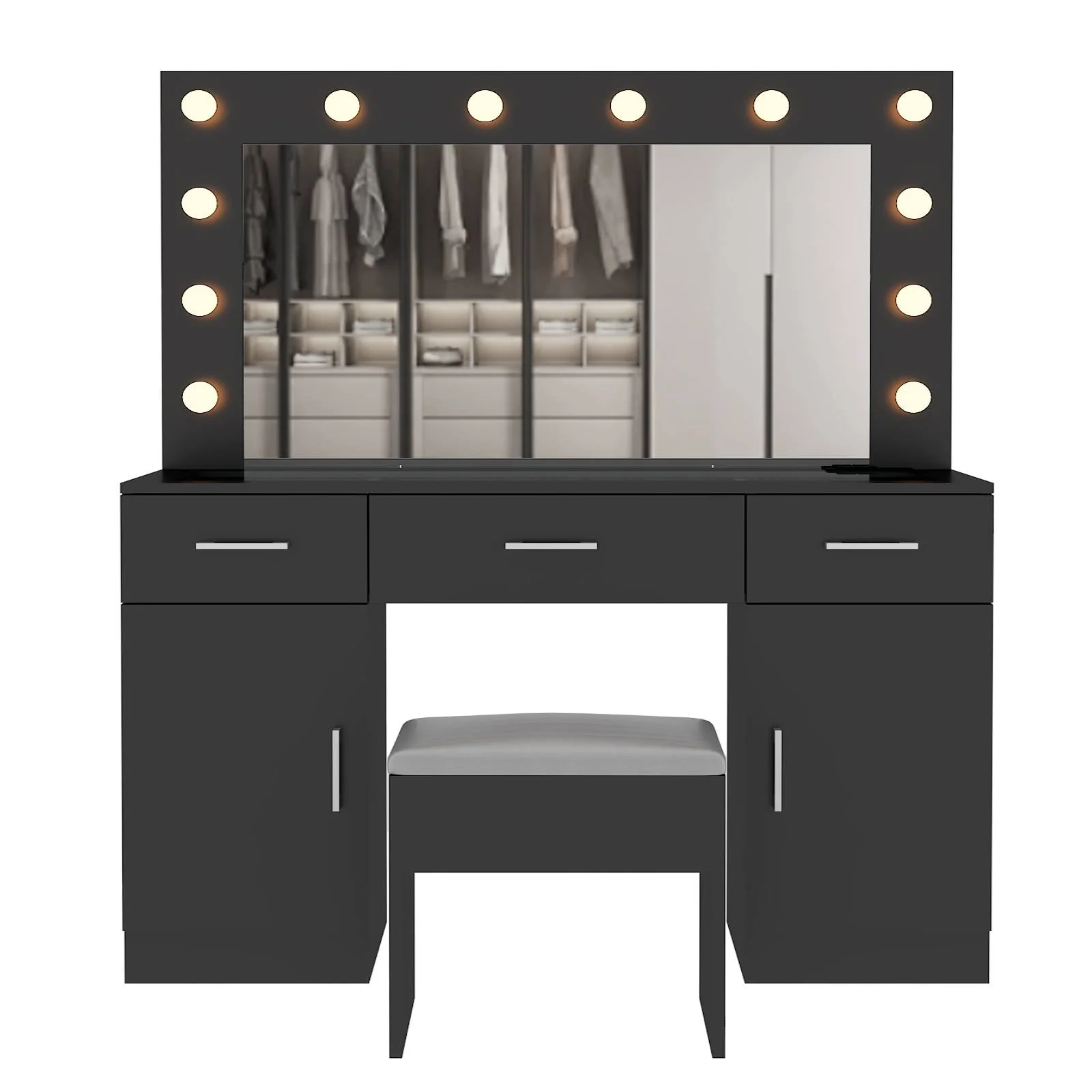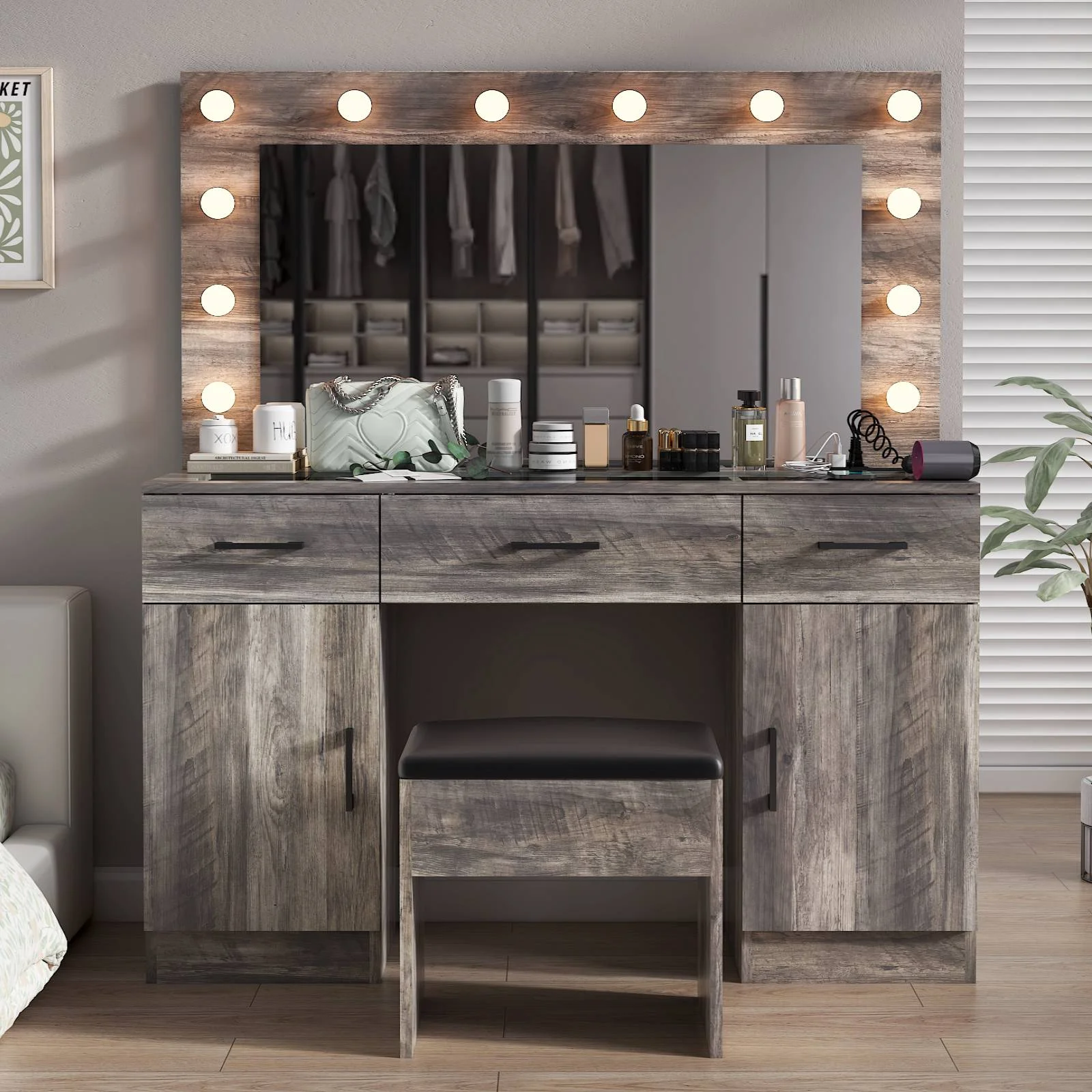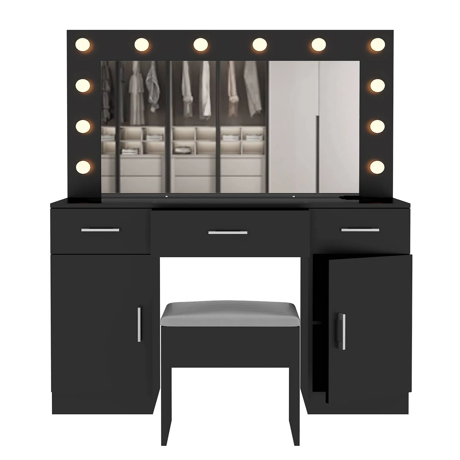 Customize your lighting experience with the dressing table's adjustable tri-color lighting. Whether you prefer warm, cool, or natural tones, this feature ensures perfect lighting for every occasion. -