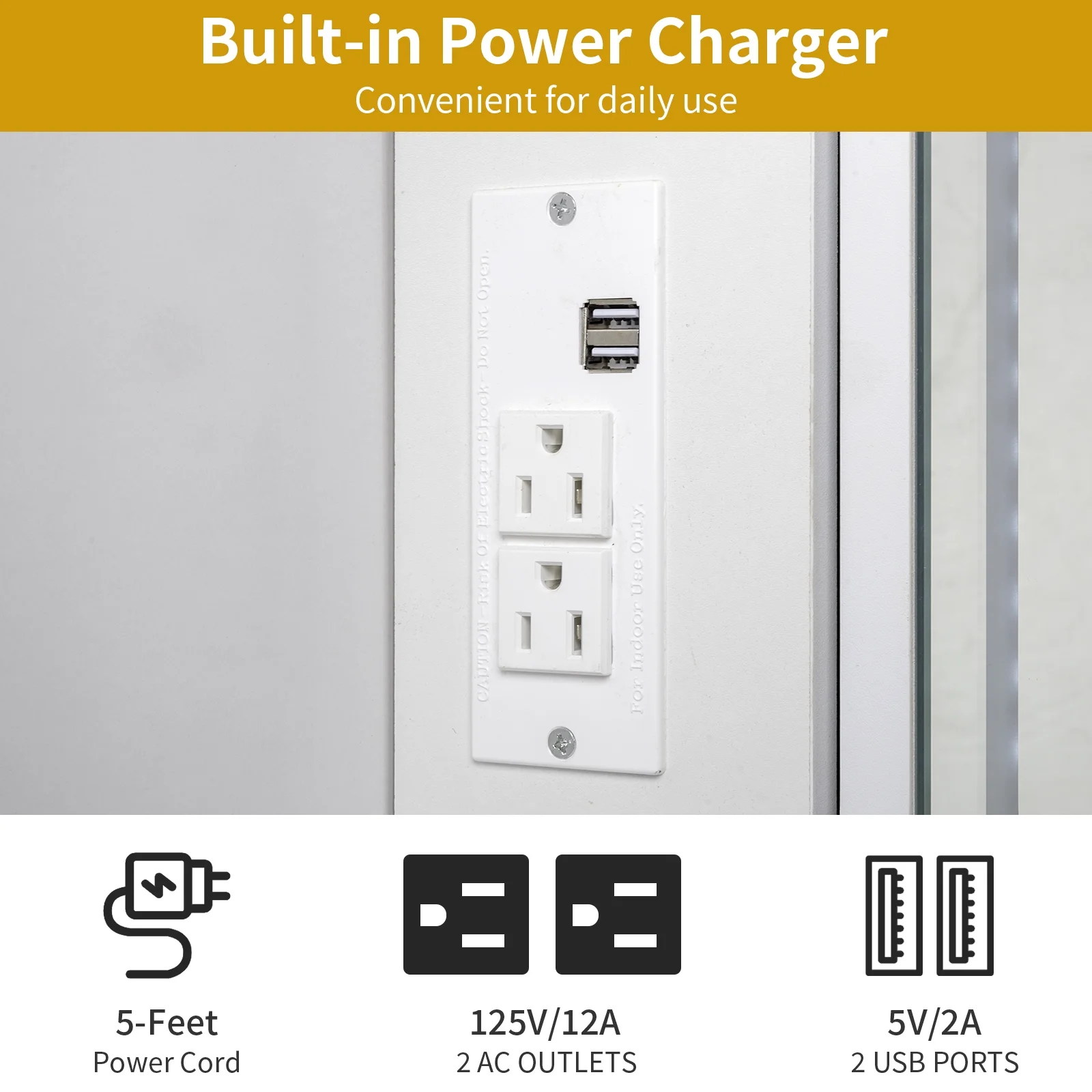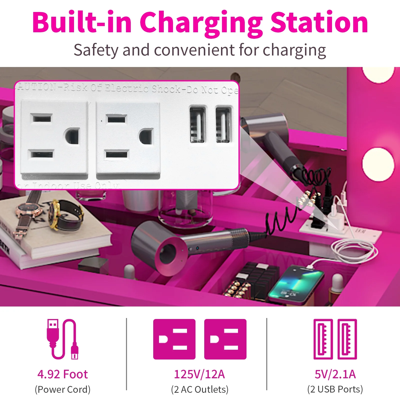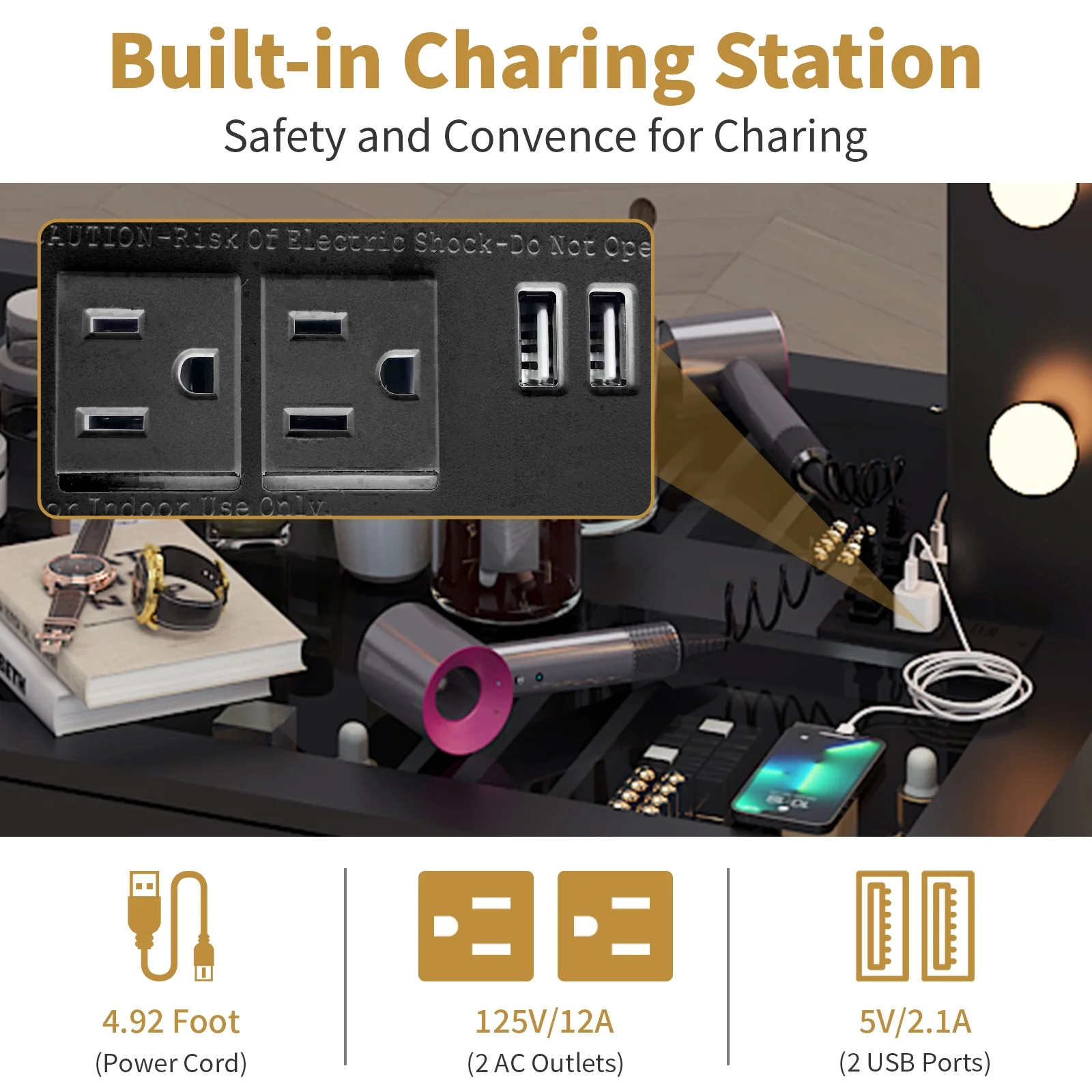 Enjoy the convenience of the vanity desk with an integrated charging outlet. Keep your devices charged while you prepare for the day or night. -
