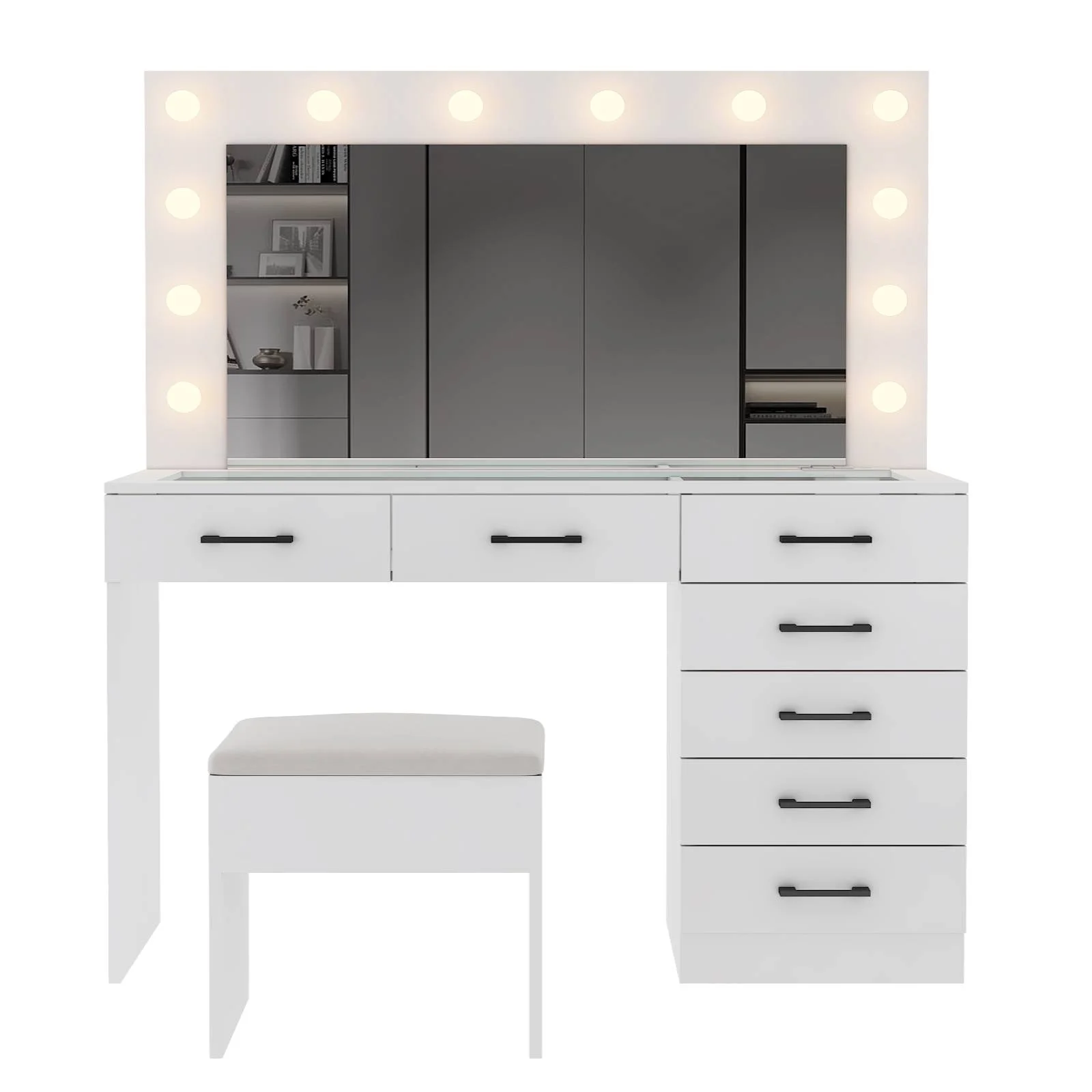 Admire your reflection in the large, seamless glass mirror of the makeup vanity. The expansive mirrored surface provides a full view, enhancing your makeup application and styling. -