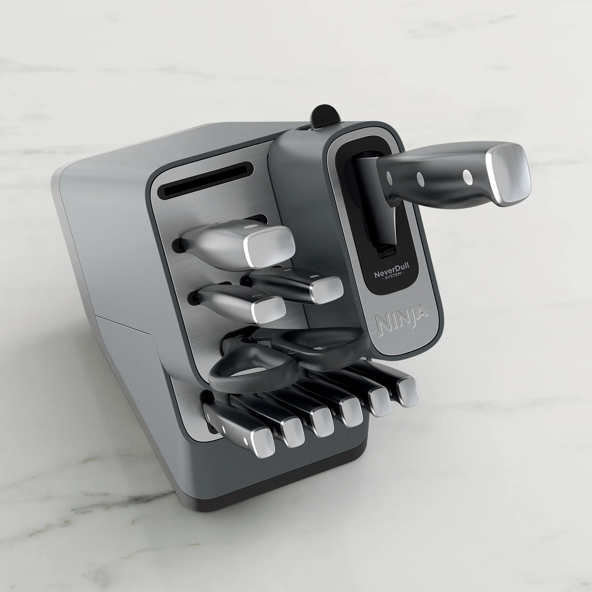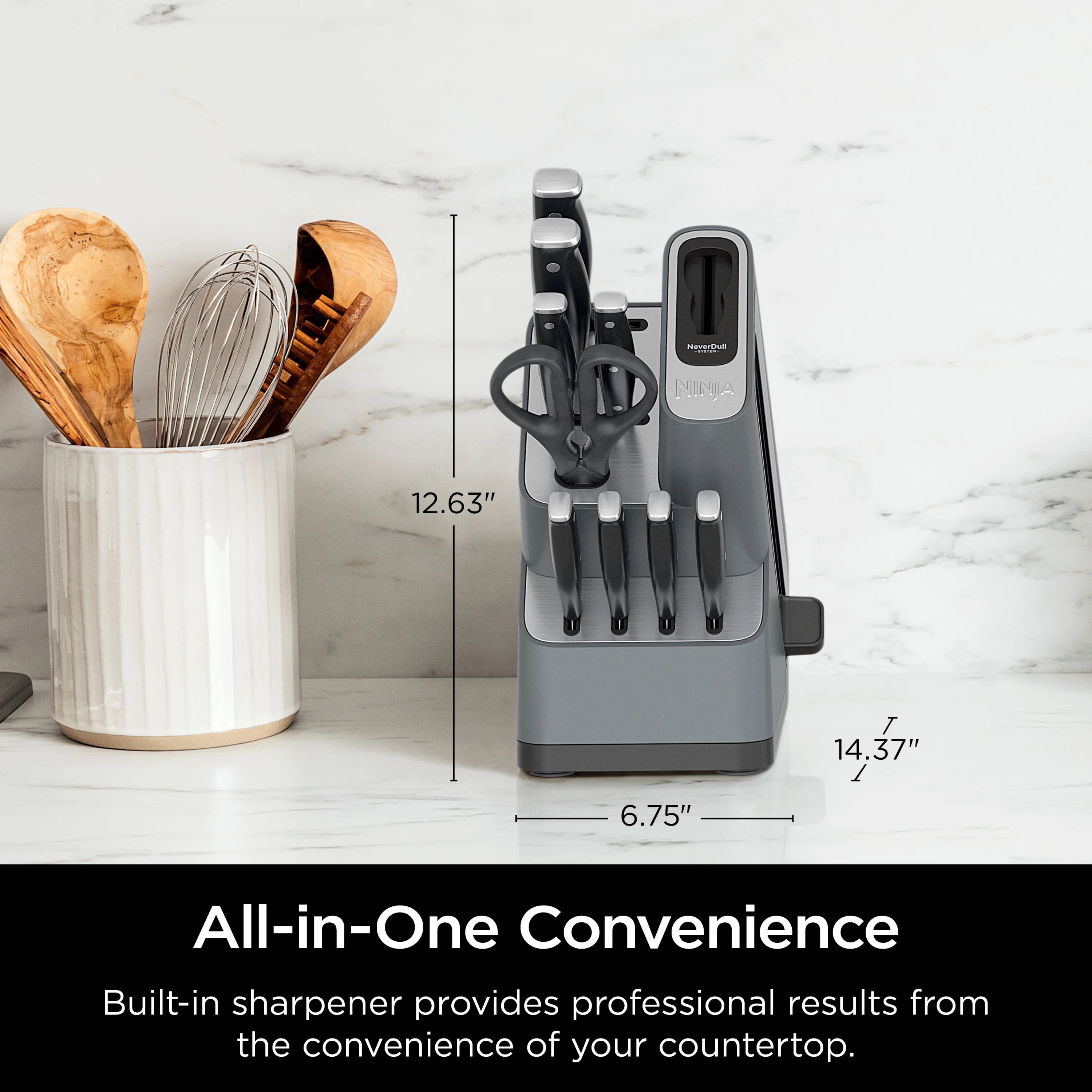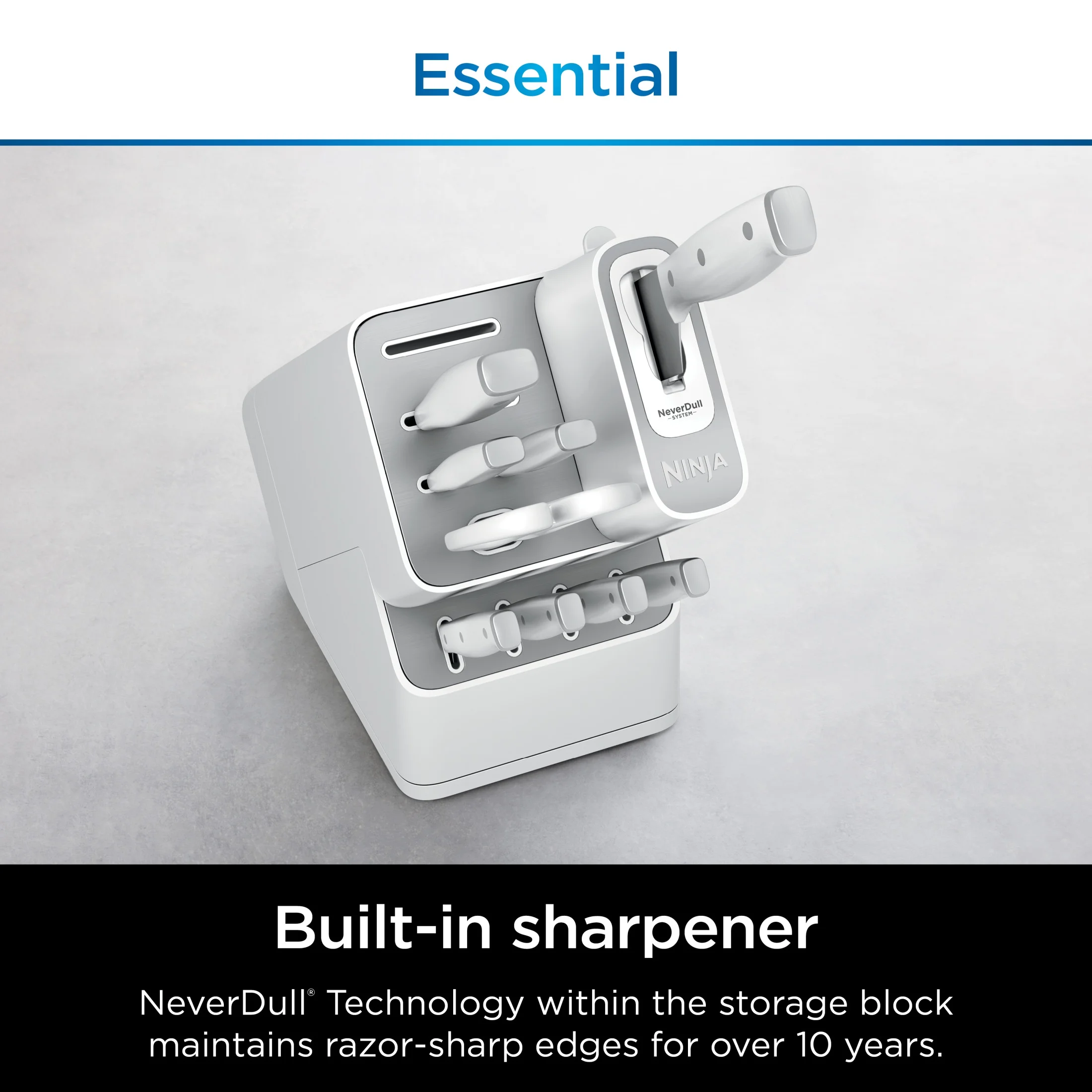 - BUILT-IN SHARPENER: NeverDull Technology is conveniently built into the storage block.