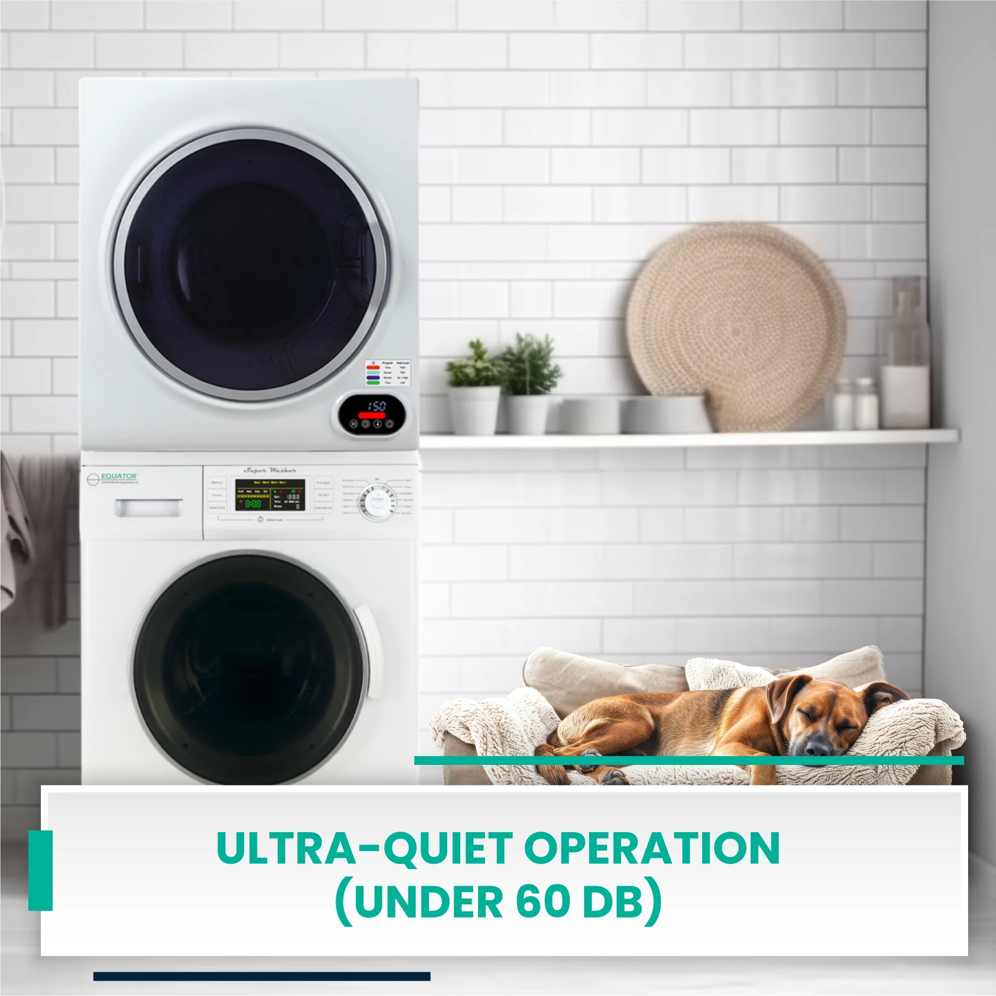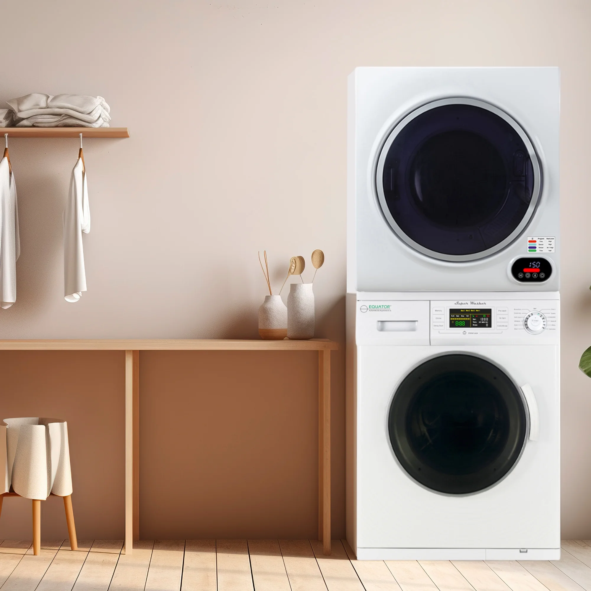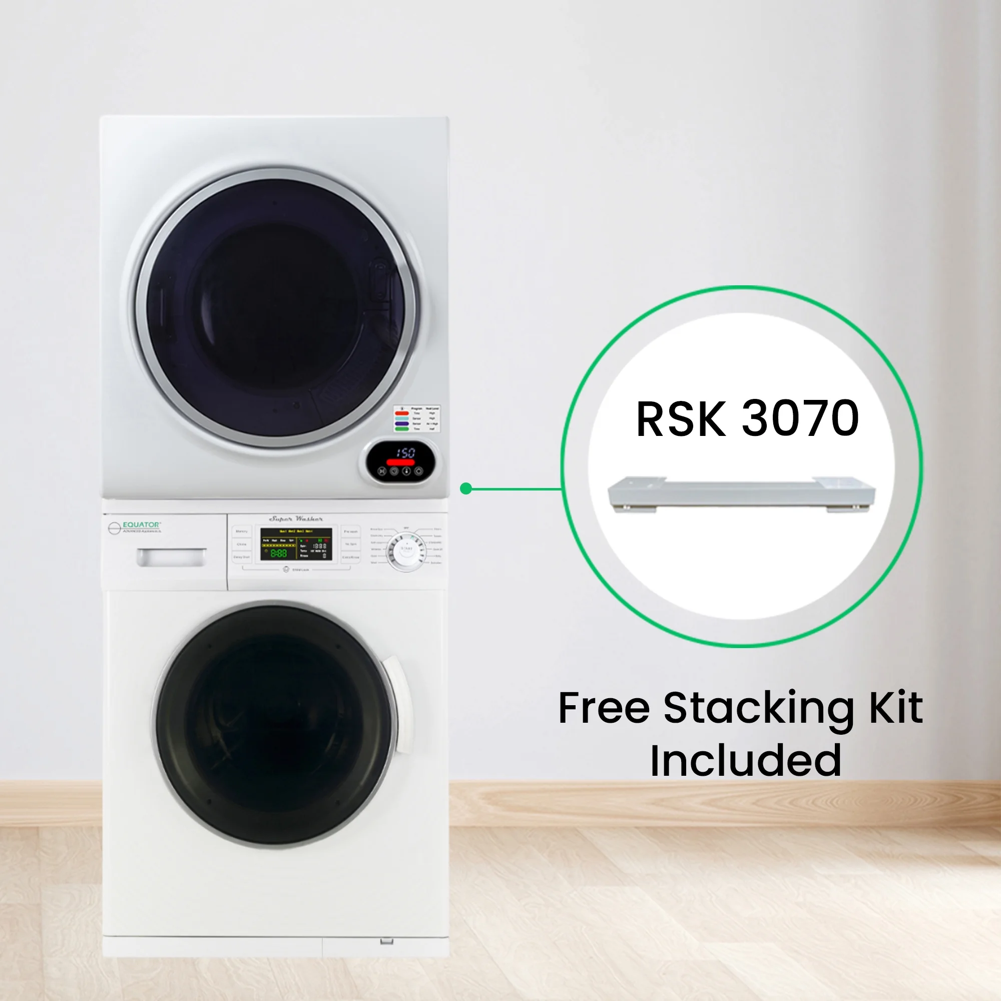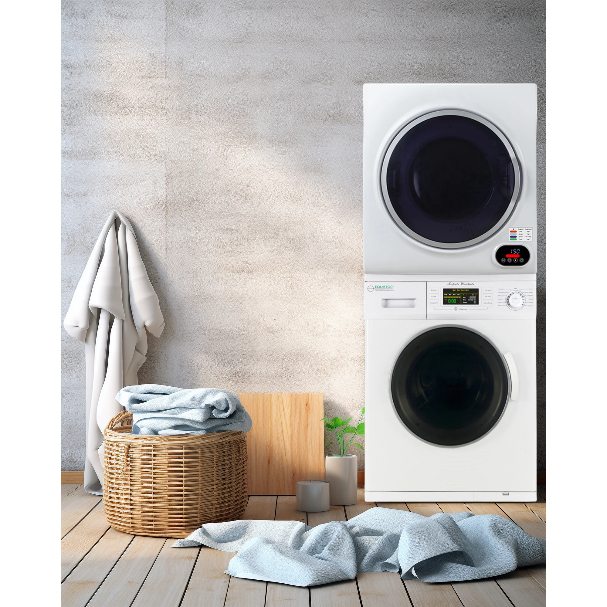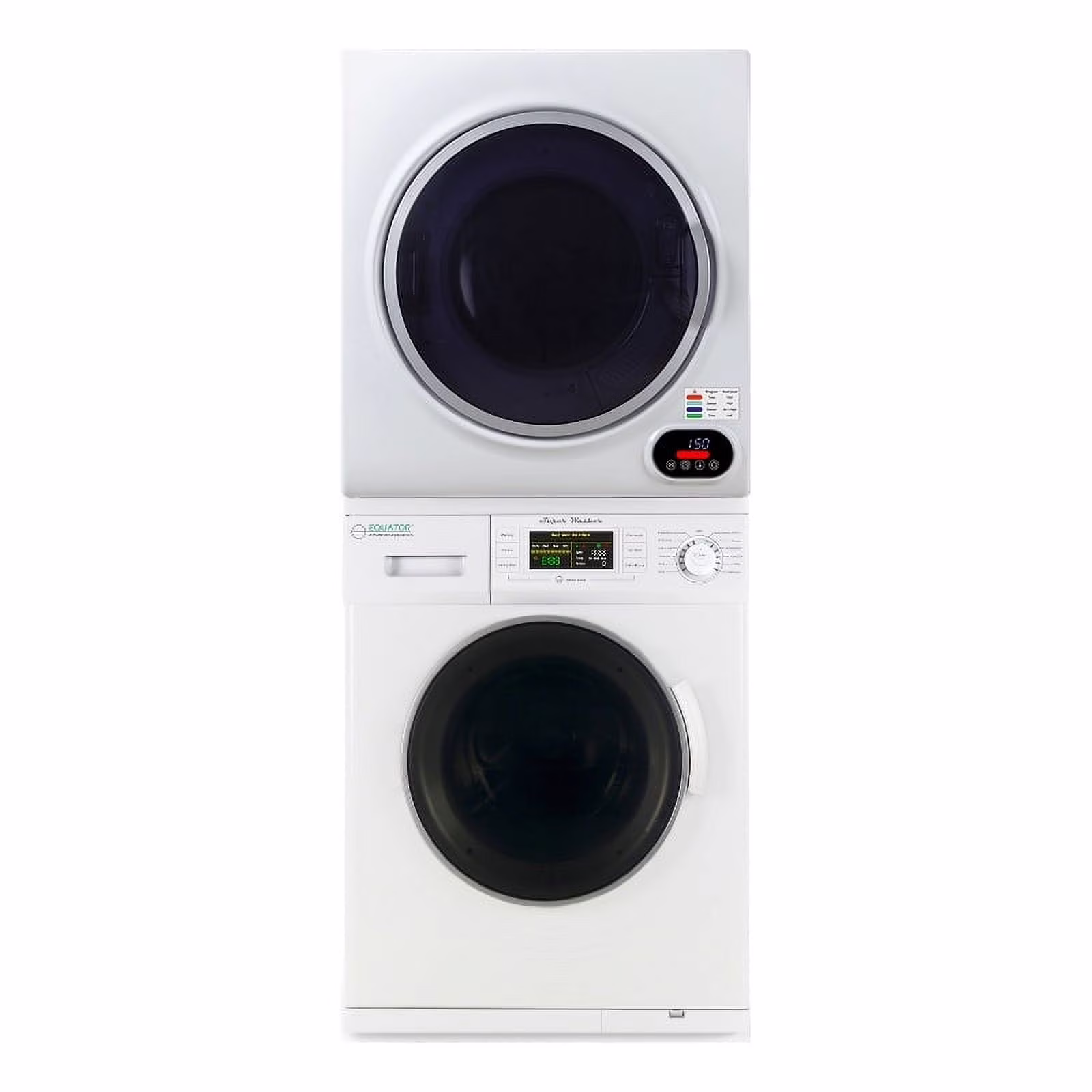"The Washer-Dryer set is a perfect solution to all your laundry needs. The front-loading is 13 lbs. The washer cleans small loads efficiently, with minimal water and electricity usage. It has 12 programs including Quick Wash, Winterizes, and Quiet. The Compact Short Dryer powered by Equatora??s smart digital drying system dries your whole array of laundry easily. The 852 dryer maximizes your laundry efficiency, without compromising drying speed or design. Featuring touch screen digital controls, the Compact Short Dryer looks as good as it functions, with a sleek modern design, including a transparent door reminiscent of popular full-size home dryer models. Both items feature a door safety switch and premium steel drums. At just 60 x 23.5 x 22 inches (HxWxD) when stacked, this compact stackable set fits into homes, apartments, or anywhere. Space is not an issue. Stacking Kit needs to be purchased separately."