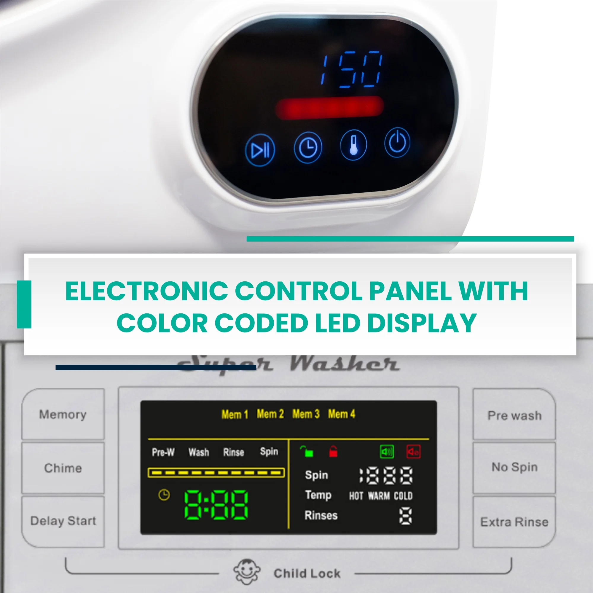 - ELECTRONIC CONTROL PANEL WITH COLOR CODED LED DISPLAY- Smart phone inspired 3 color LCD display, lights up operations in the control panel with easy-to-read symbols