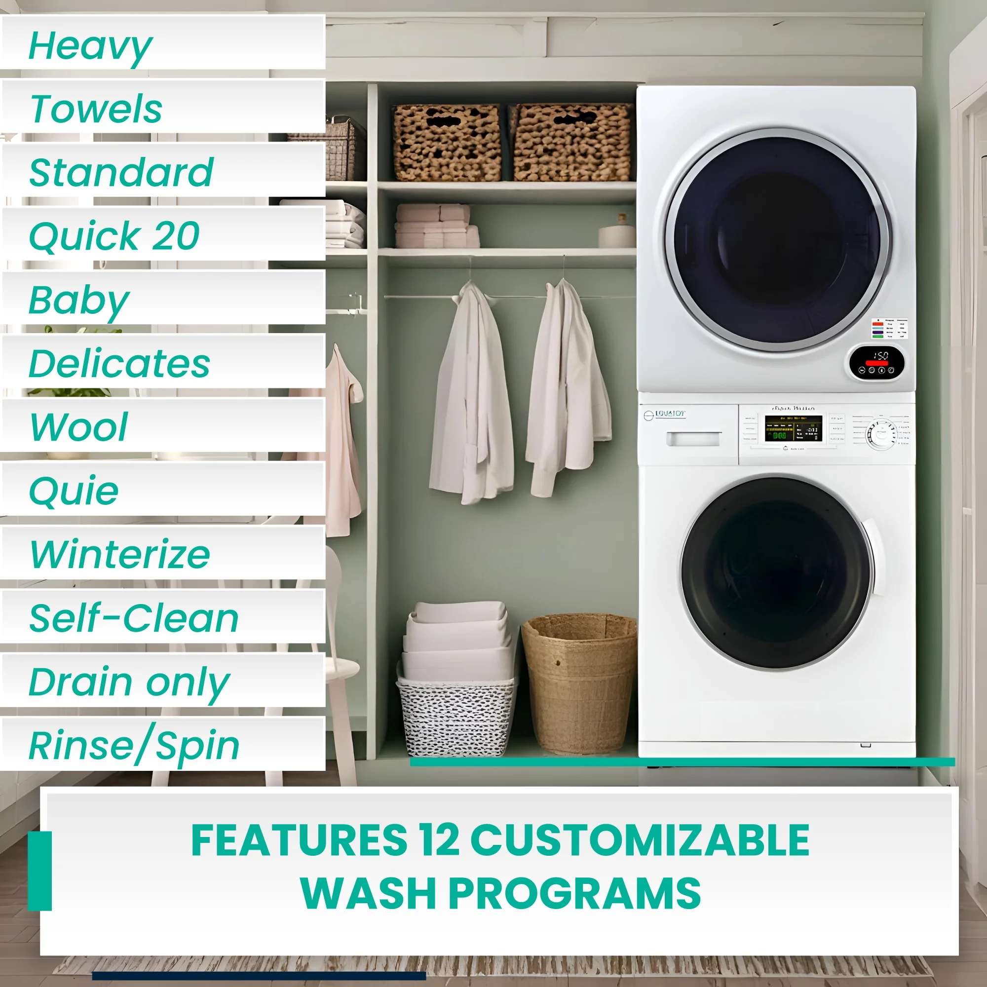 - 12 WASH PROGRAMS- Heavy, Towels, Standard, Quick 20, Baby, Delicates, Wool, Quiet, Winterize, Self-Clean, Drain only, Rinse/Spin