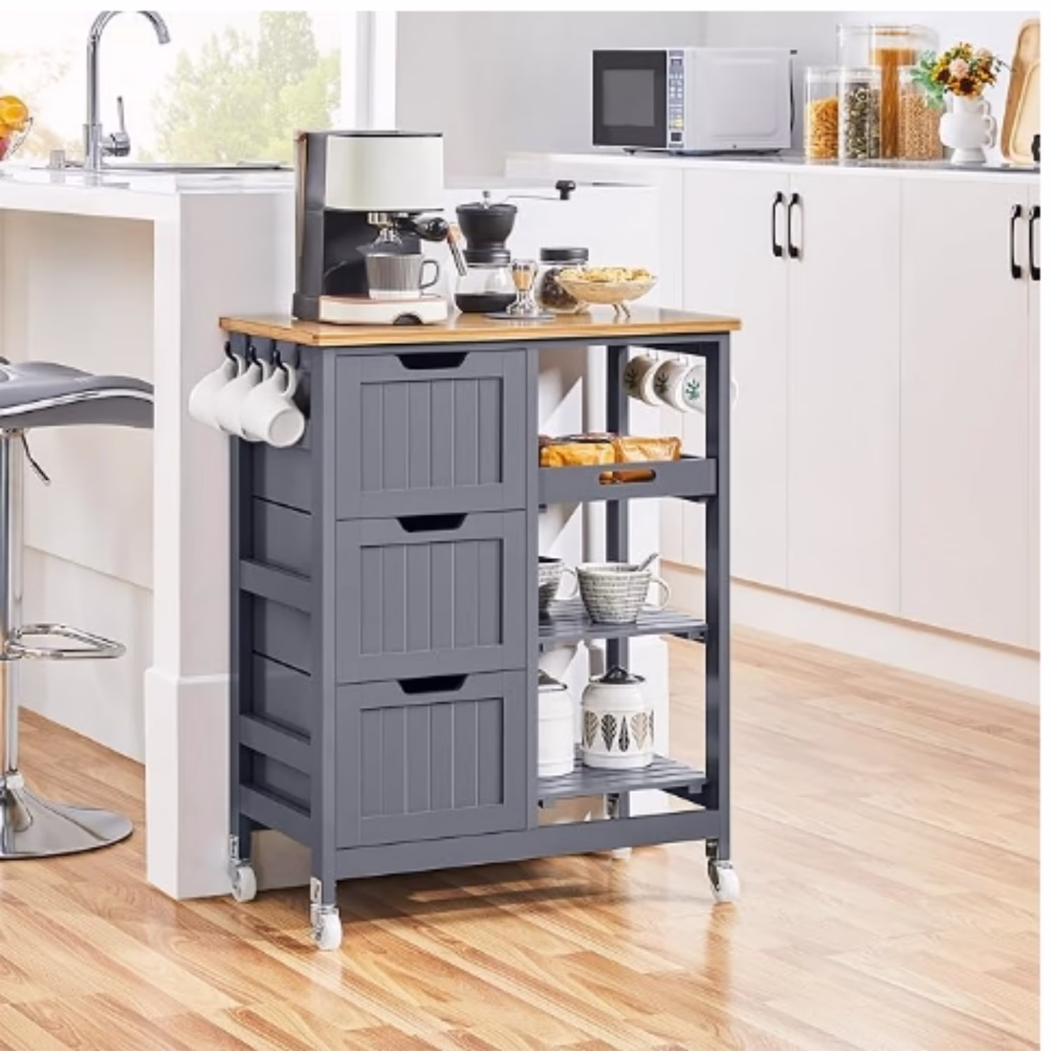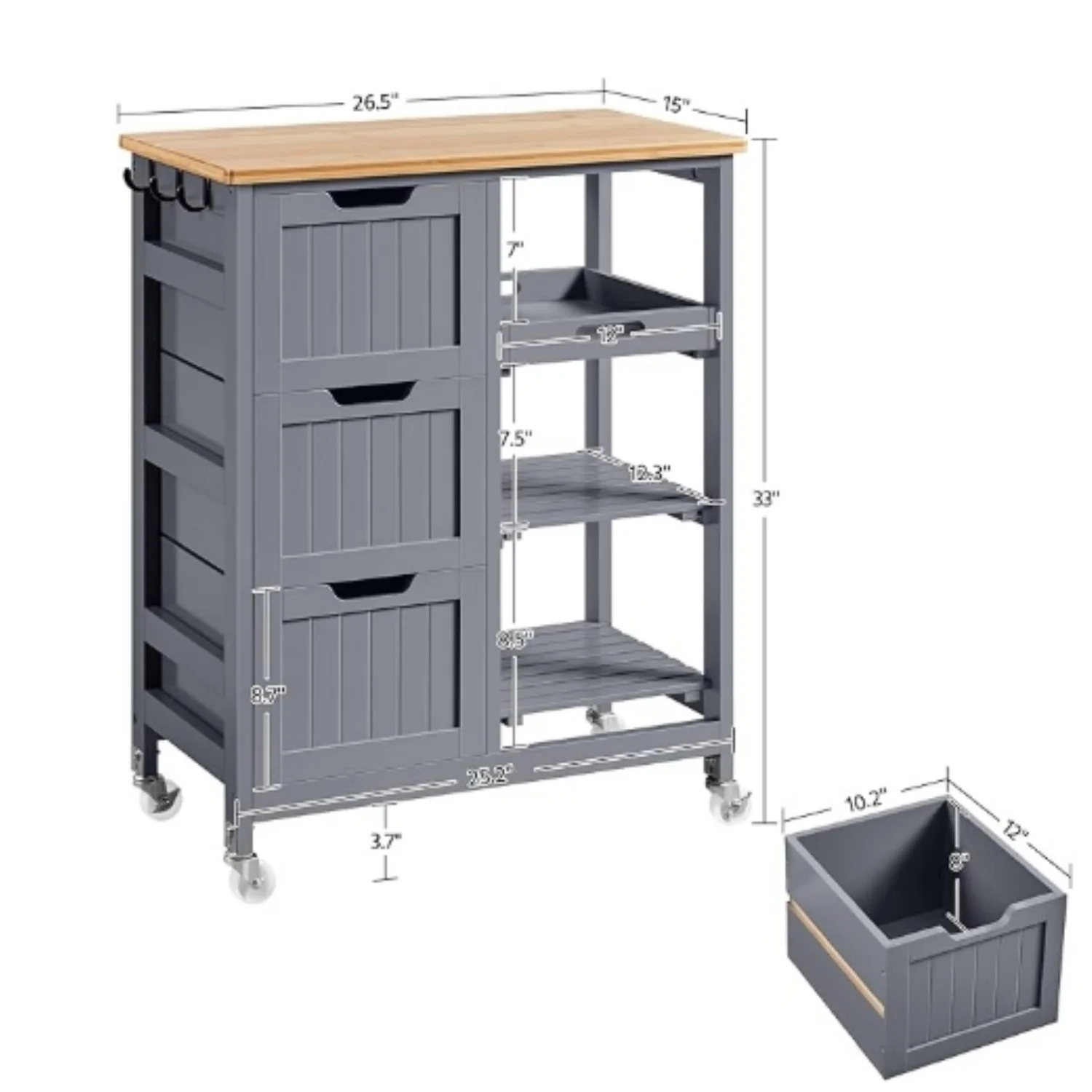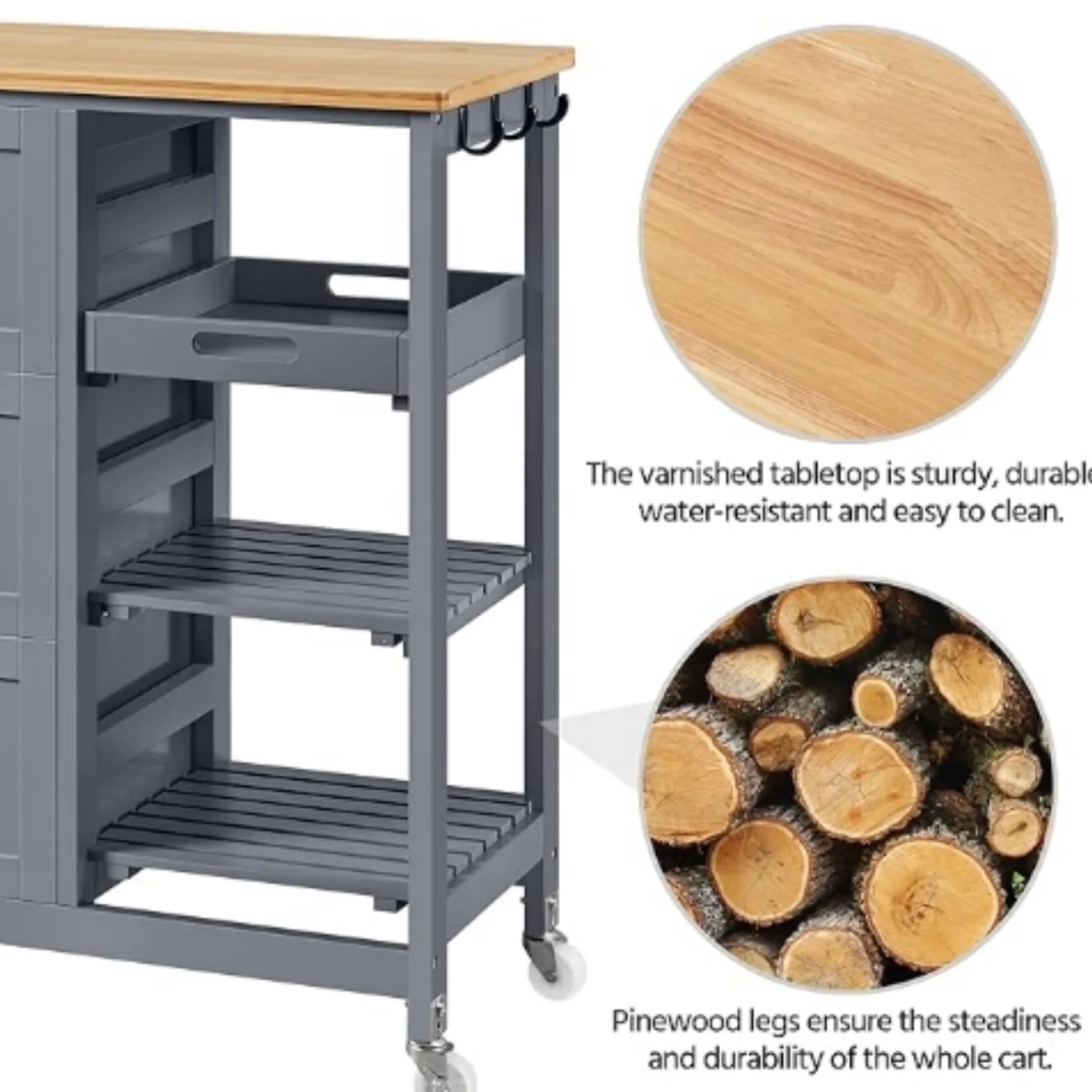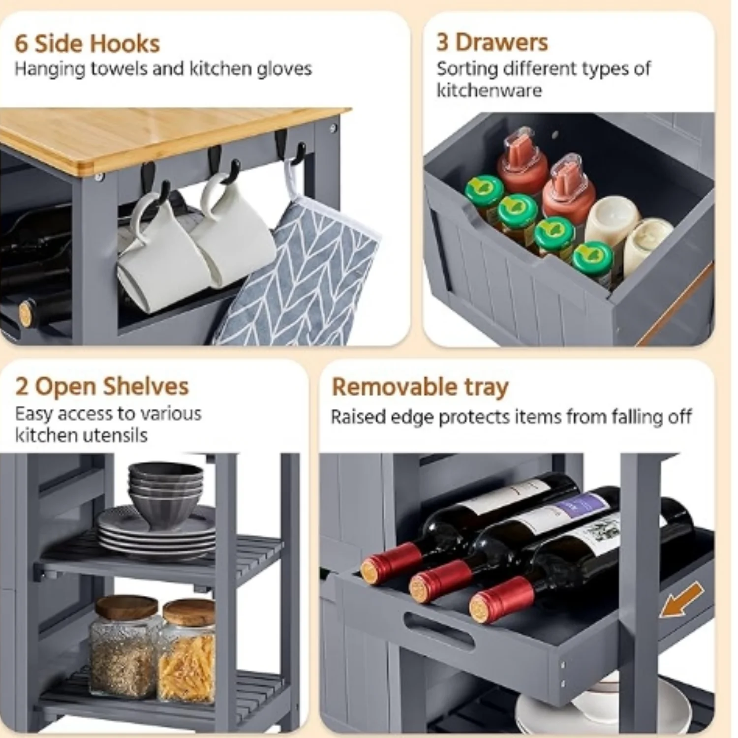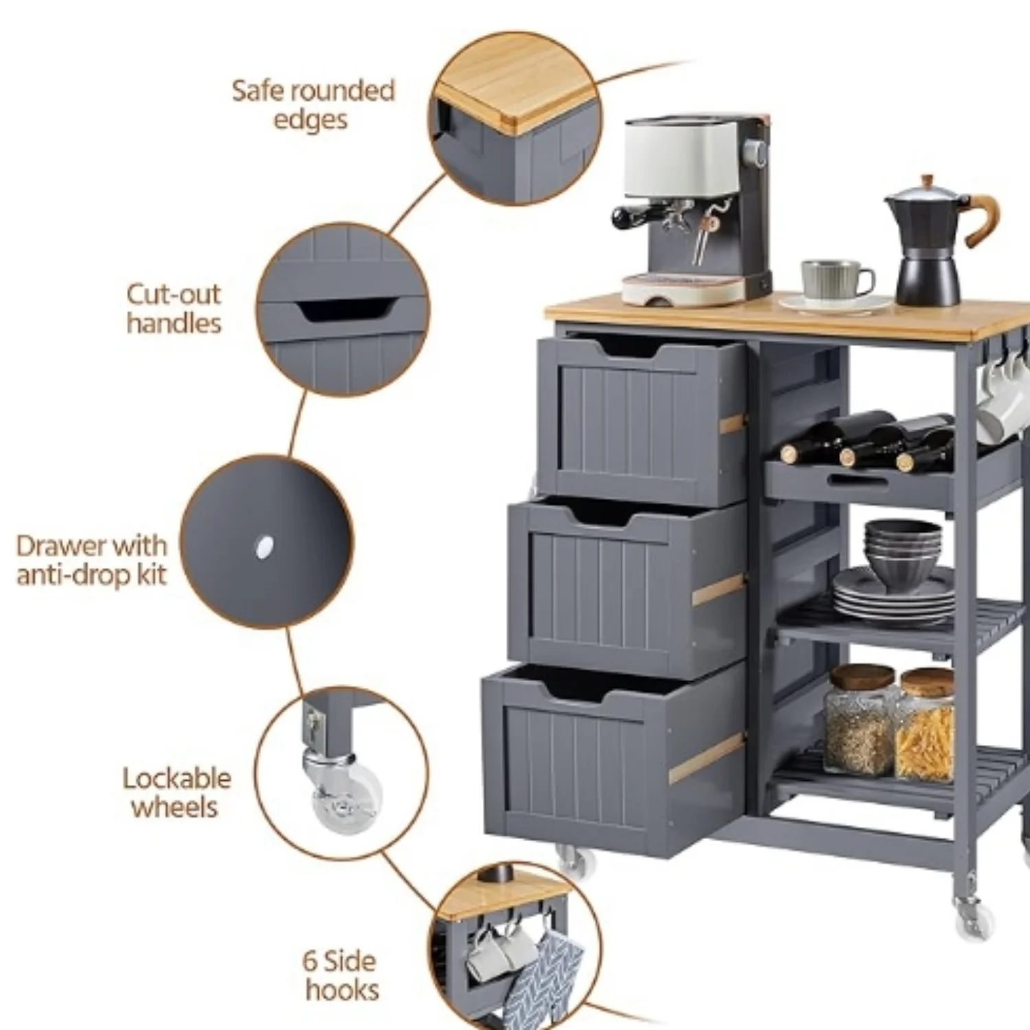Kitchen Island Cart on Wheels with Storage, Rolling Bar Cart with Solid Wood Top and 3 Drawers, 3 Removable Shelves, Serving Utility Carts for Dining Room/Small Kitchen, Dark Gray ???
