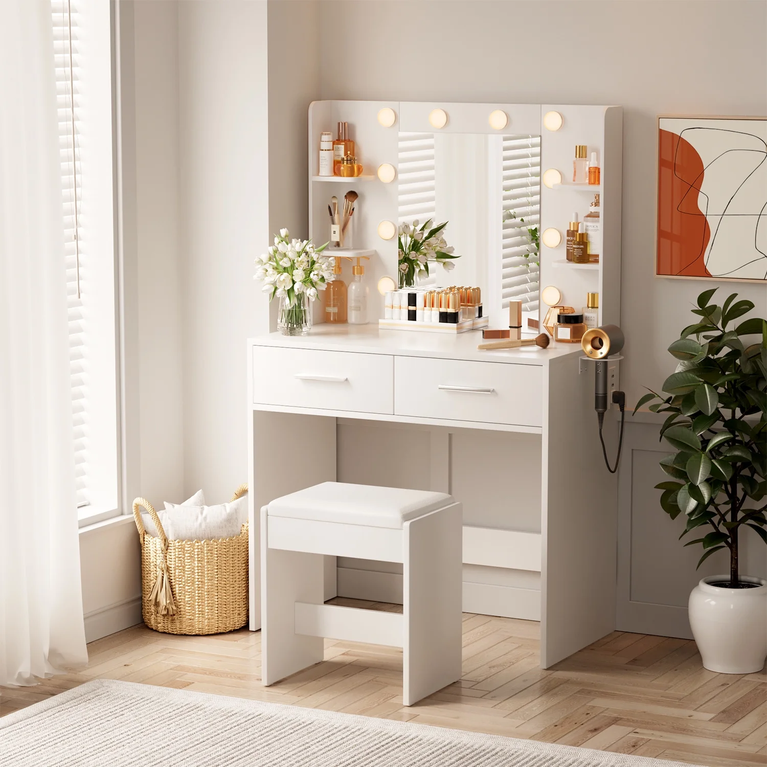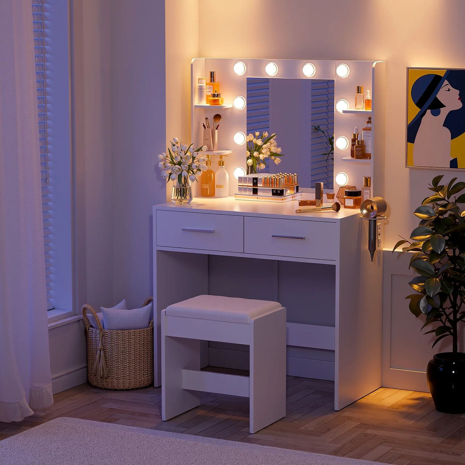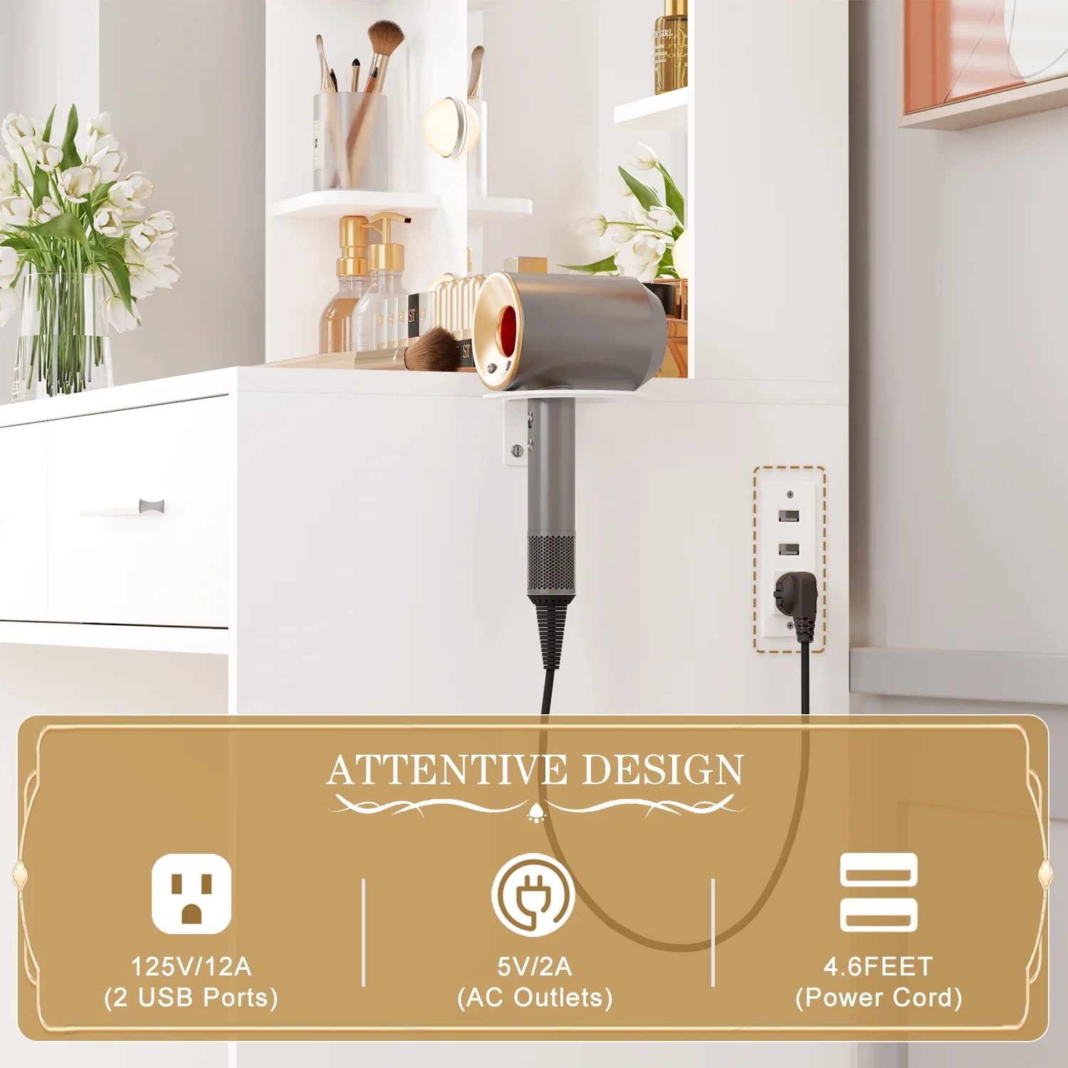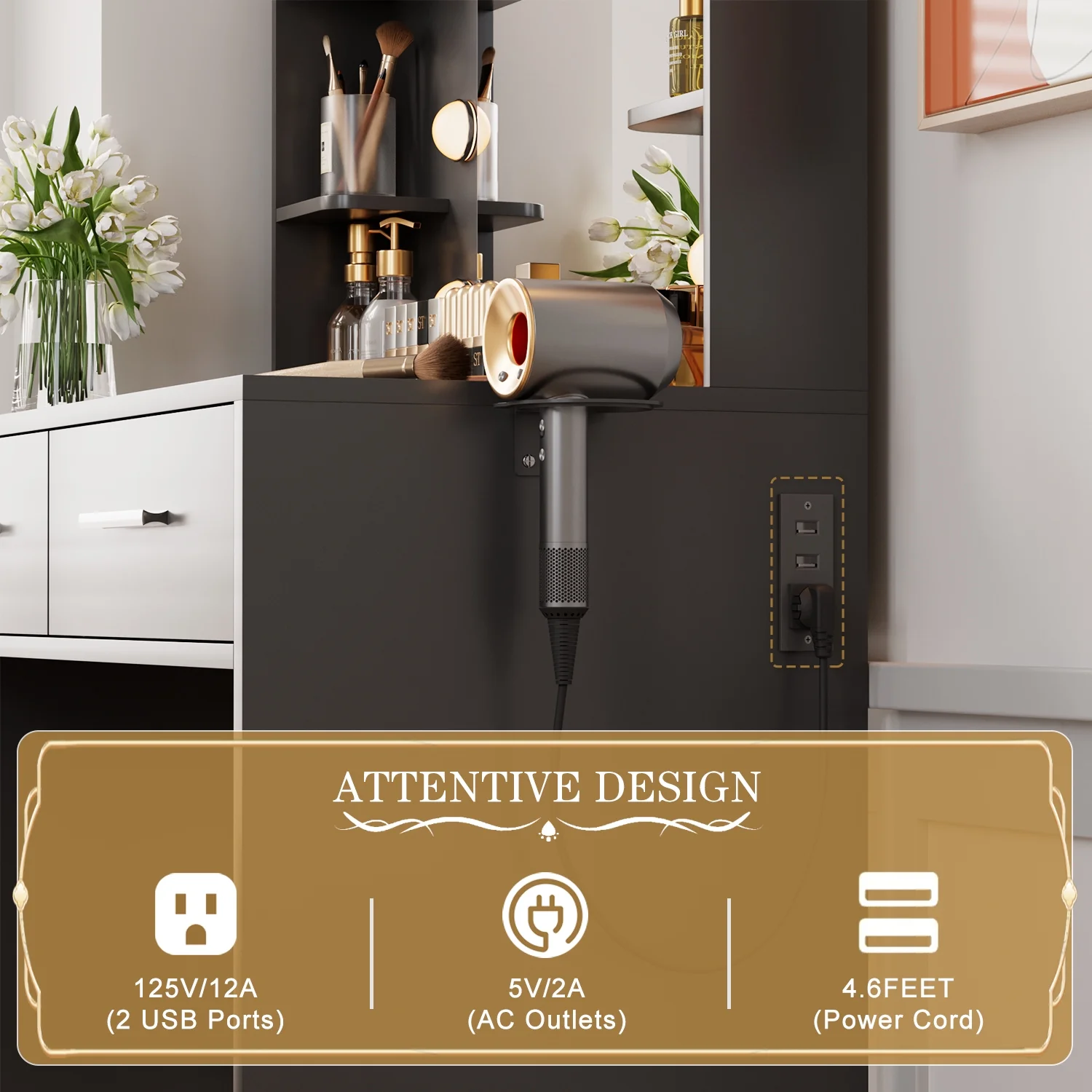 - Built-in Power Socket: The sockets on the side of the vanity table are designed to make it easy for you to use hair dryers, curling irons, beauty instruments and other small appliances without the hassle of looking for power sockets.