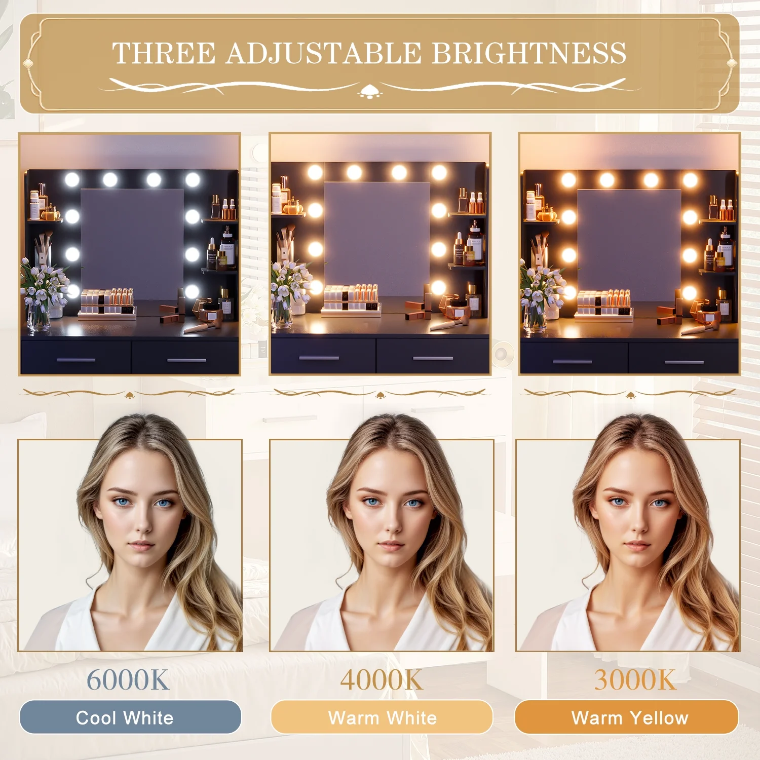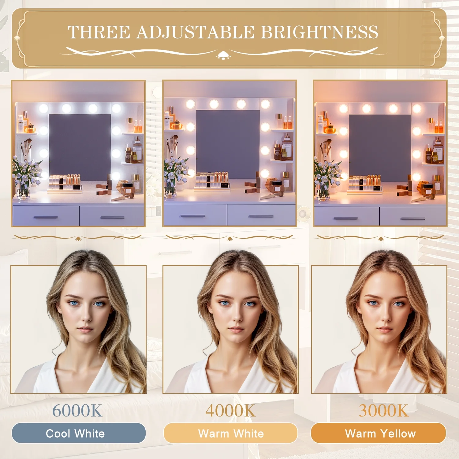 - Three Light Modes: The vanity desk designed lighting system provides three color temperature adjustments, whether it's delicate outlining for daily makeup or gentle care for nighttime skincare, you can find the light that suits you best.