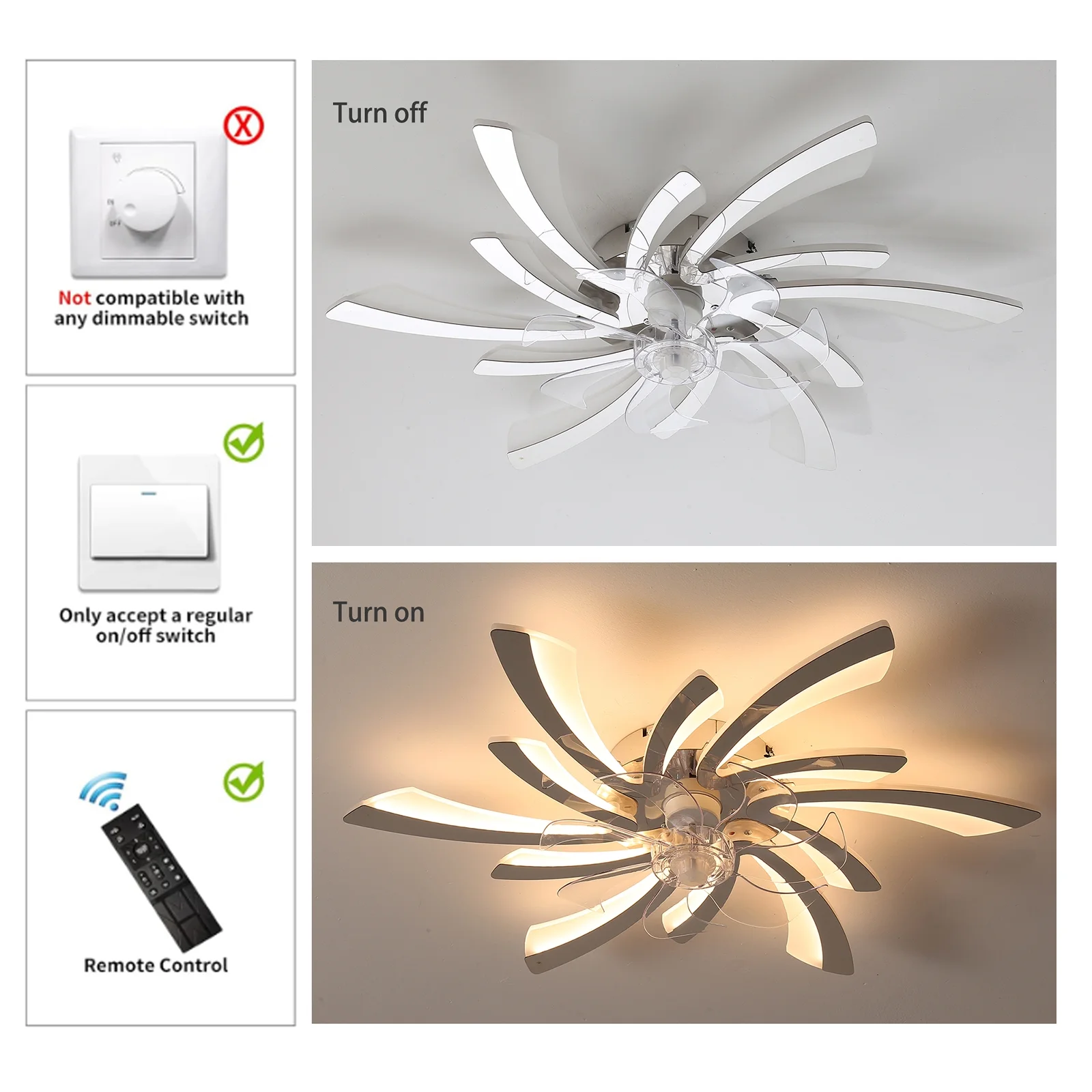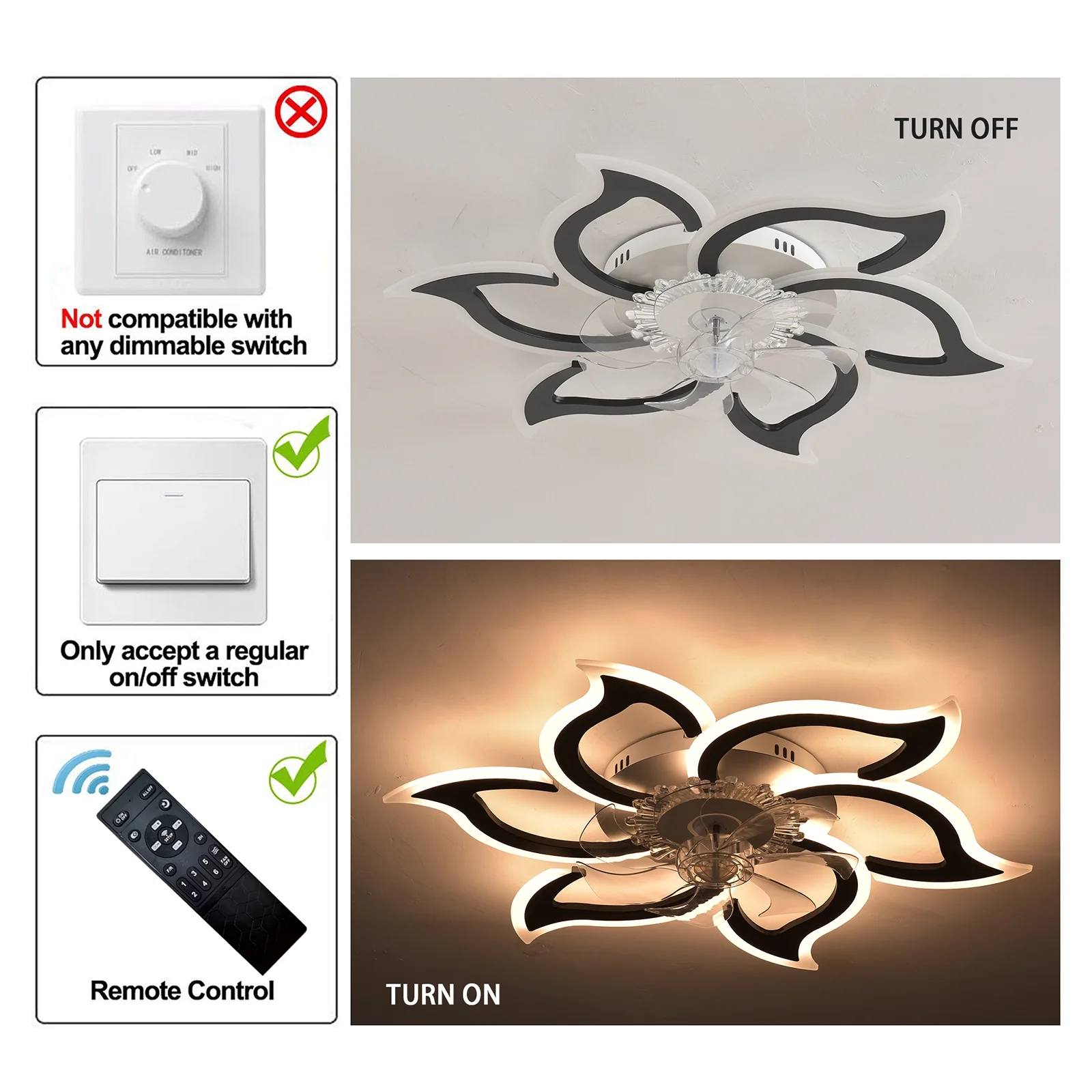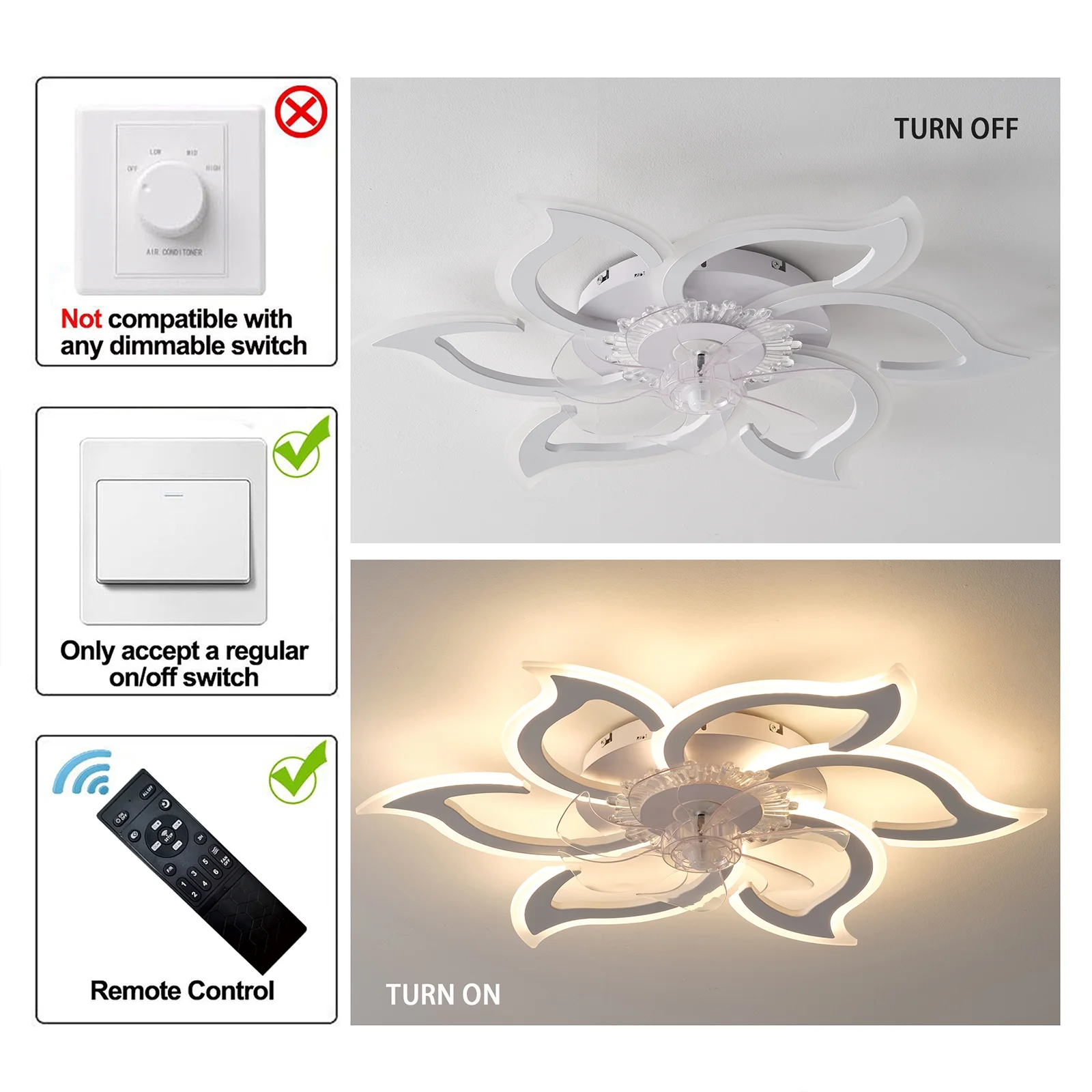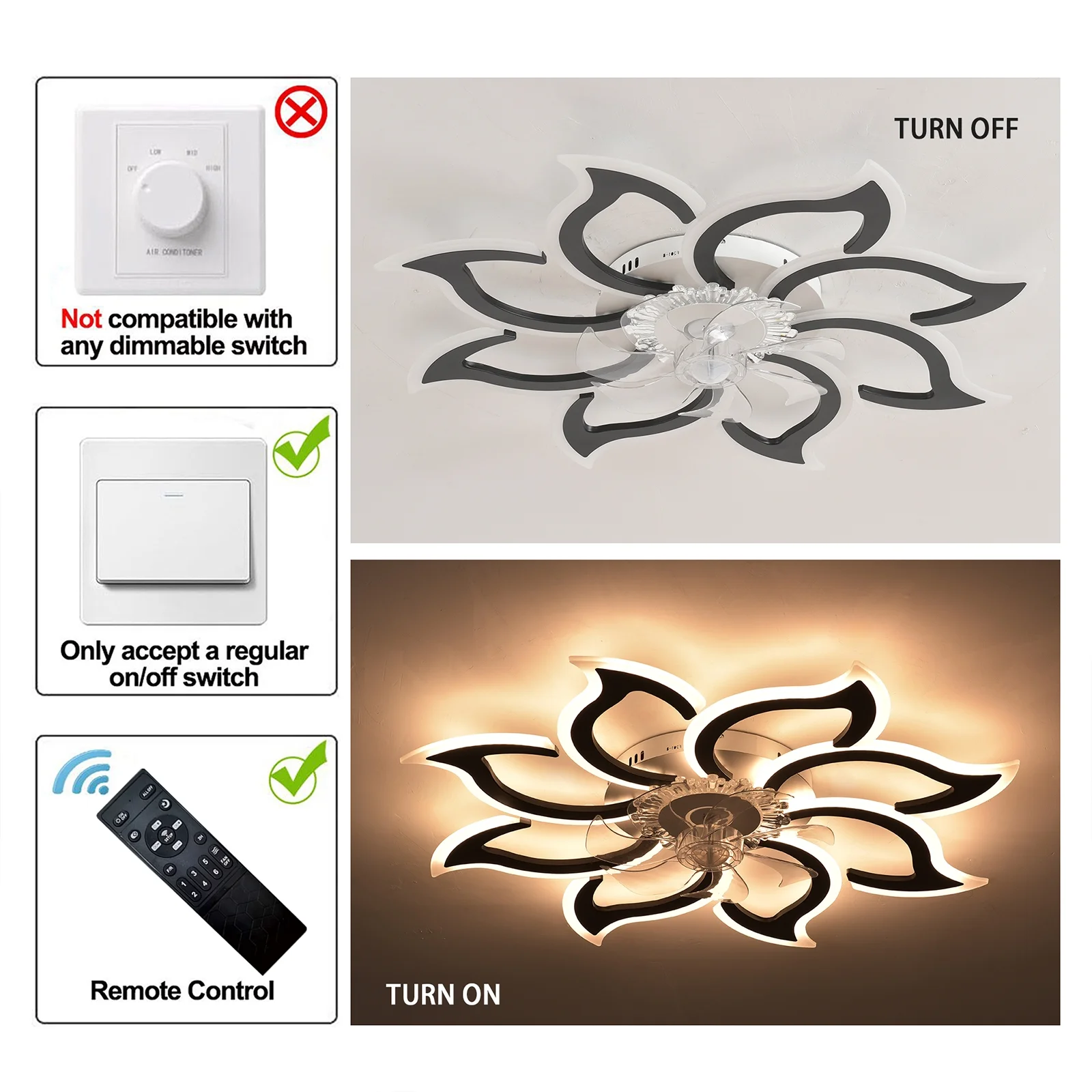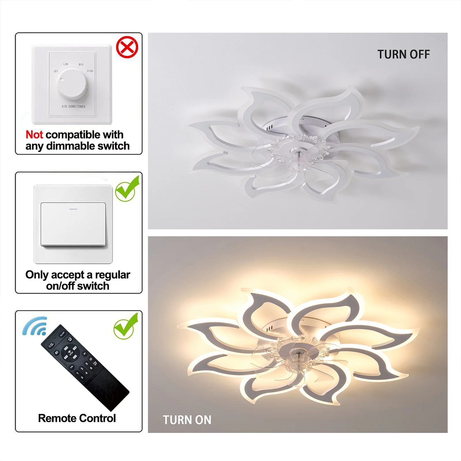 - Note: NOT compatible with a dimmerswitch. Please use a regular ON/OFF wall button switch or the includedremote.