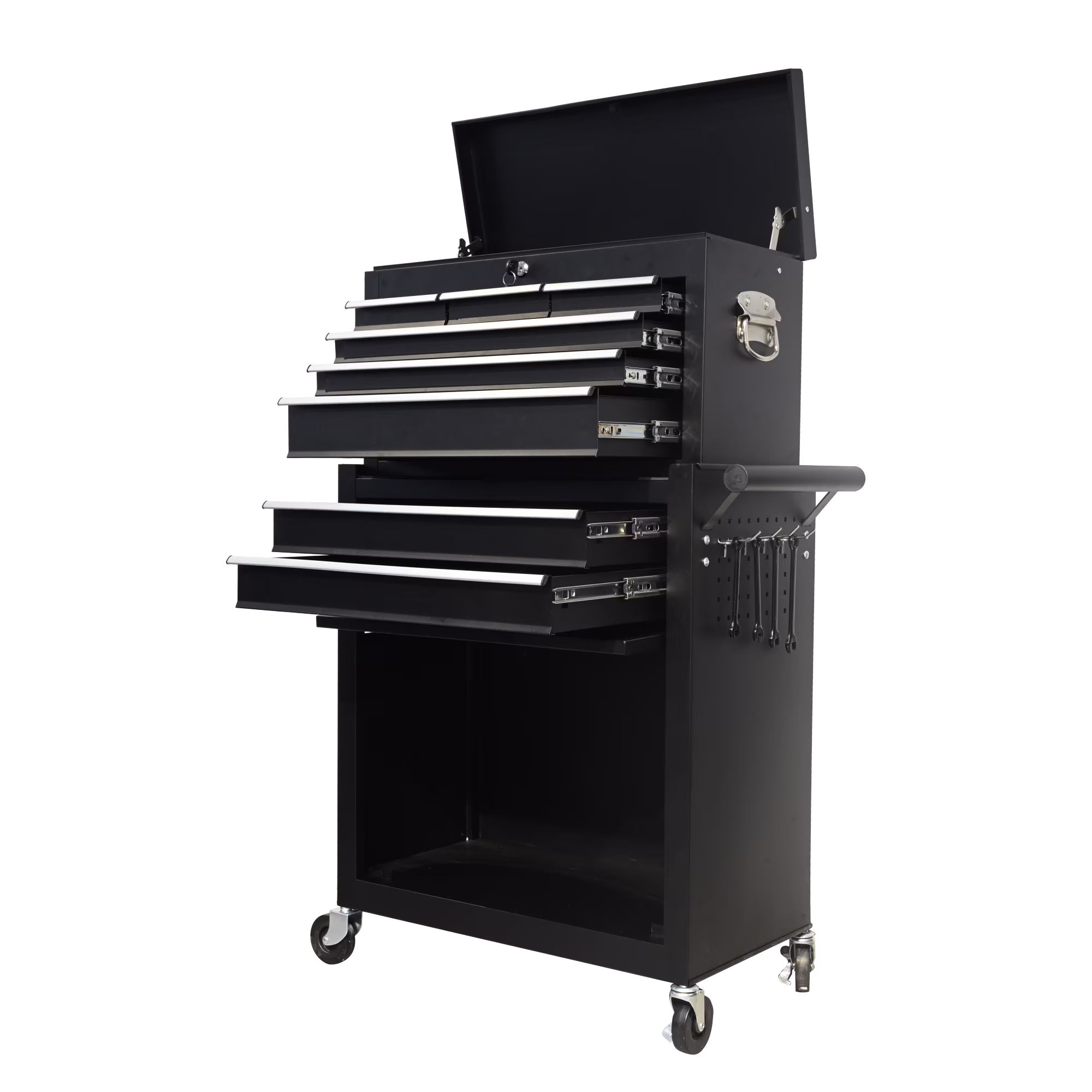 The combination tool cart has a total of 8 drawers, 1 base cabinet, and hook holes on the side, which can be used and has a large storage space.
