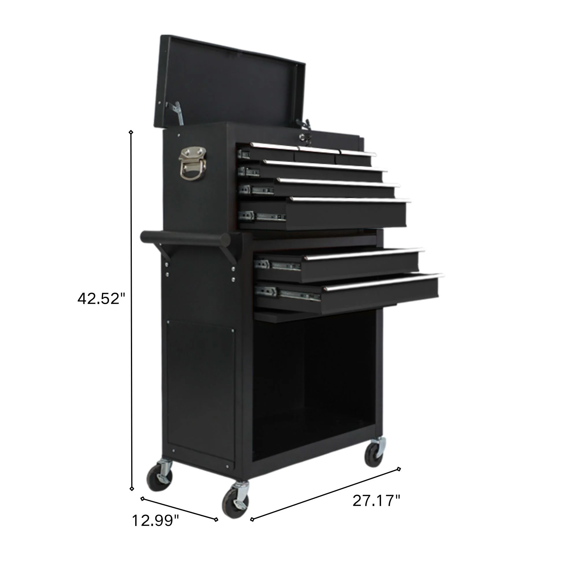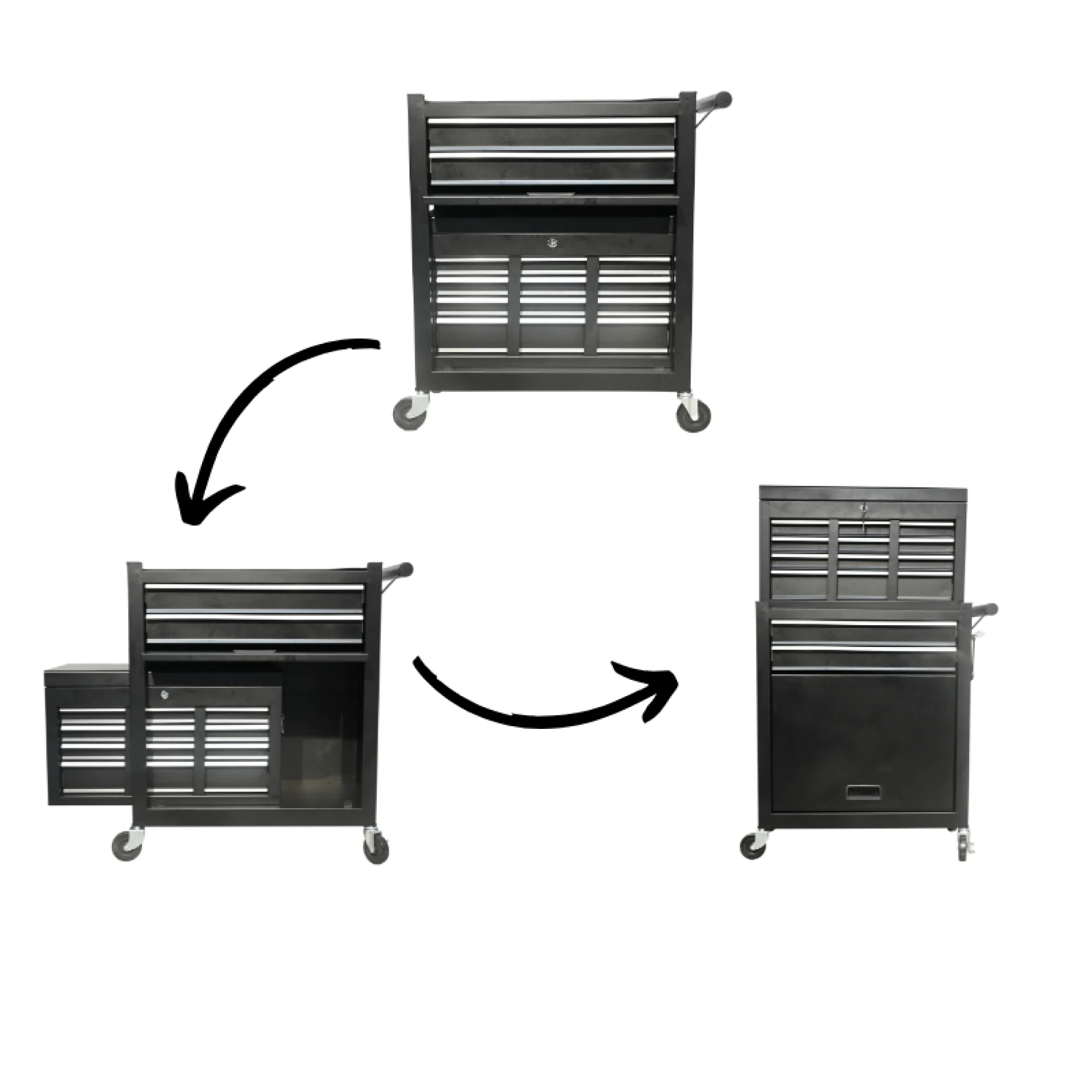 - 2-in-1 combination tool cabinet design, with the upper part being a tool cabinet and the lower part being a movable tool cart. It can be used alone or in combination, and when storing, the tool cabinet can be placed inside the tool cart to reduce space.