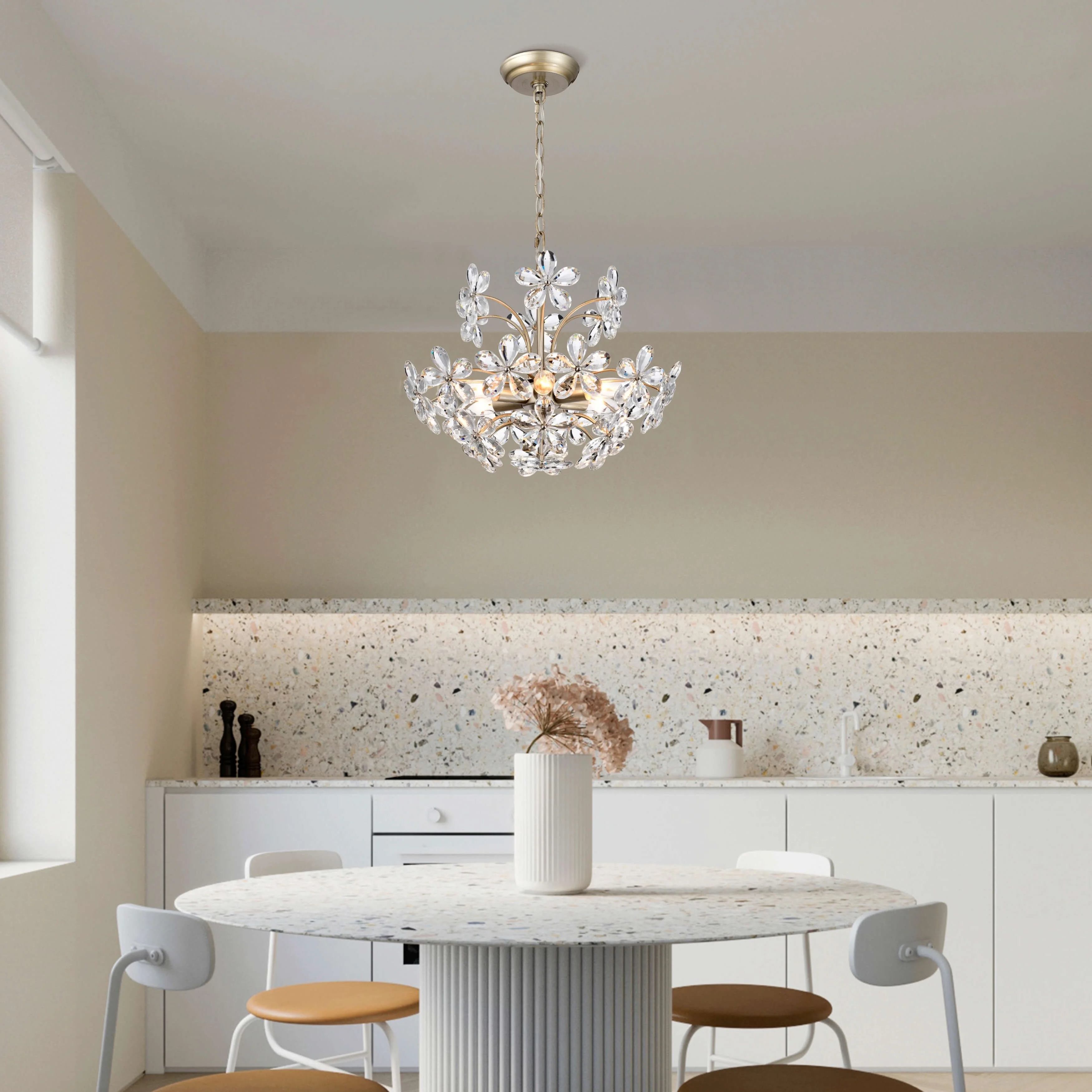 Transform your space with the Rosa 6-Light Brushed Silver-ish Champagne Flower Crystal Chandelier. This elegant fixture features crystal flower accents that add sophistication to any room. With a 39.4-inch adjustable chain, you can customize its height for perfect placement in dining rooms, living areas, or entryways. The chandelier's six light sockets ensure ample illumination, while the brushed silver-ish champagne finish enhances its modern look, beautifully complementing the sparkling crystals.Dominant color champagne, secondary color silver, brushed with brown. The ceiling plate is made of iron; shade: N/A.