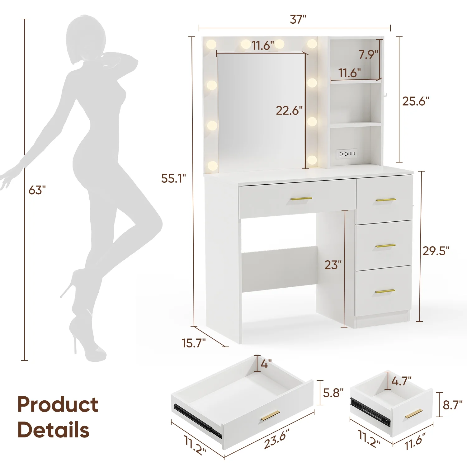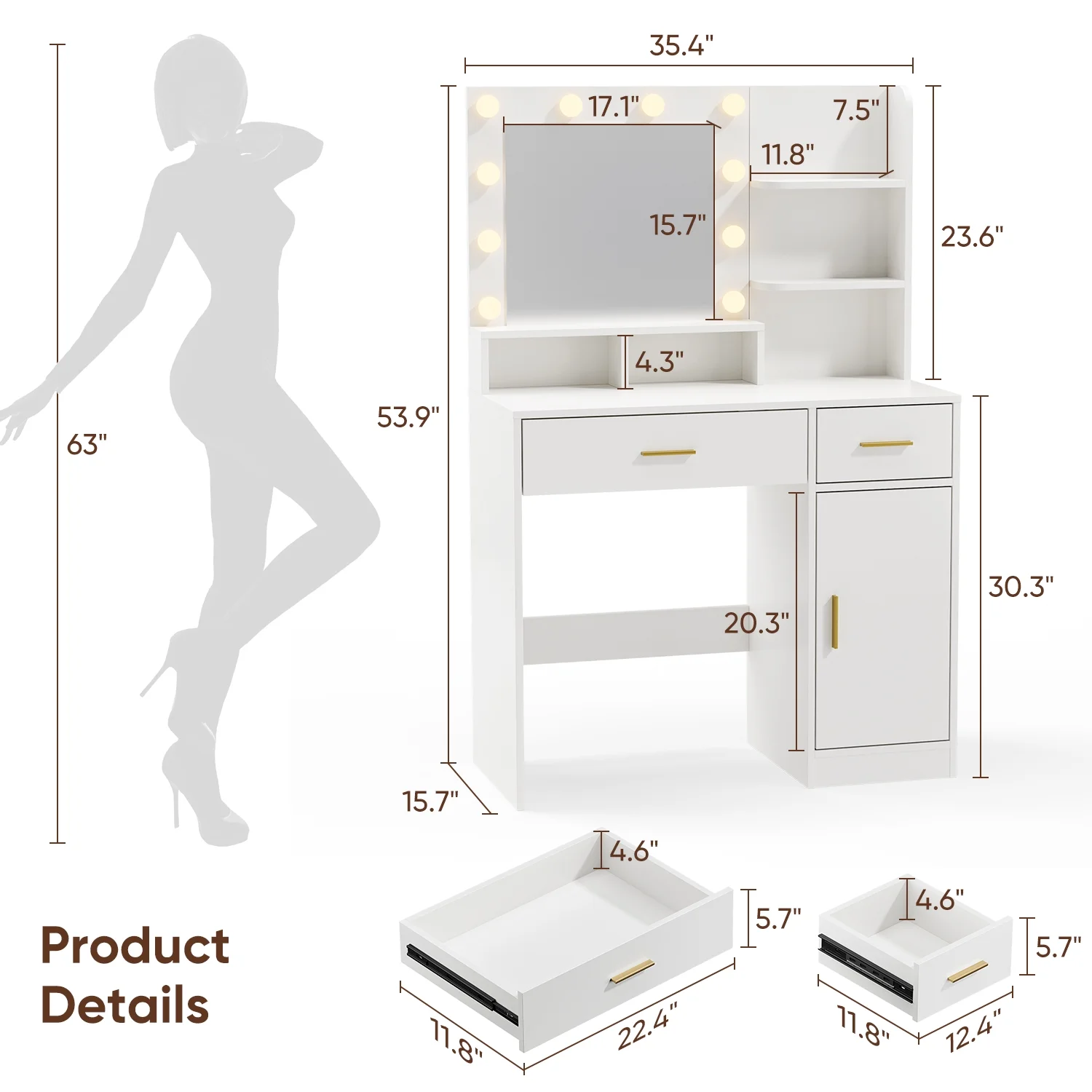 - Specifications:Overall: 37"(L) x 15.7"(W) x 55.1"(H)Small drawer: 11.6"(L) x 11.2"(W) x 8.7"(H)Large drawer: 23.6"(L) x 11.2"(W) x 5.8"(H)Color: WhiteMaterial: particle board, metalWeight: 92.5 lbsCare instructions: wipe with a damp ragFeatures: 3-color light, adjustable brightnessPackage Includes: