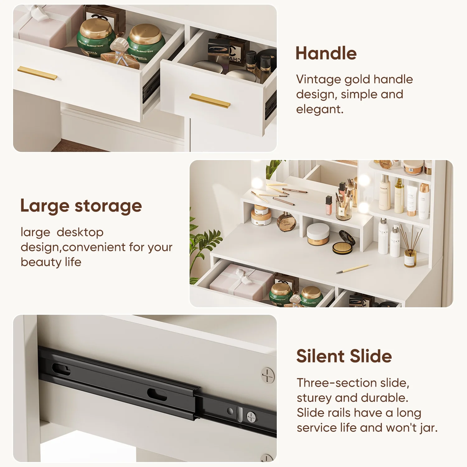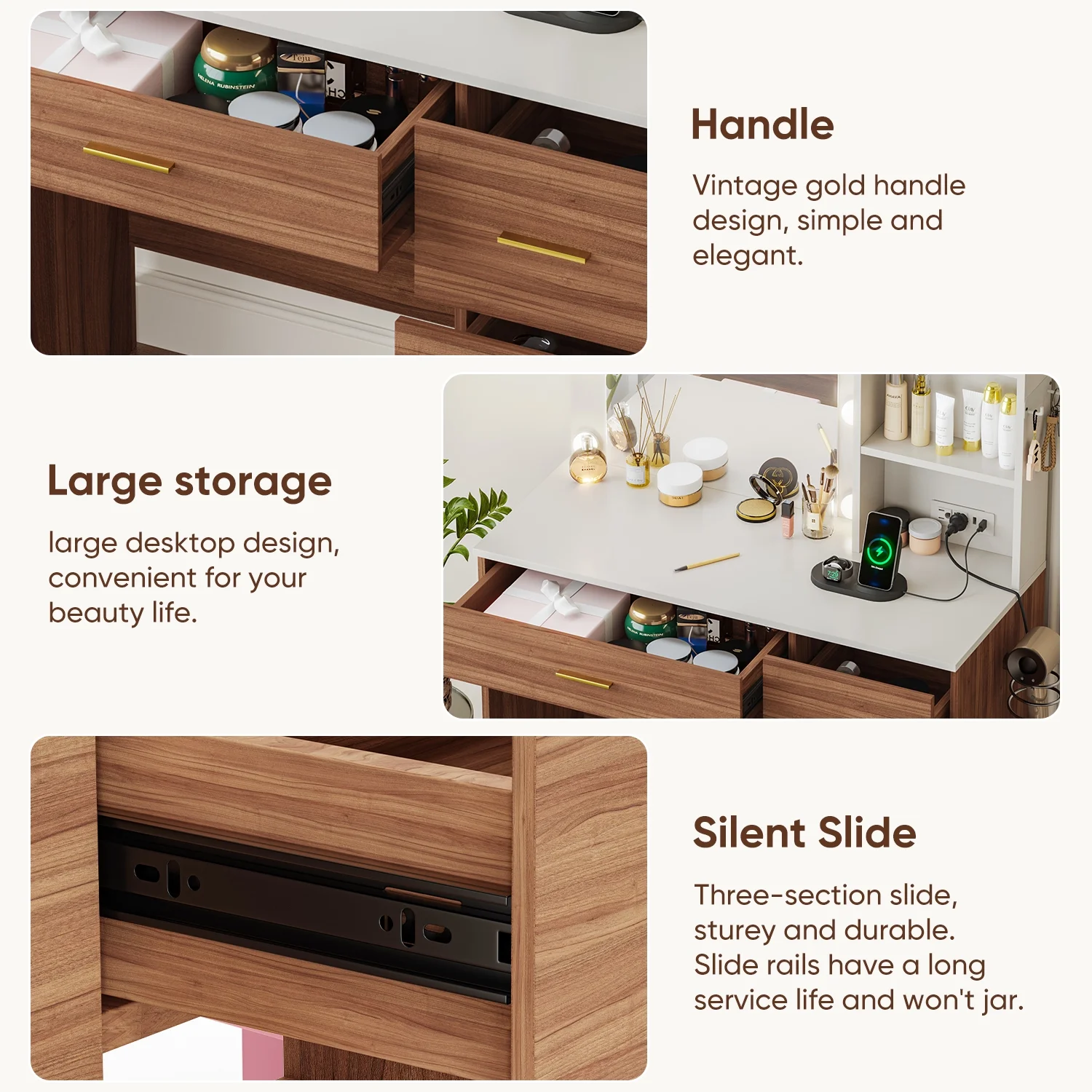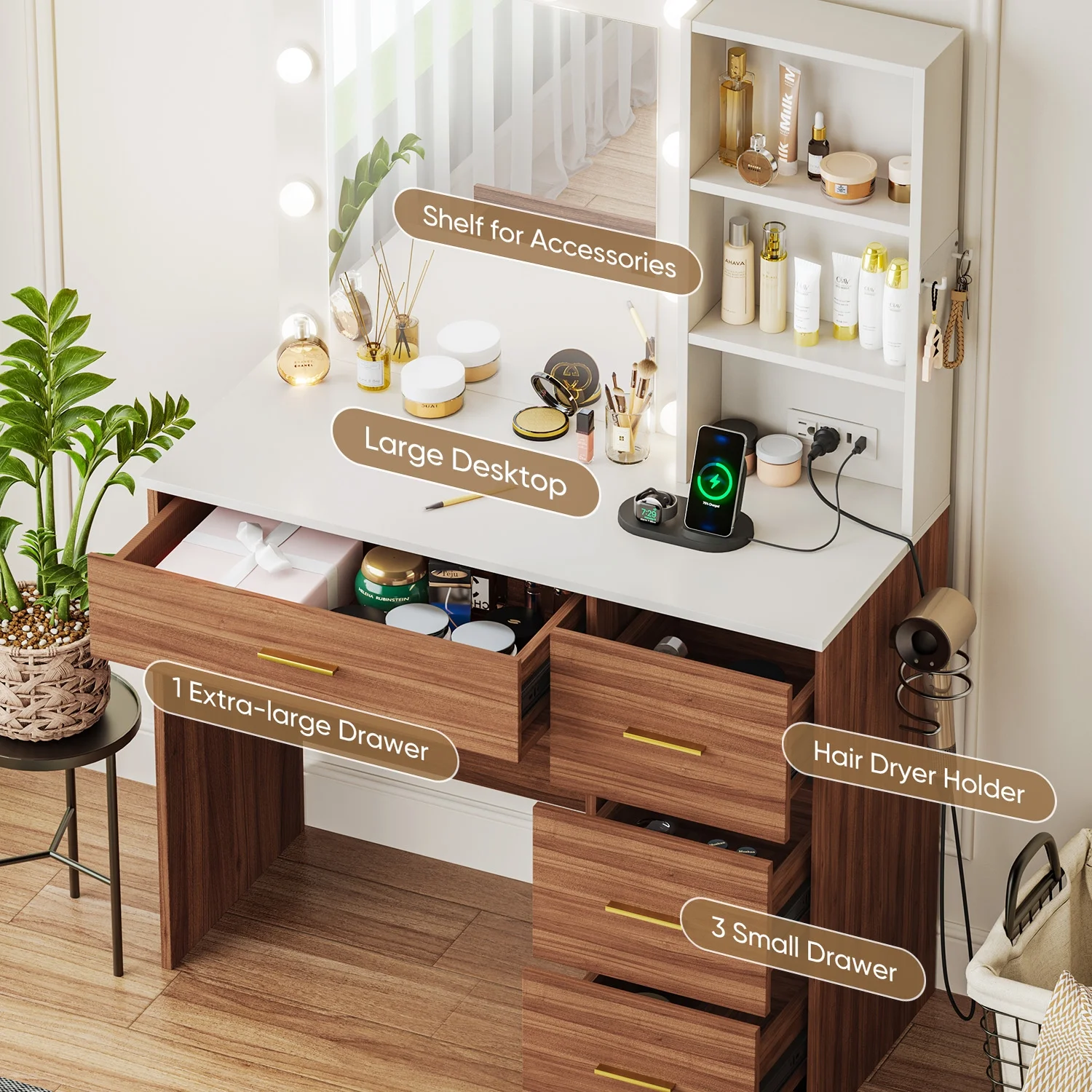 - 4 drawers and 2 open shelves for cosmetics and beauty tools.