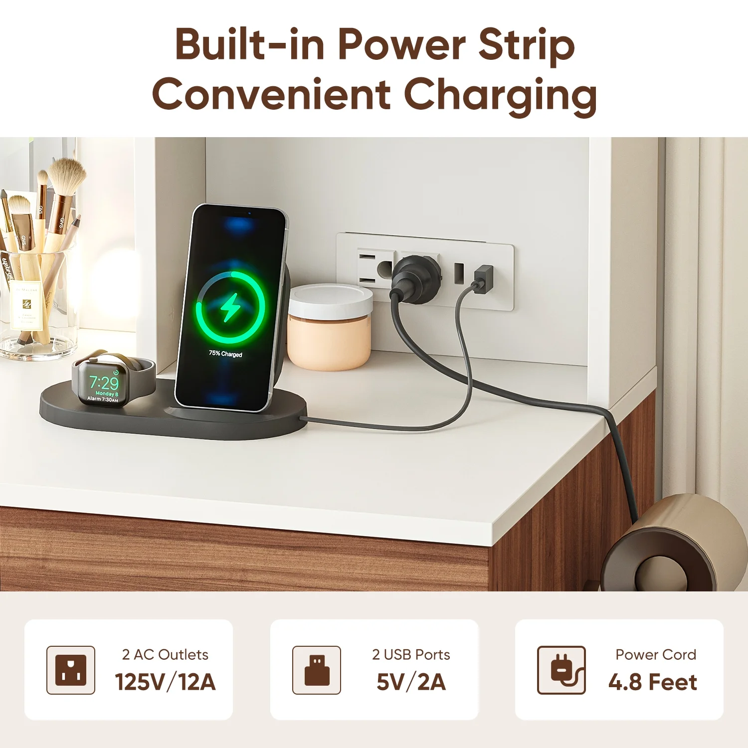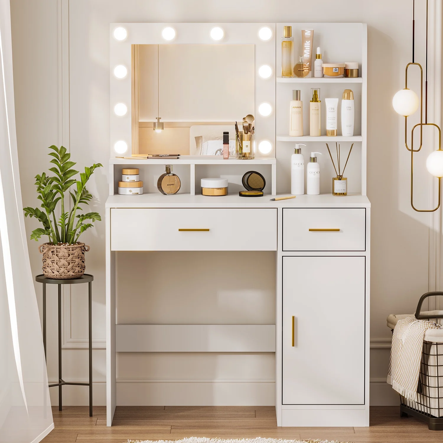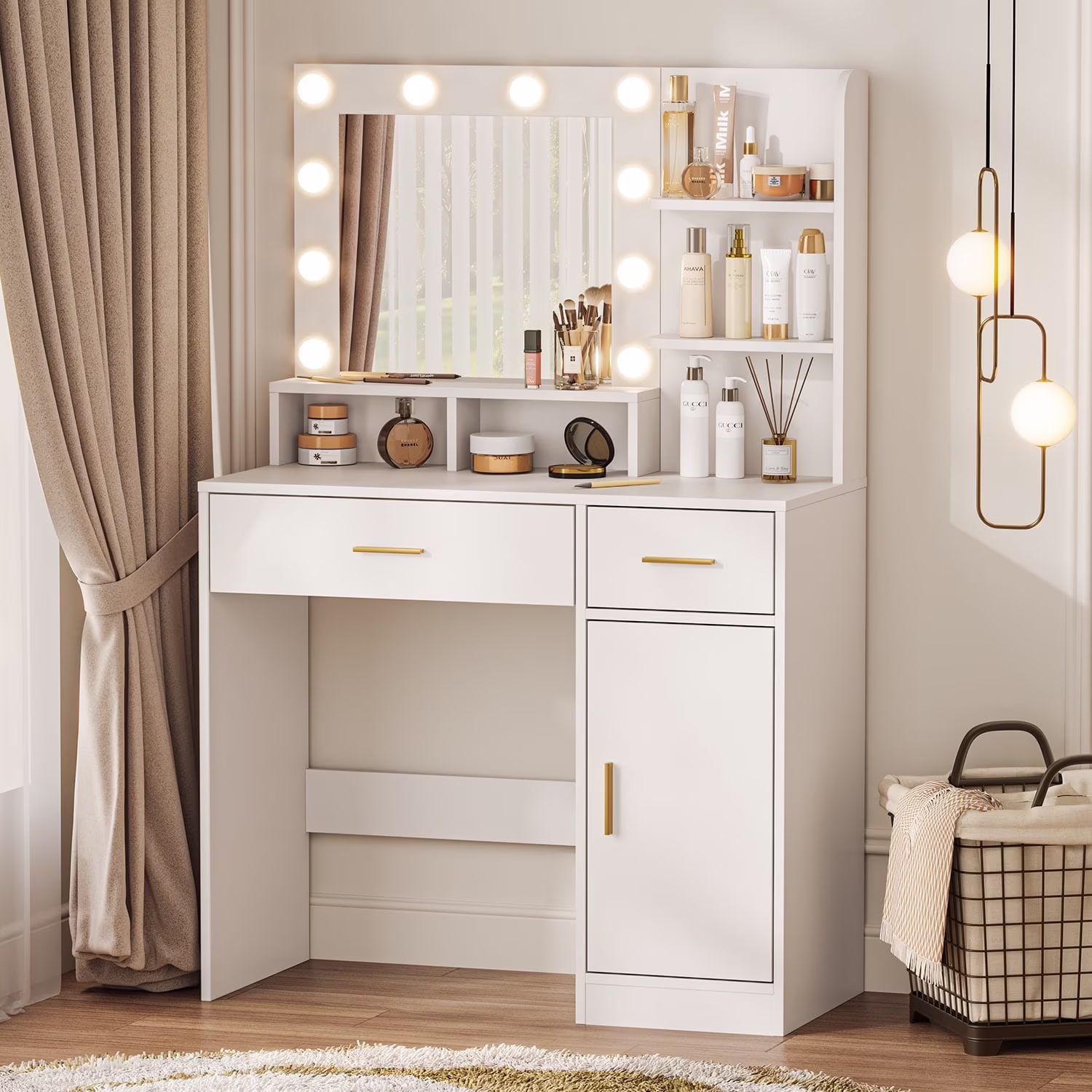 - 4 drawers and 2 open shelves for cosmetics and beauty tools.