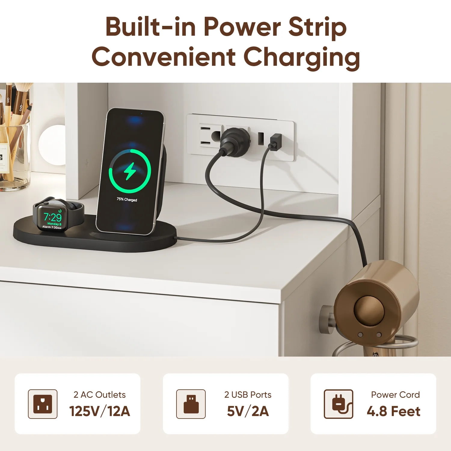 - Charge your phone, tablet, or other devices while grooming.