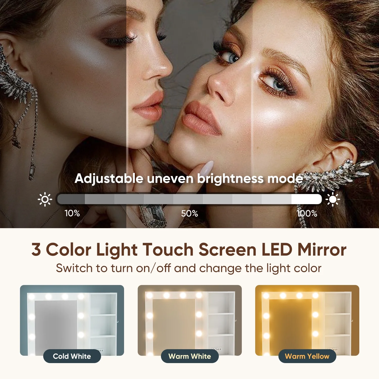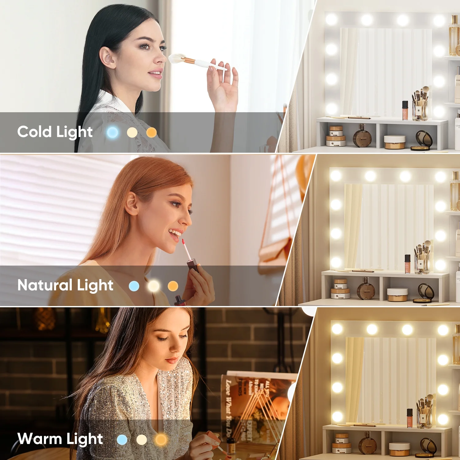 - Three light: Warm yellow, warm white, and cool white.