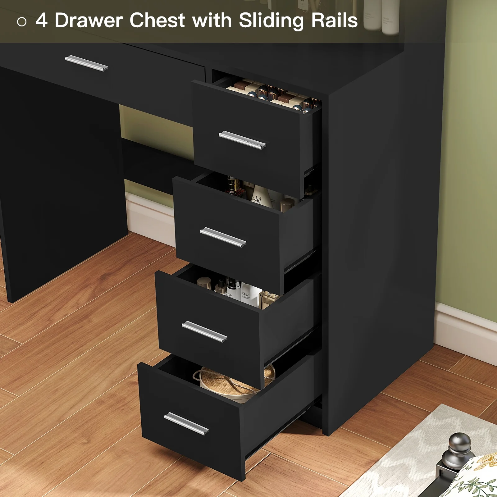 - ��Powerful Capacity Space��Your cosmetics are looking for a perch? Our vanity desk is a great addition for you! It has space on one side of the mirror for jewelry, hair accessories and everyday basic products that you would use. Space in the bottom 4 drawers for larger items such as brushes and curling irons. The drawers below the mirror are great for organizing all your makeup. Instead of rushing around going crazy getting ready for work in the morning, you can sit back relax and know that everything is within your reach.