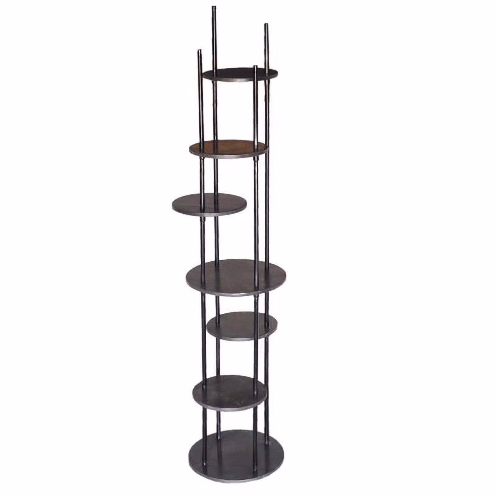 The Crestview Collection Graham Multiple Round Shelf Etagere has seven circular shelves. The shelves sit uncentered giving this modern piece a quirky look that adds an element of fun to your home. The black metal frame is complemented by the dark-brown wooden shelves giving this piece a rich color that will warm your living room. Tipping restraints are included to keep this shelving unit in place.