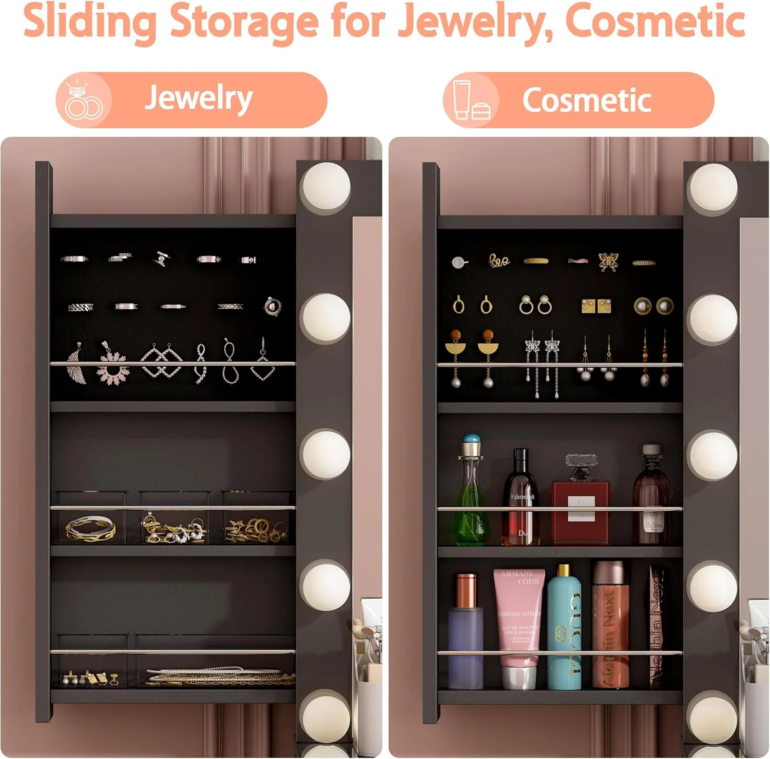 - Super Storage: 11 large drawers and 2 hidden jewelry cabinets are are the perfect solution to your sorting and storage problems. The 3 main drawer can store cosmetics, skincare, perfumes, and the glass top is convenient for you to find and take them. The 2 hidden jewelry cabinets can be used exclusively for storing and displaying jewelry or jars. The following 8 deep drawer are sufficient for any other type of storage sorting needs
