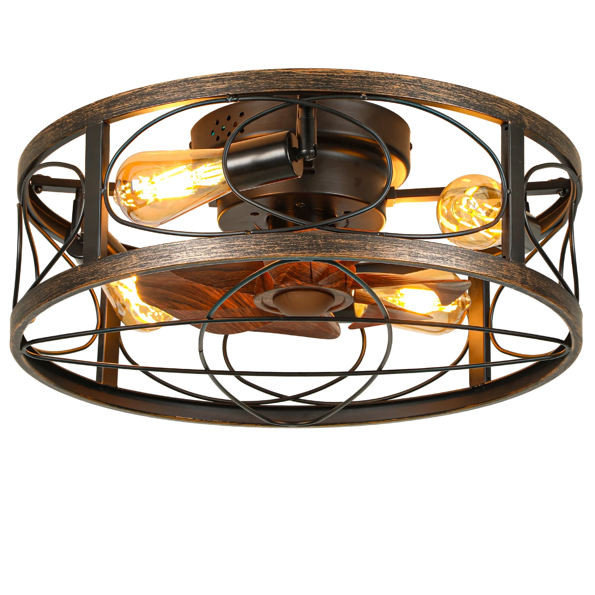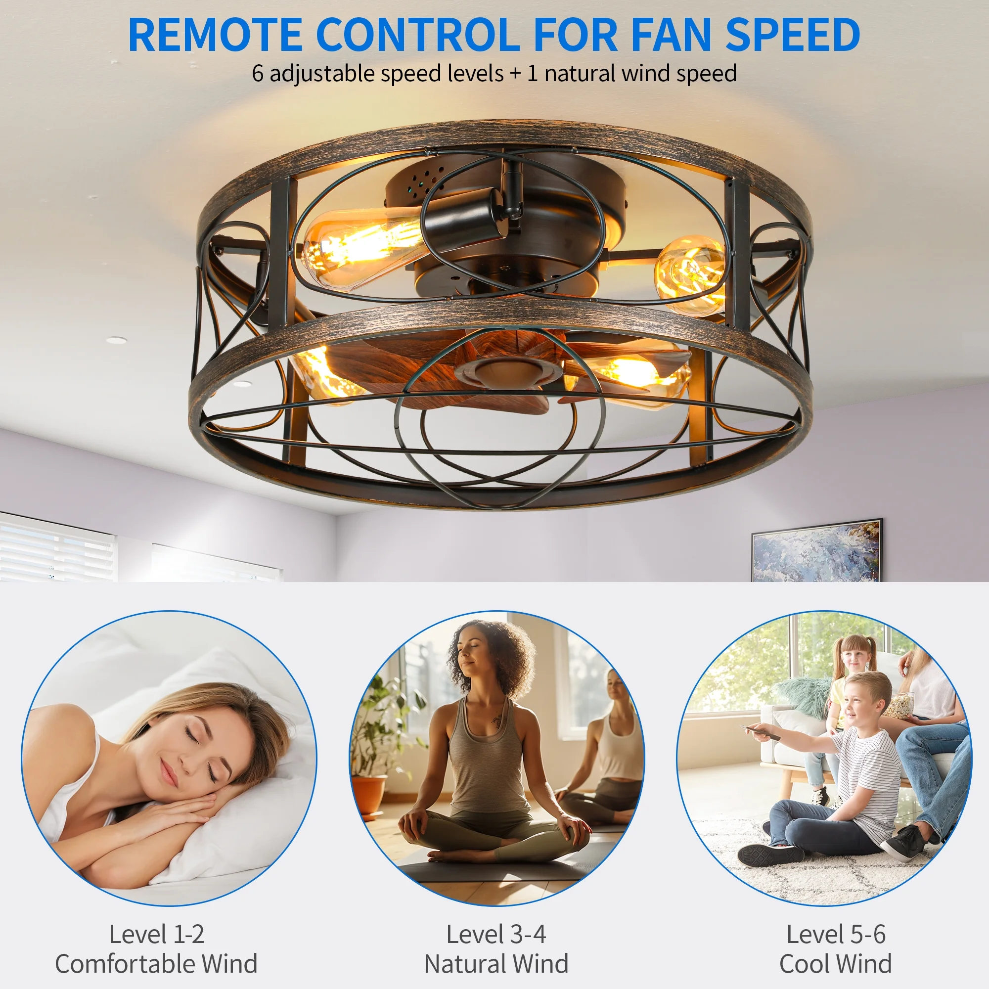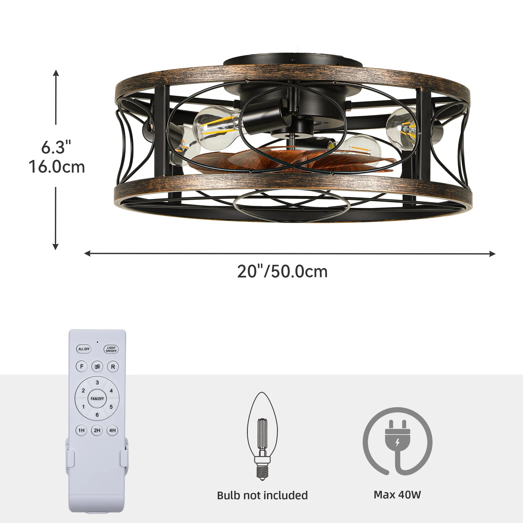 Dextrus 20" Caged Ceiling Fan with Lights and Remote Control, Rustic Farmhouse Flush Mount Design with Reversible DC Motor, 6 Speed Settings for Indoor/Outdoor Use (Brown & Black)