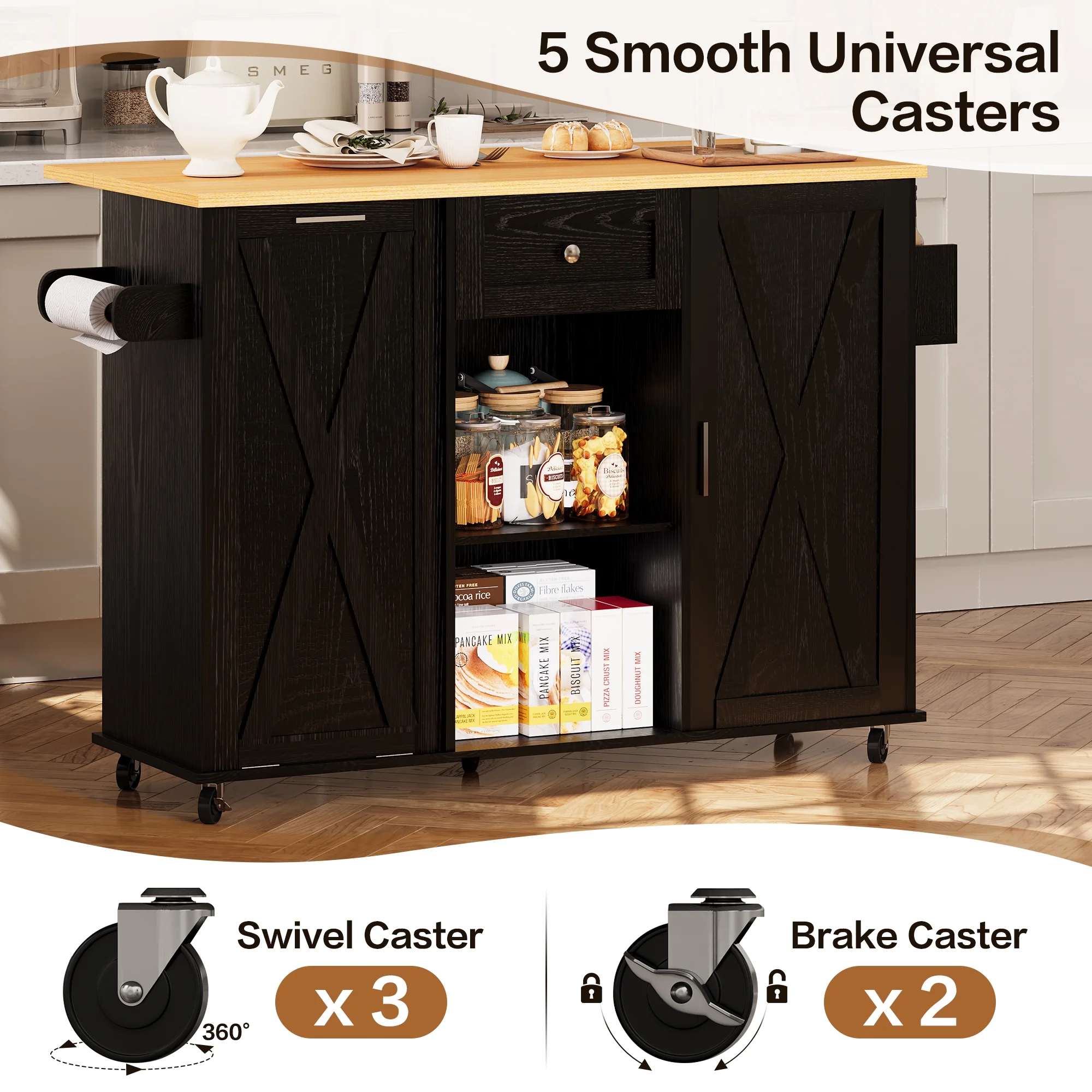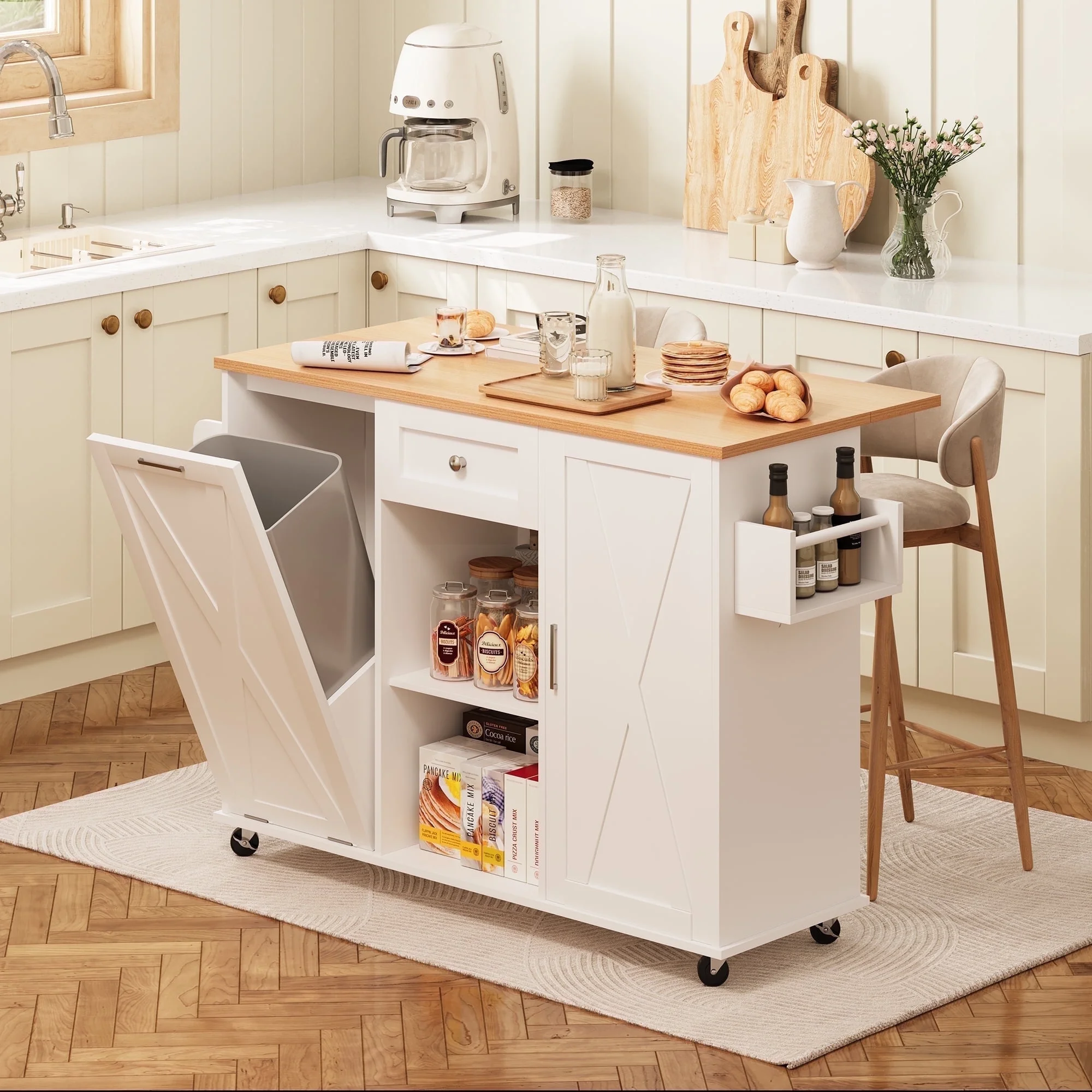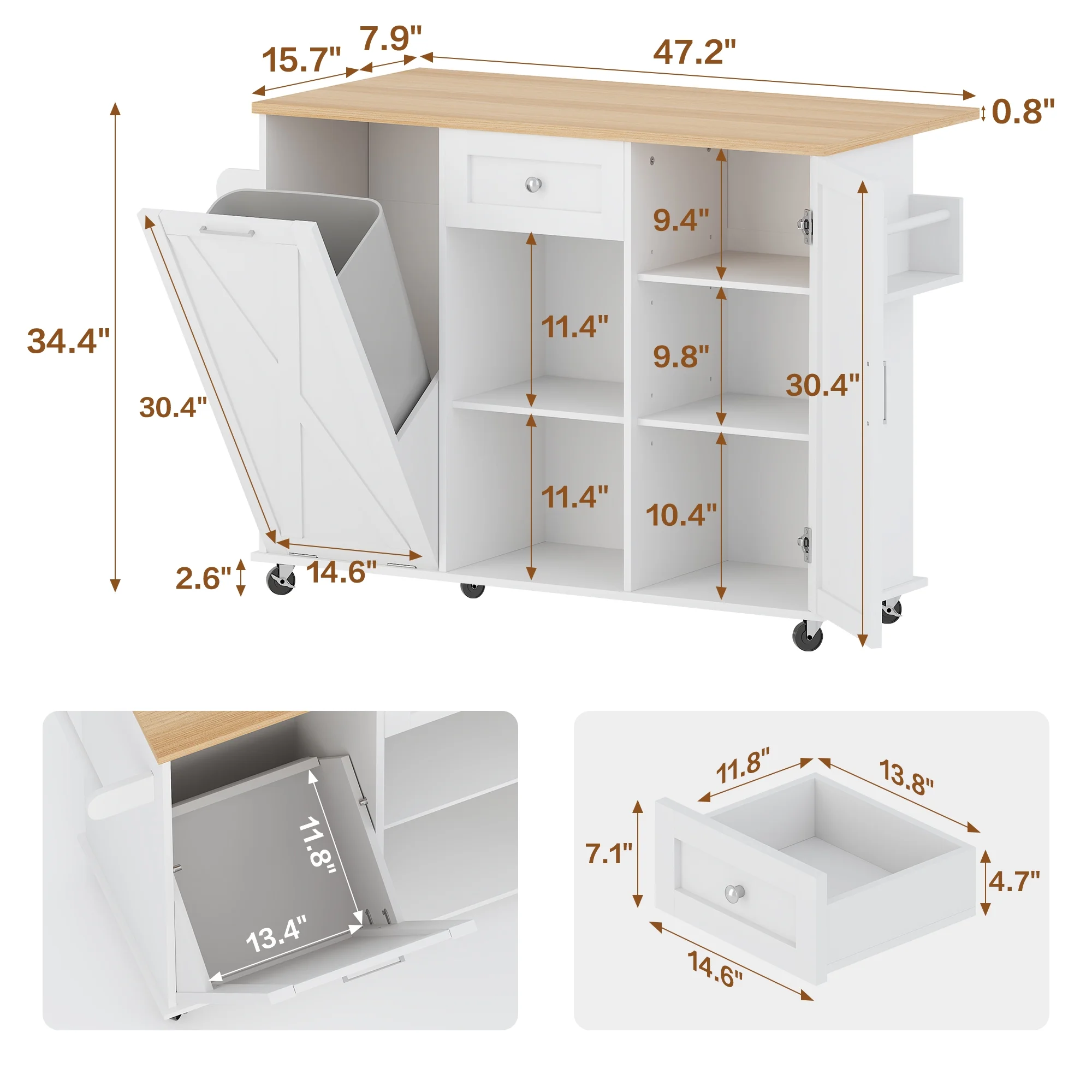 Spanspace 48" Kitchen Island Cart with Drop Leaf, 10 Gallon Storage and Tilt Out Trash Can Cabinet, Portable Kitchen Island with Wheels Drawer and Adjustable Shelves for Kitchen, White