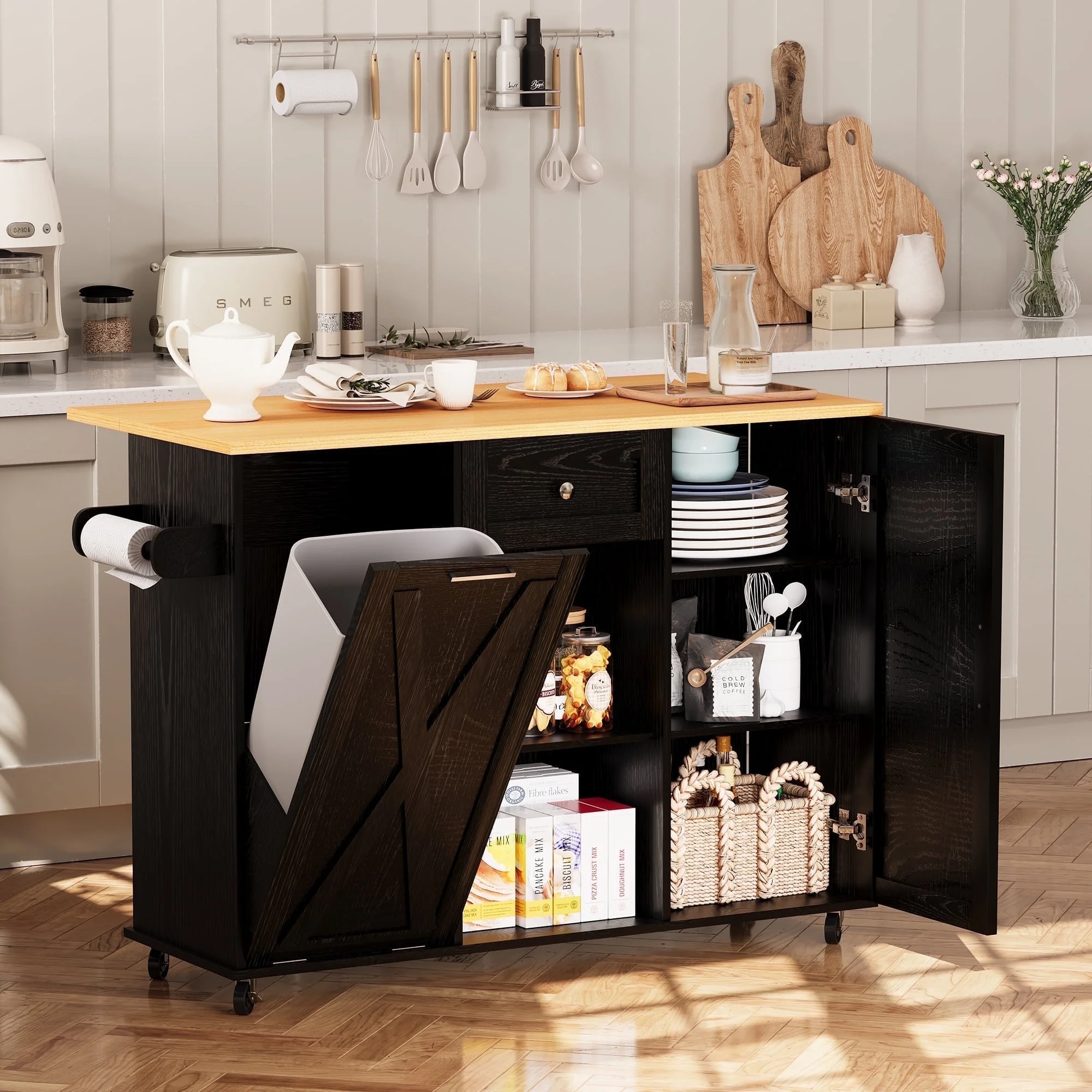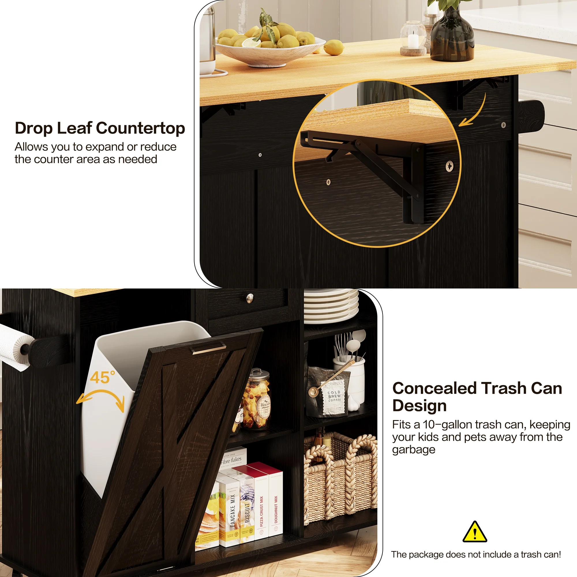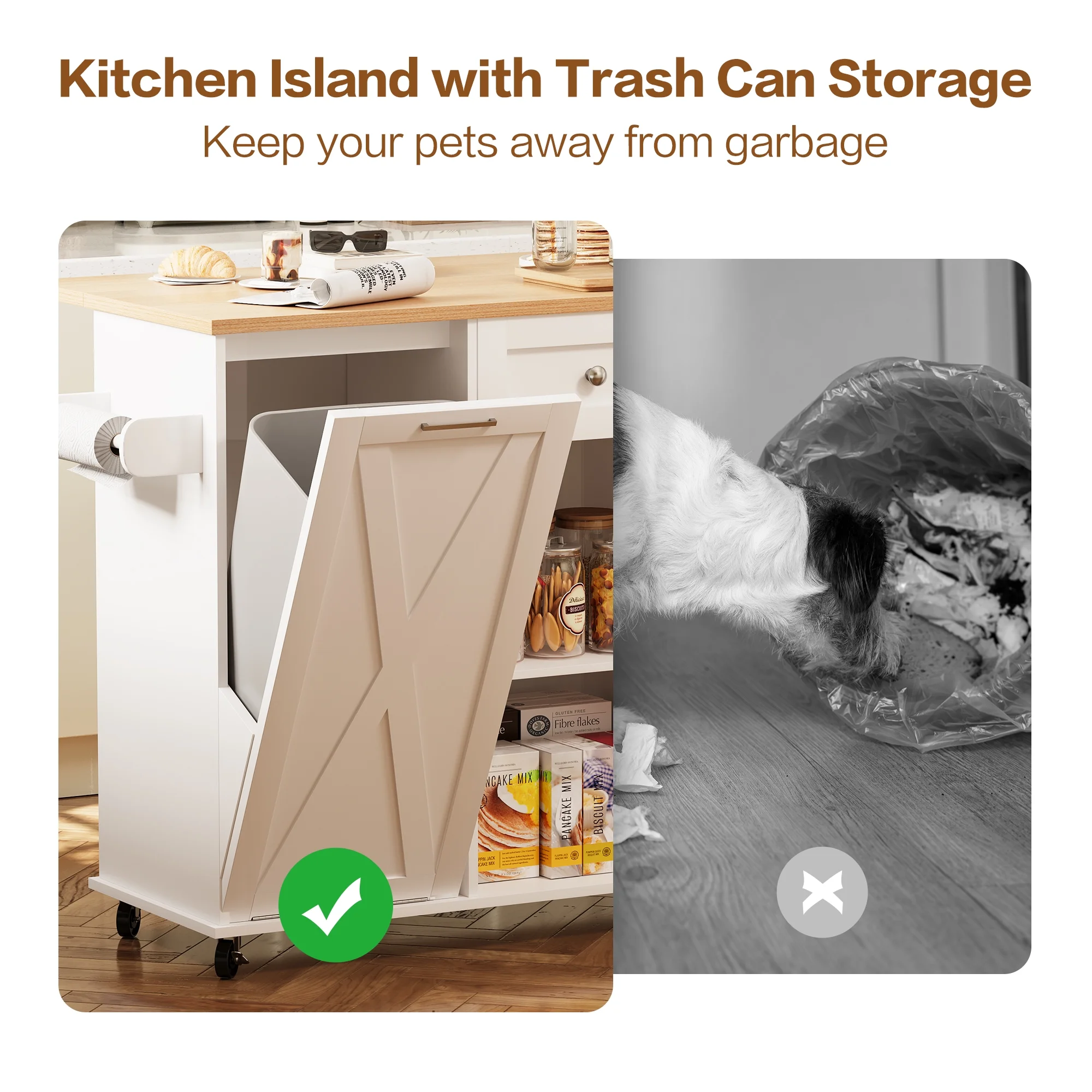 - ???Tilt Out Trash Can Cabinet???The trash can cabinet is a discreet, built-in feature of the portable kitchen island that maximizes space efficiency. It fits a 10-gallon trash can (trash can is excluded), which not only hides the messy trash can, but also effectively prevents the spread of odors. In addition, it can also be used for food storage or organizing household items.