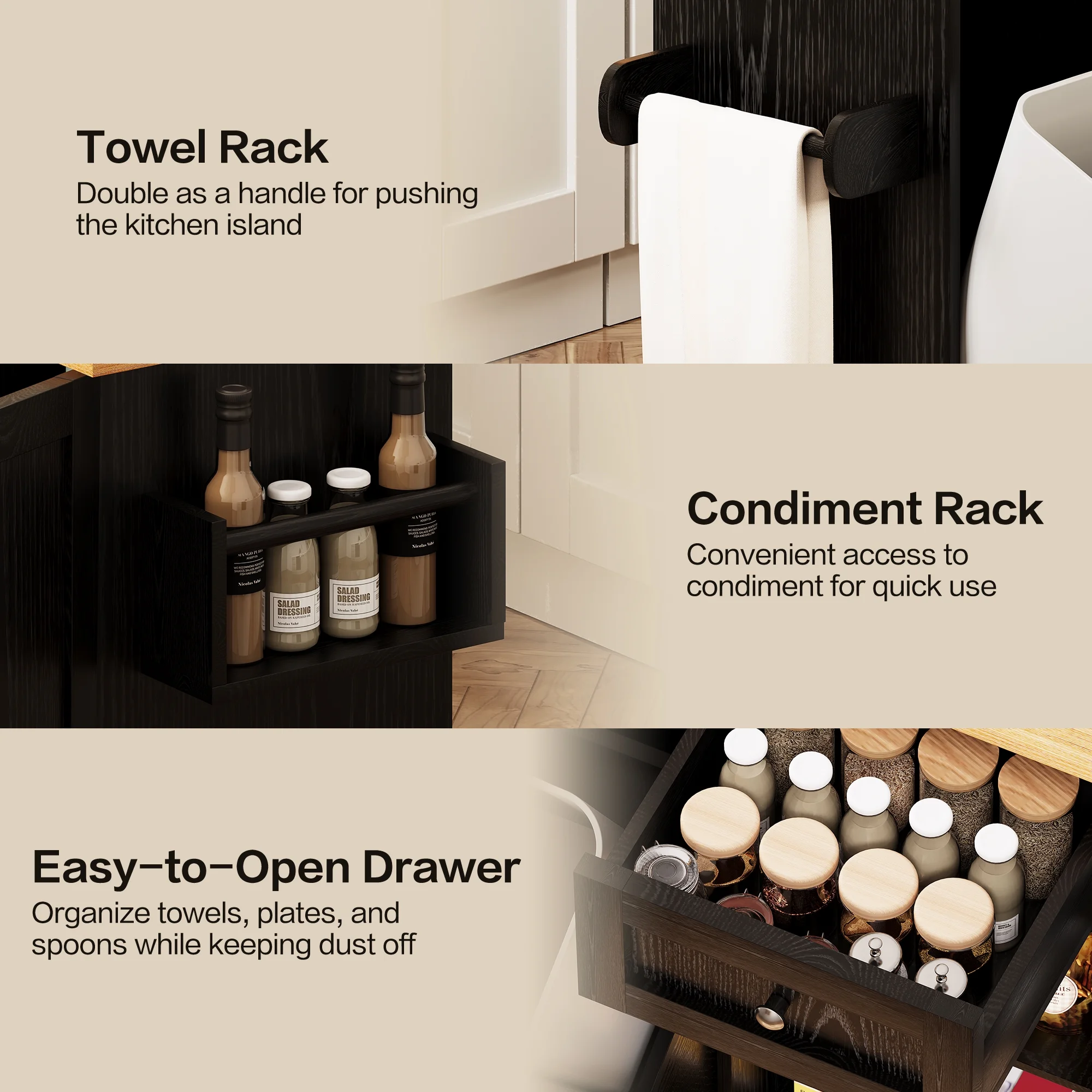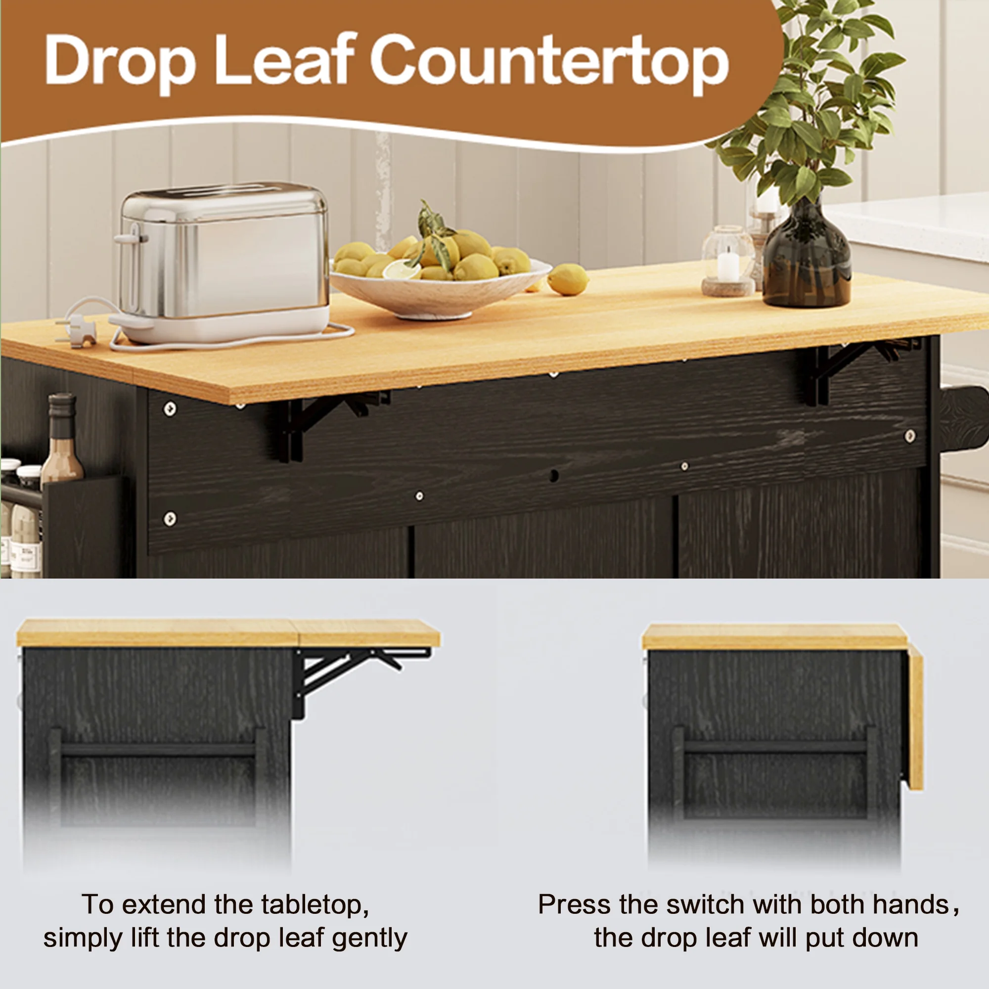 - ???Drop-Leaf Countertop??? The drop-leaf on the island table for kitchen offers versatile, space-saving convenience. When extended, it adds extra surface area for meal prep or dining, and folds down effortlessly when not in use, making it ideal for smaller kitchens or multifunctional spaces. The 0.7in (1.8 cm) thick tabletop ensures greater sturdiness and durability compared to most alternatives.