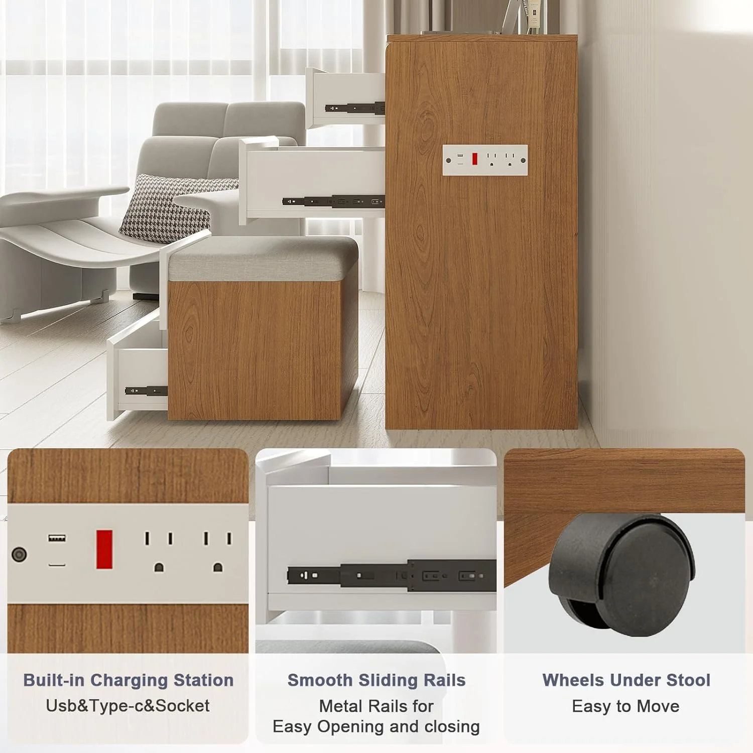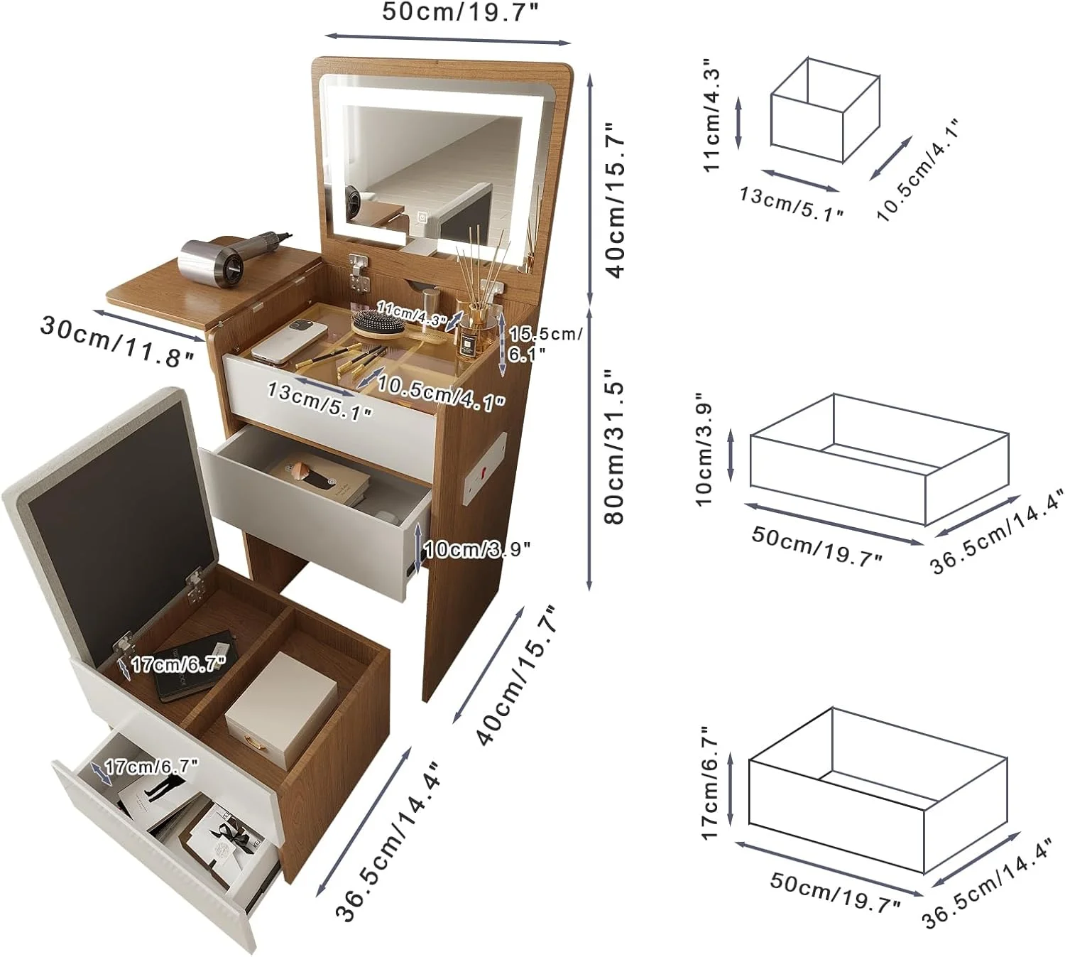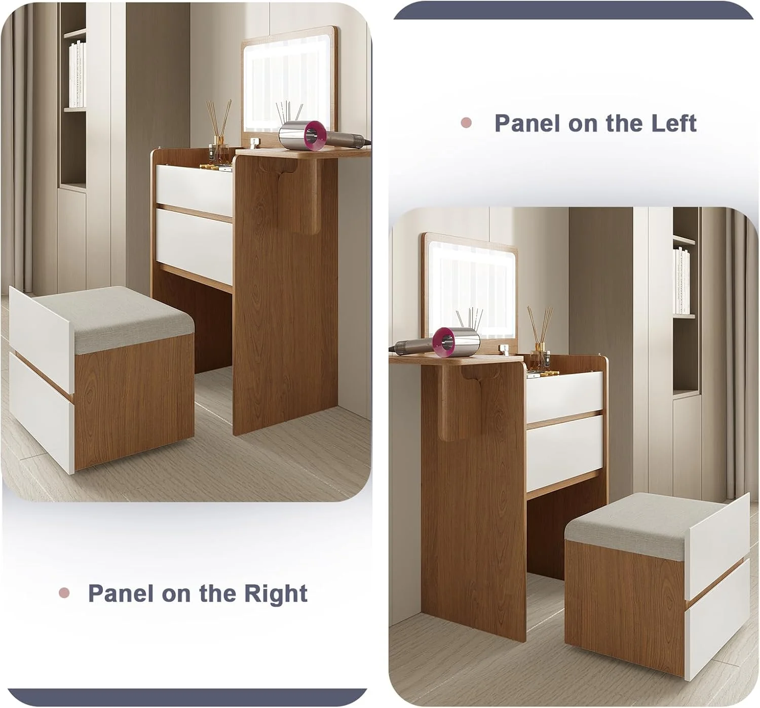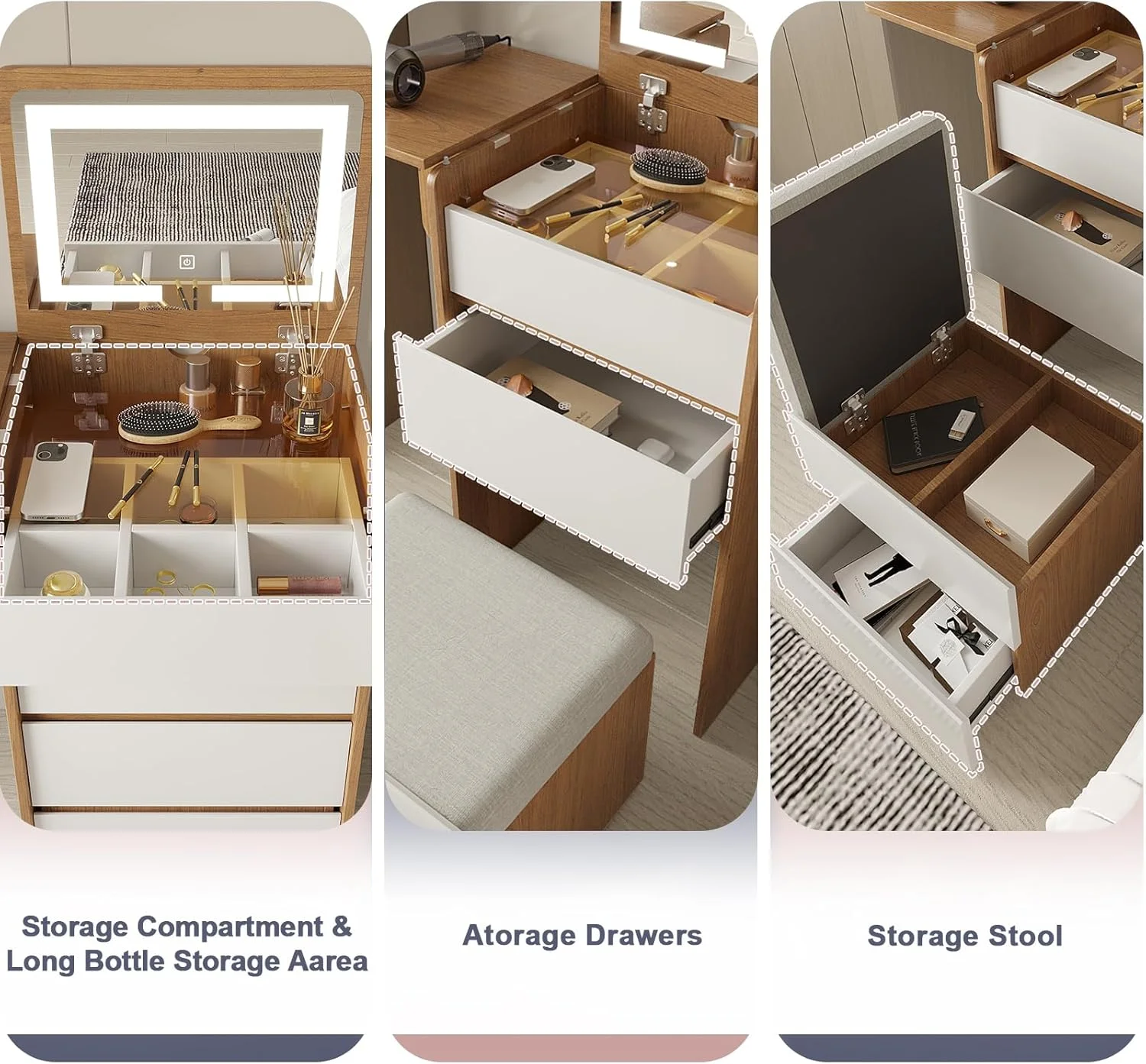 Compact Structure: Led mirror, Storage makeup stool, Fold-up panel, Storage drawers, Power strip