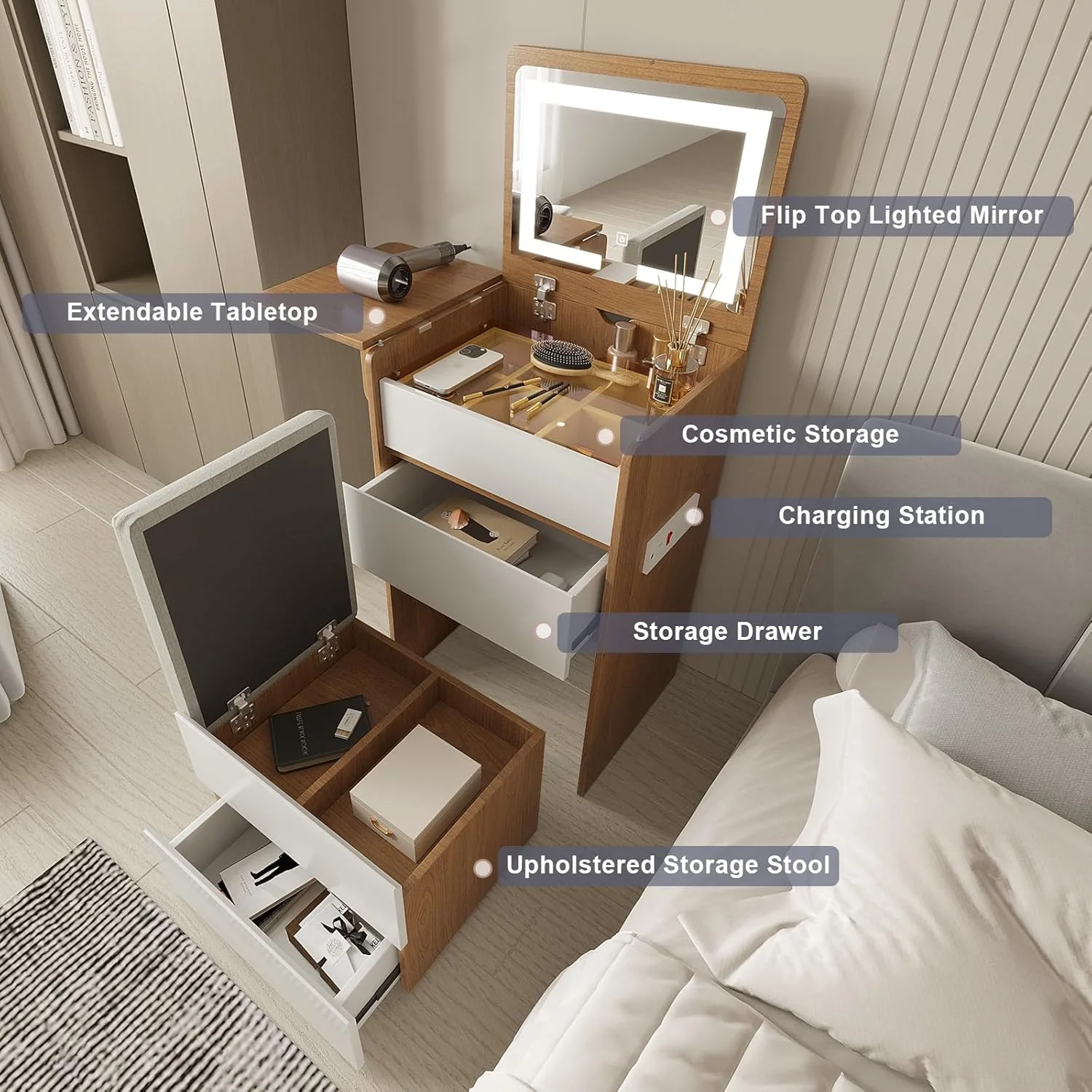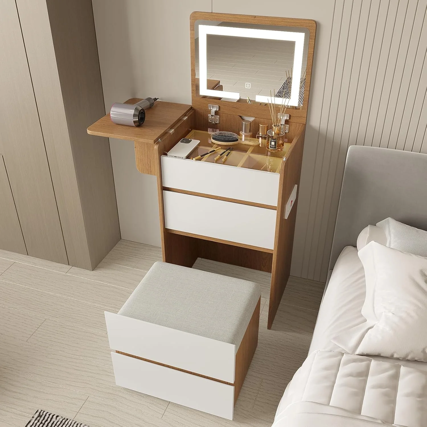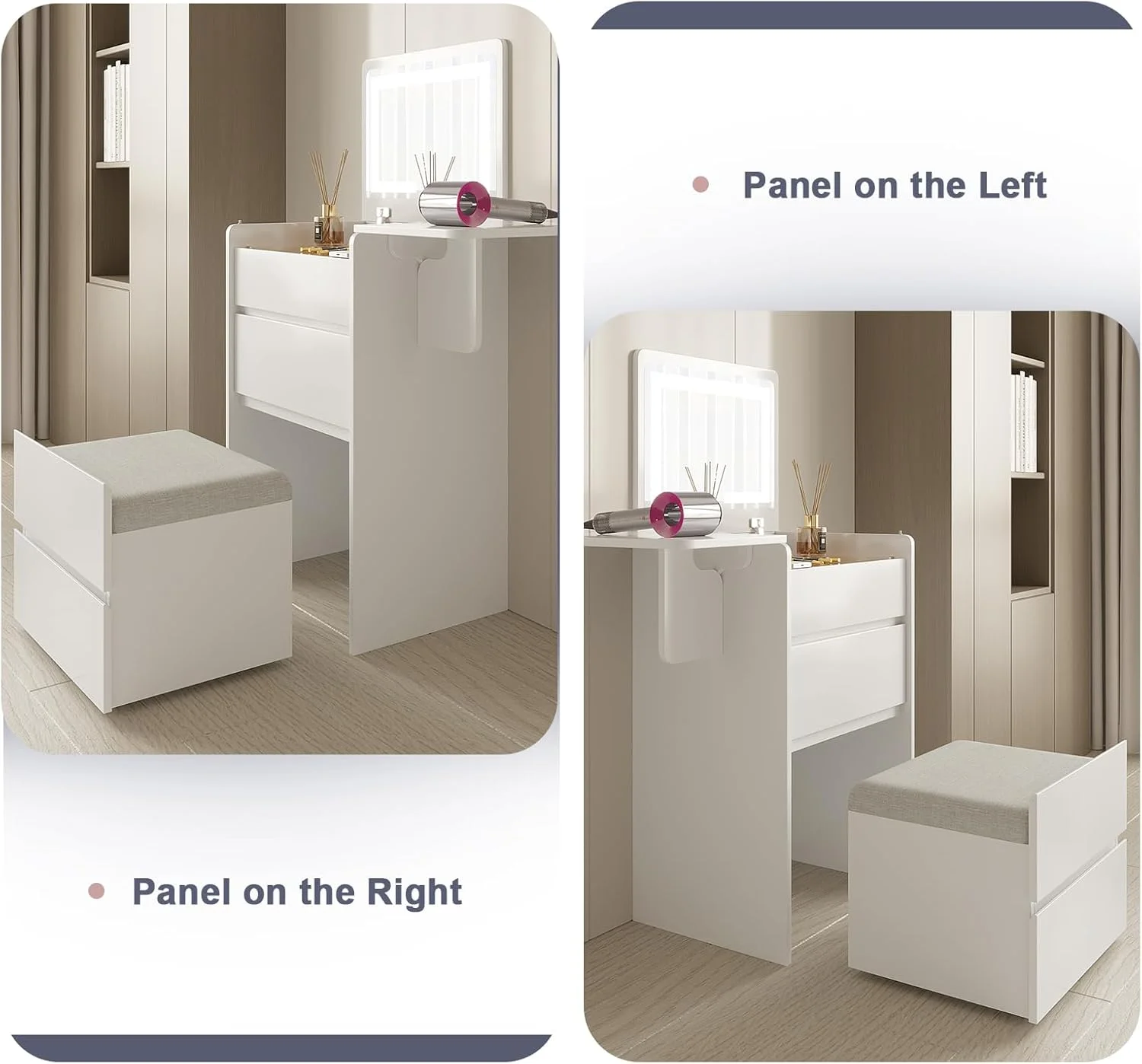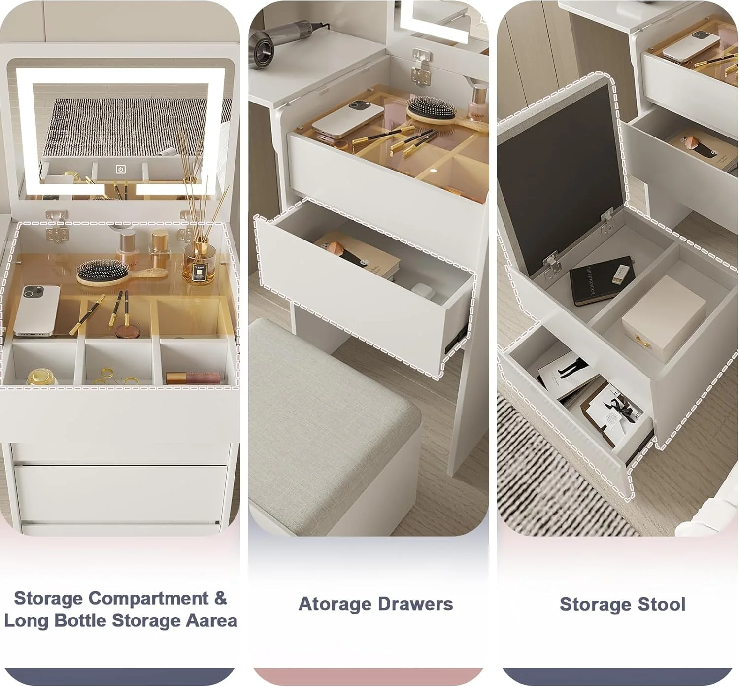 Compact Structure: Led mirror, Storage makeup stool, Fold-up panel, Storage drawers, Power strip