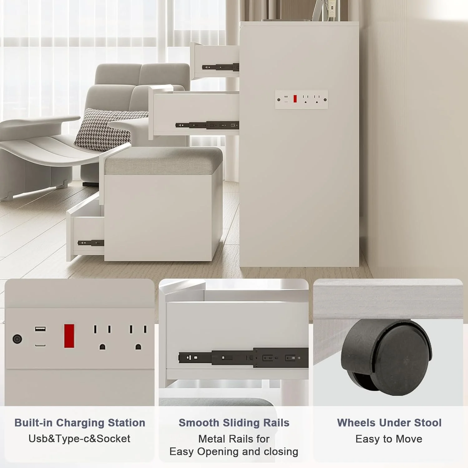 - ��Ample Storage Space��- Our makeup desk with drawers Containing 3 drawers, 2 drawer is in the desk and the other one is in the stool. When you flip top the chair, there is 1 more hidden storage space for you. All your cosmetic and makeup tools such as eye shadows, perfumes, brushes or jewelries have their places on this vanity desk and will be easy to reach out.