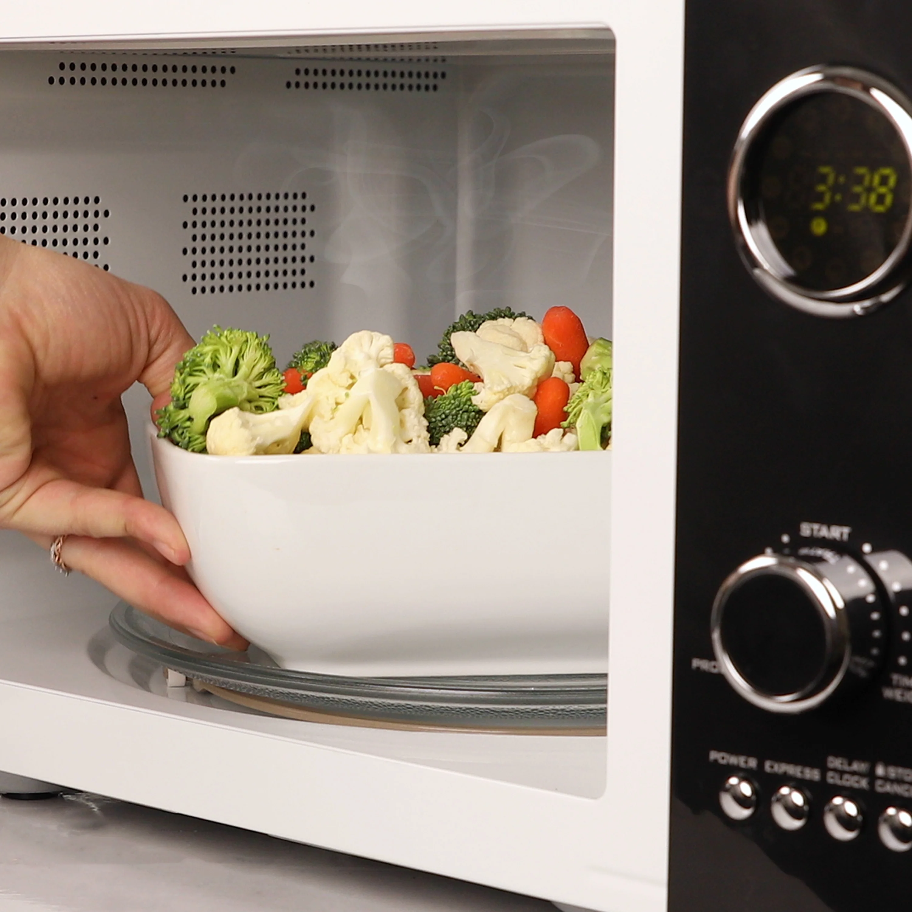 Choose your settings with just a turn of the dial. Our countertop microwave includes 12 pre-programmed cooking settings, a delayed timer, and express cooking controls. The easy-to-read LED display lights up its digital clock and highlights each cooking setting too.