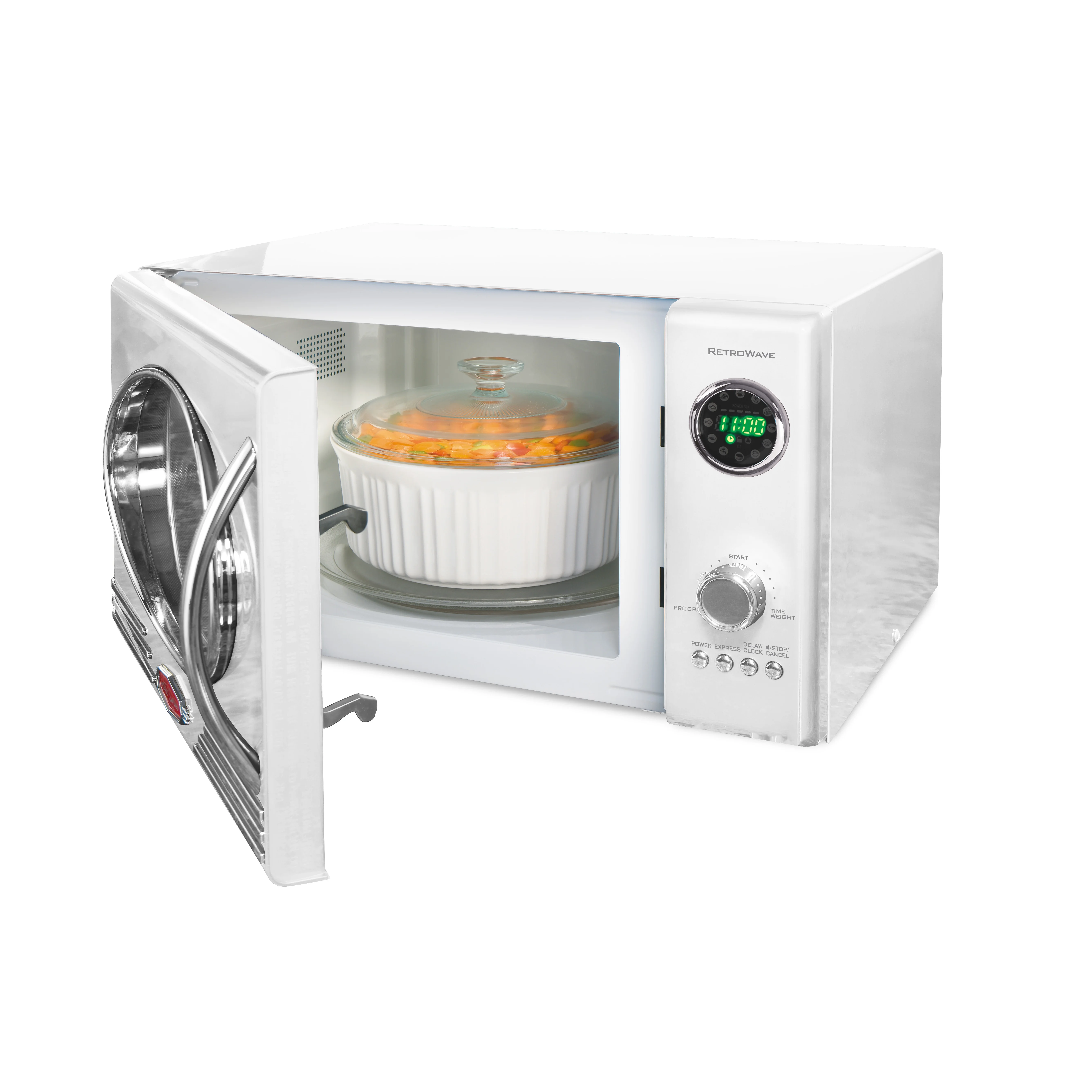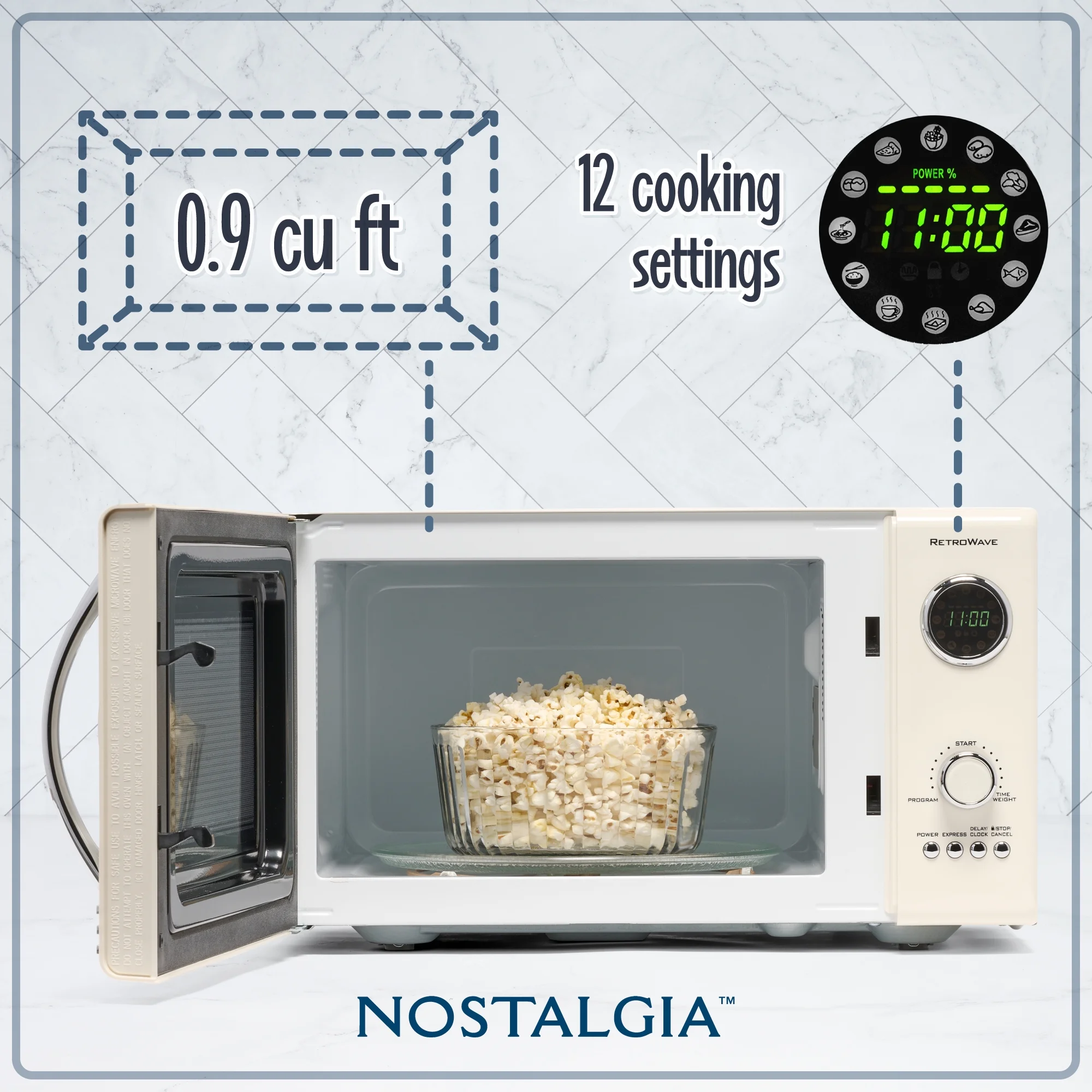 With this 0.9 cu ft, 800-watt microwave, you have the cooking power needed to quickly cook and reheat food. Let our vintage microwave conveniently defrost, heat, or cook your favorite food like popcorn, pizza, potatoes, veggies and more.