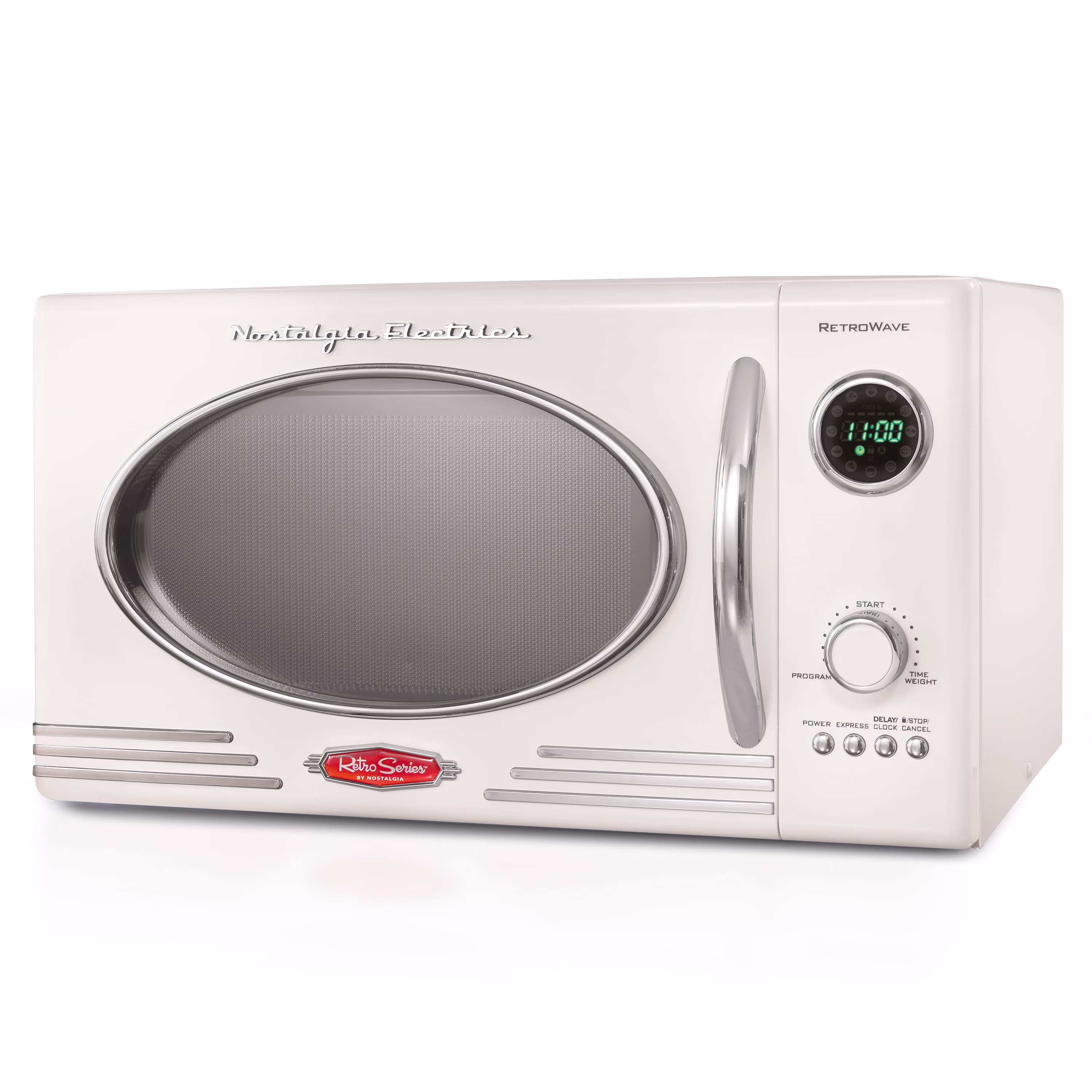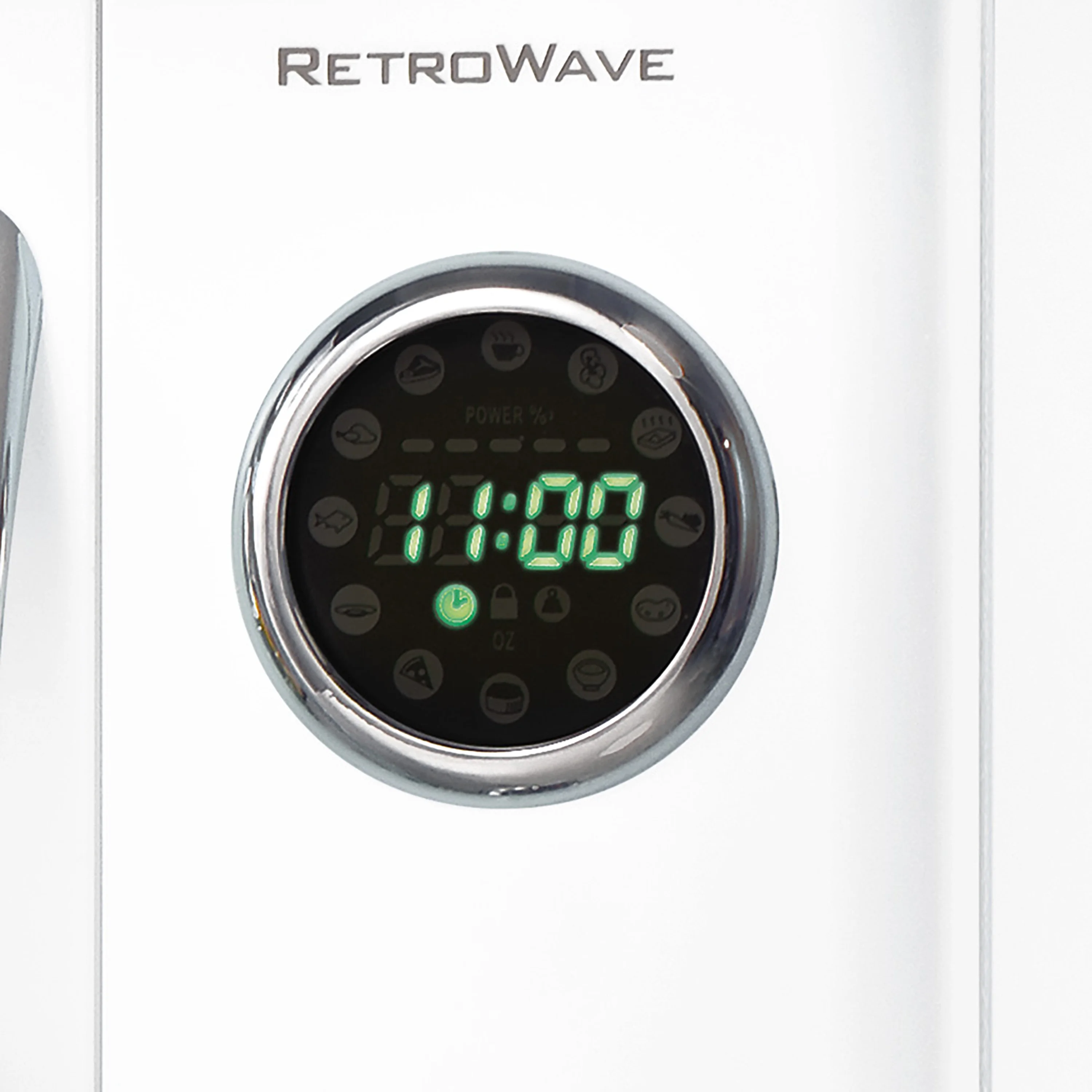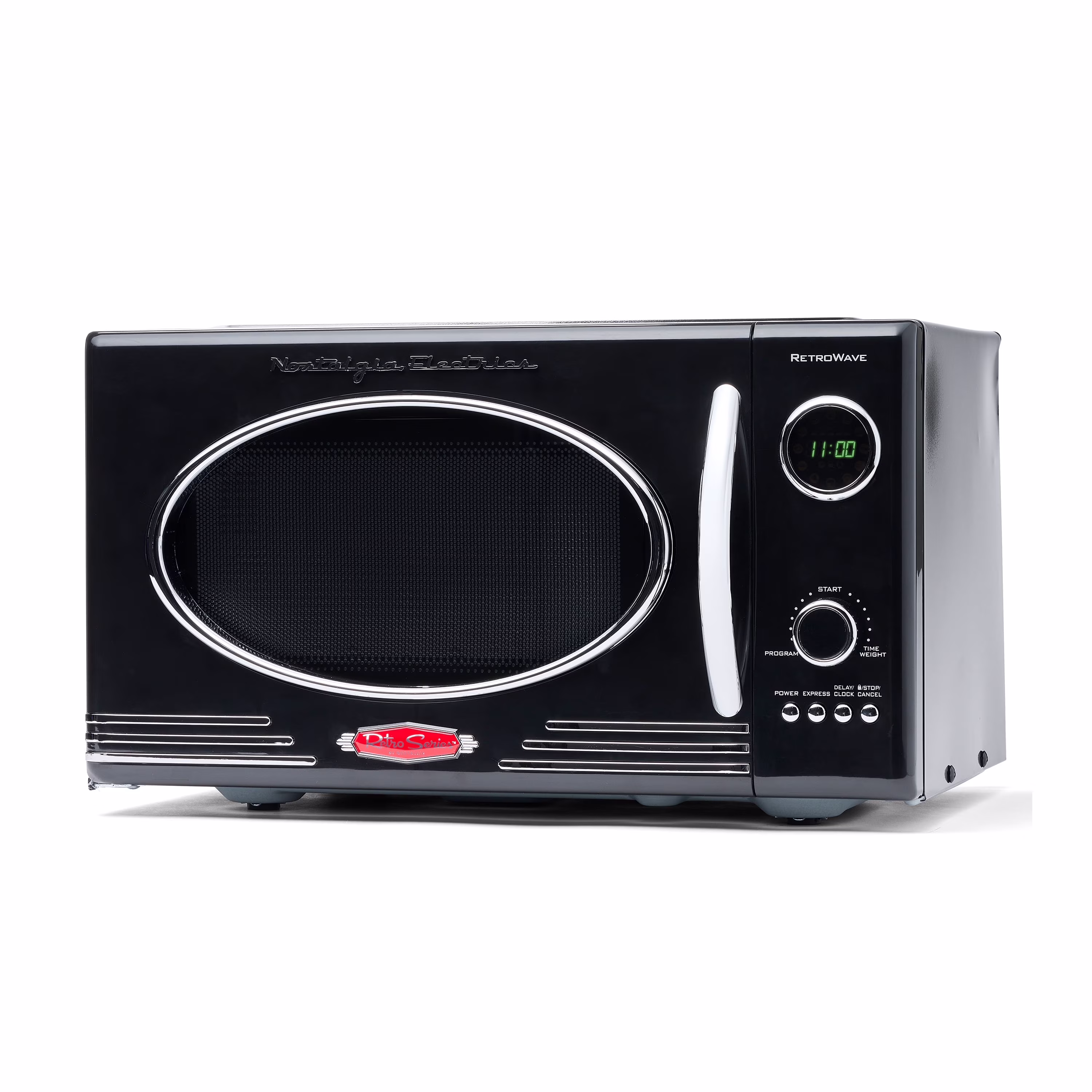 - RETRO ACCENTS: A sleek chrome door handle, control panel and accents add fun and flair to this unique retro-styled appliance