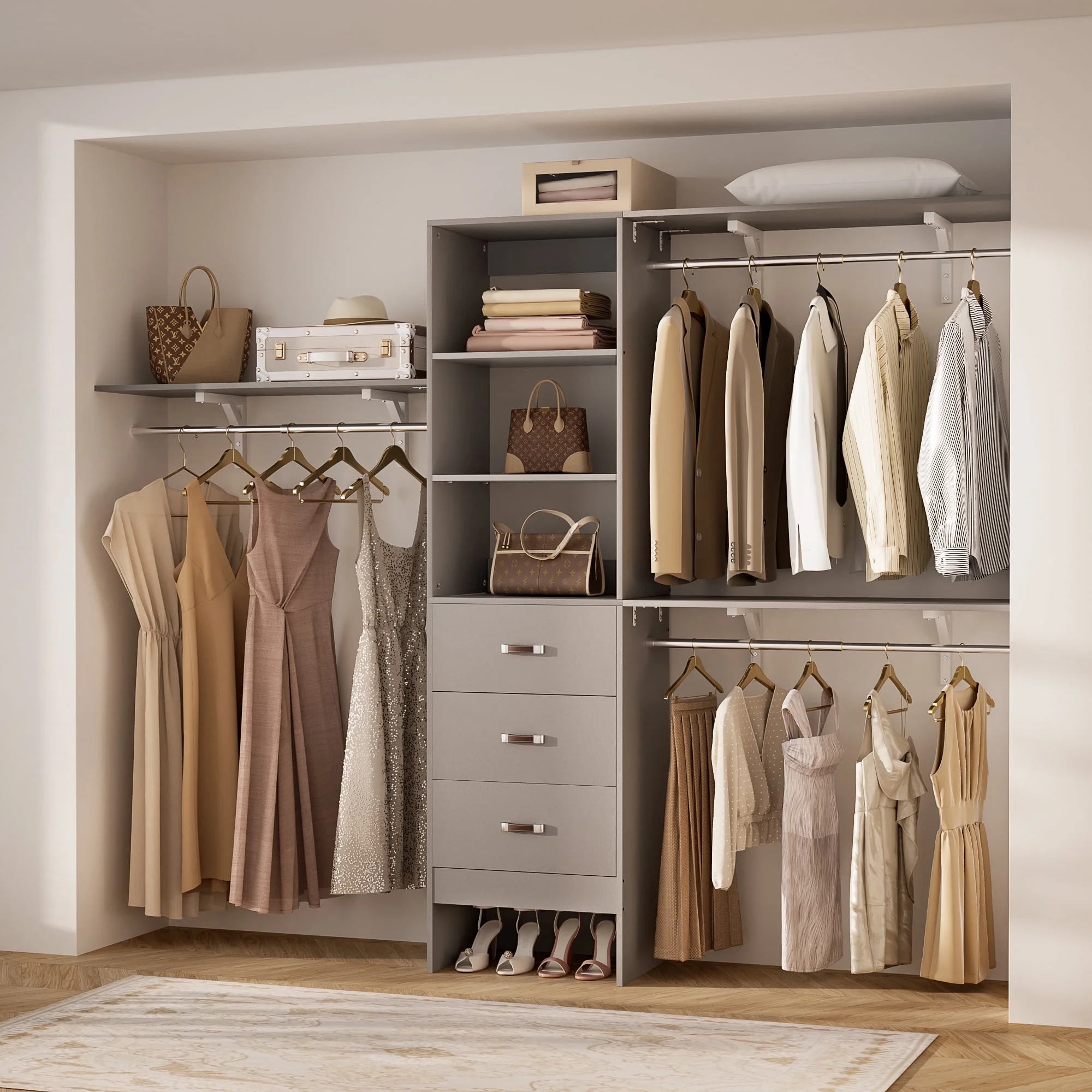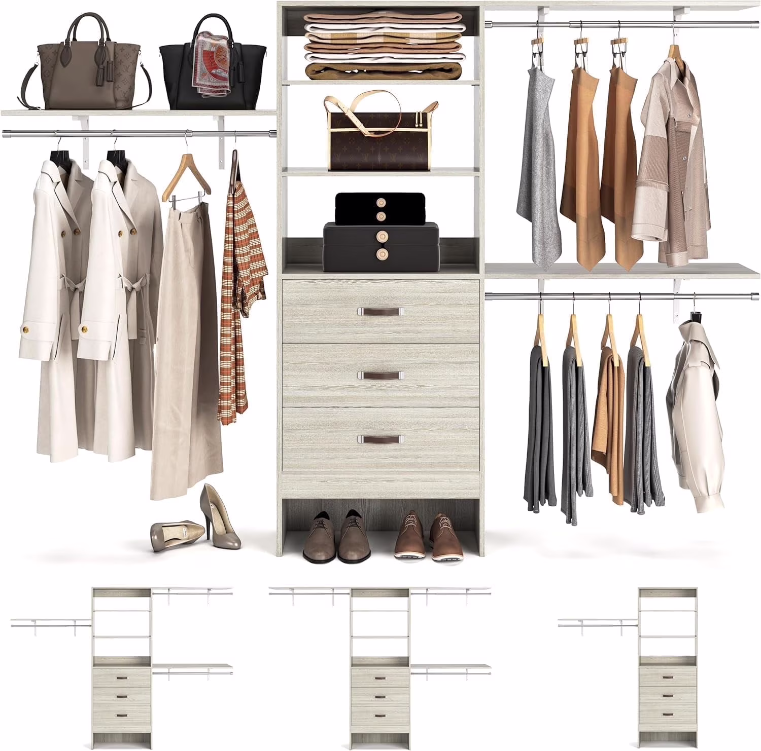 - All-in-one Multifunction Closet Rack - This 96'' wood closet organizer set comes with 3 shelf towers, 3 expandable rods, 3 big storage drawers and 3 interior shelves (5 height adjustable). It is a perfect home organization system for closet spaces to store shirts, pants, jackets, sweaters, shoes, decor or other items